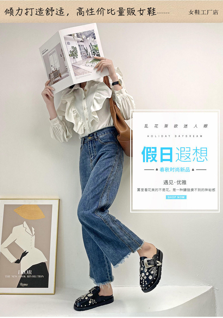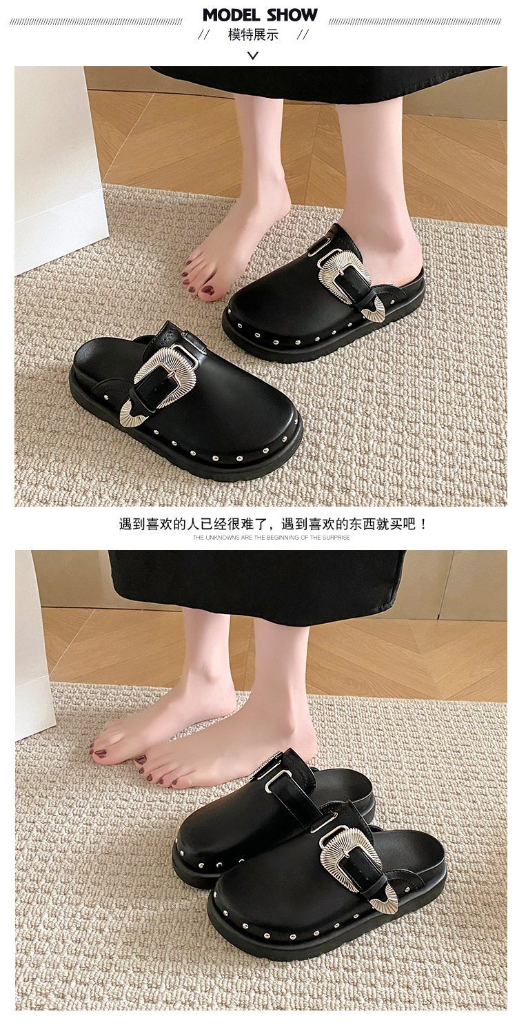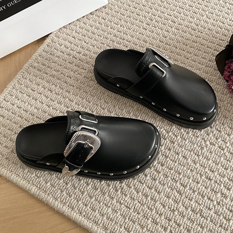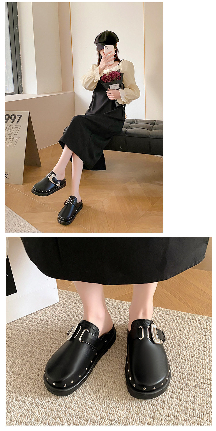 Internet Celebrous Same Shoes with Toe Half-tow Women's 2024 New British Retro Thick Bottom Rivet Flat Mule Shoes