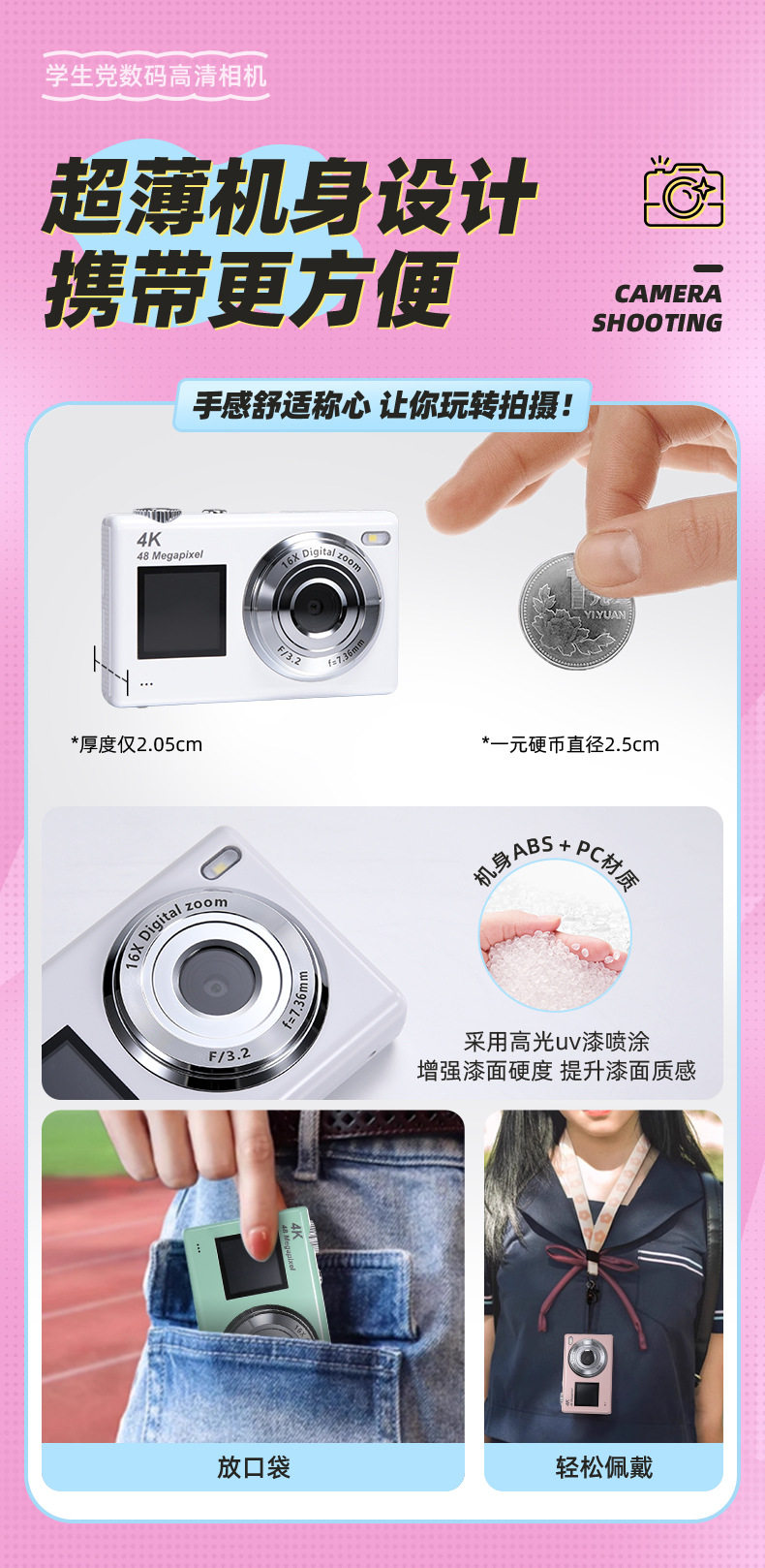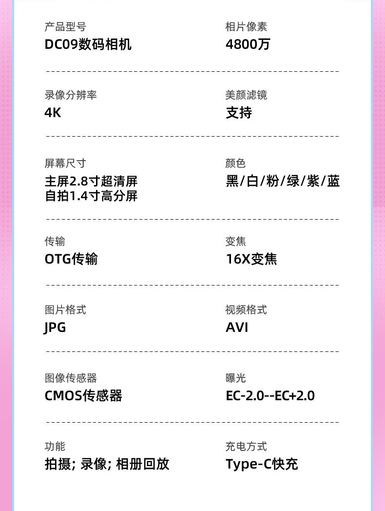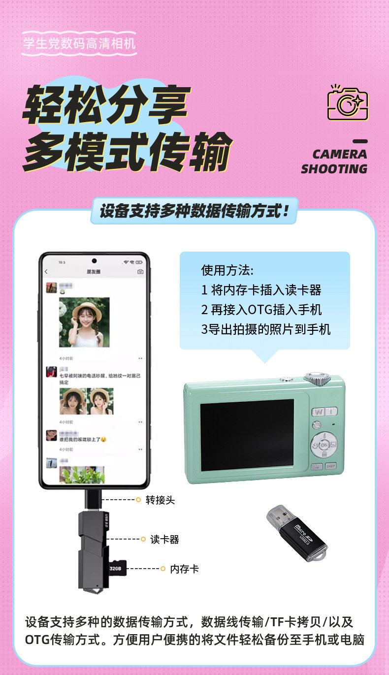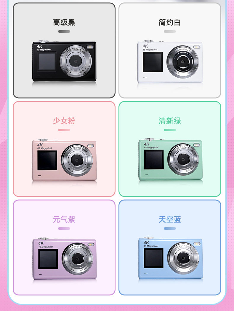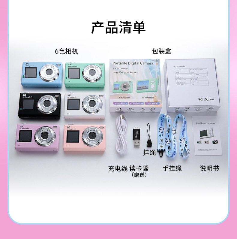 | Body color | Standard black (including card reader + lanyard + data cable),Standard white (including card reader + lanyard + data cable),Standard green (including card reader + lanyard + data cable),Standard pink (including card reader + lanyard + data cable),Standard blue (including card reader + lanyard + data cable),Standard purple (including card reader + lanyard + data cable),High-end black (including card reader + lanyard + data cable) + 32g memory card,High-end white (including card reader + lanyard + data cable) + 32g memory card,High-end green (including card reader + lanyard + data cable) + 32g memory card,High-end pink (including card reader + lanyard + data cable) + 32g memory card,High-end blue (including card reader + lanyard + data cable) + 32g memory card,High-end purple (including card reader + lanyard + data cable) + 32g memory card |