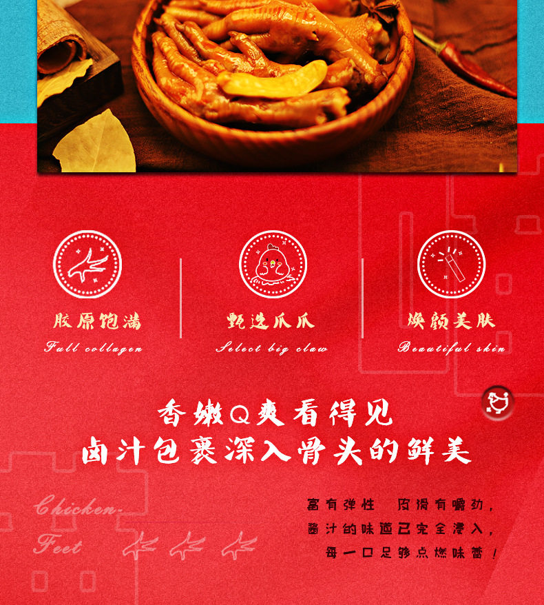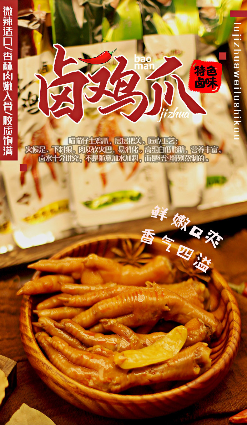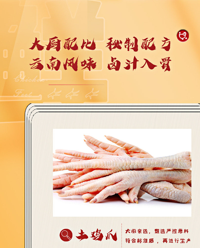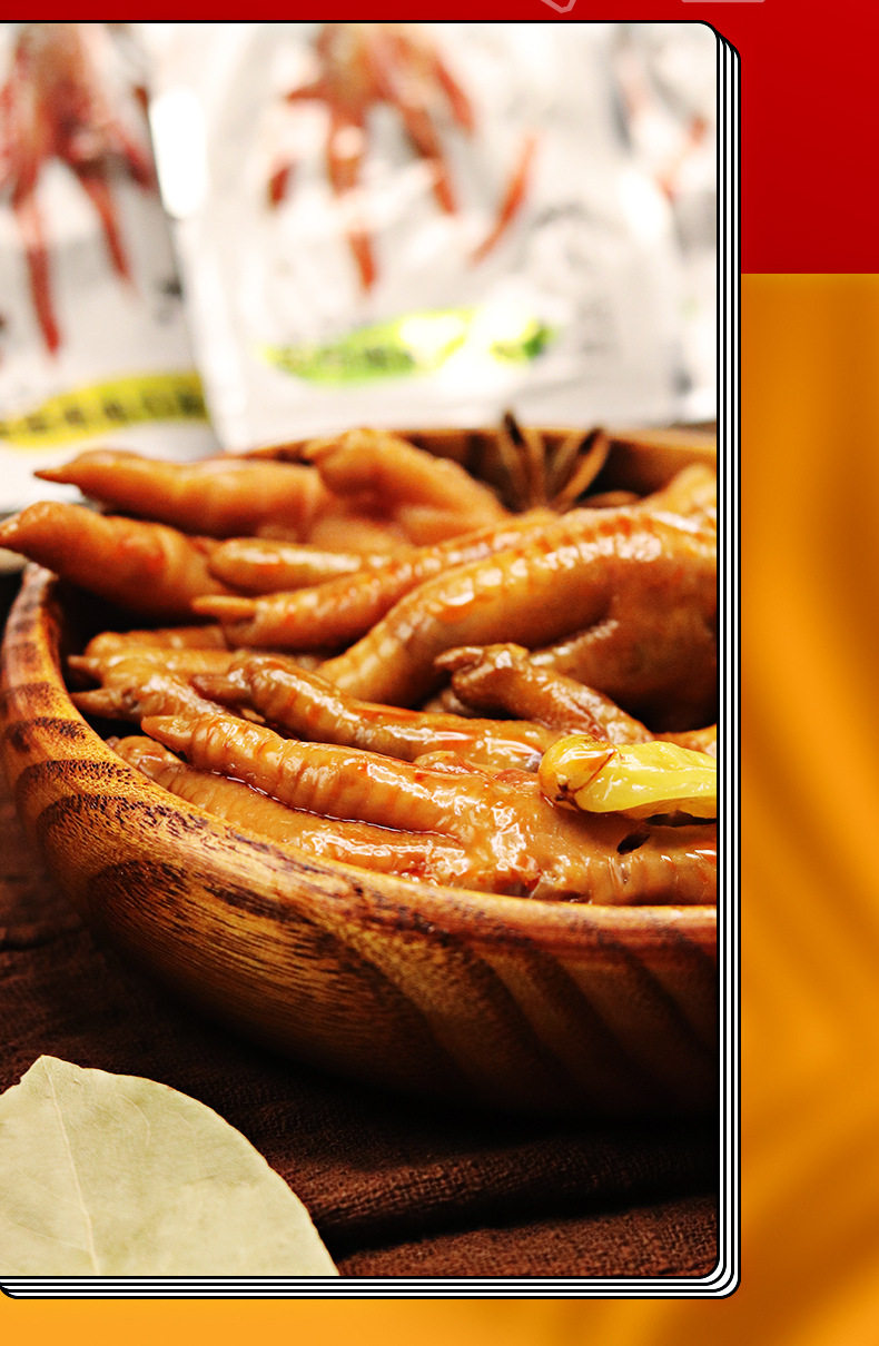 | Raw materials and ingredients | Chicken feet, drinking water, pepper, chili peppers, cumin, sichuan peppercorns, salt, white sugar, spices |