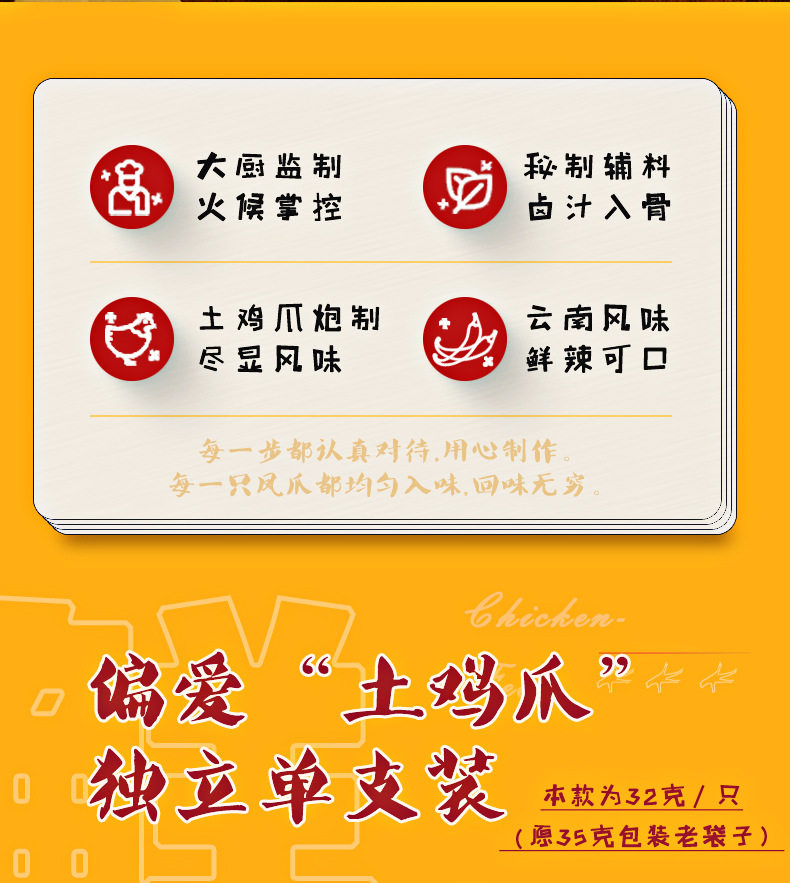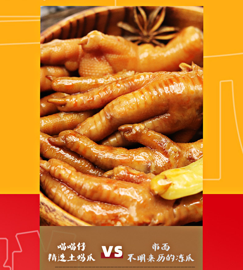 | Packaging specifications | 32g micro-brine chicken feet [buy ten and get ten free],32g micro-brine chicken feet [pack of thirty],35g wild pepper chicken feet [buy ten and get ten free],35g wild pepper chicken feet [thirty pieces],Pickled pepper micro-braised soil chicken feet [mix and match ten flavors each],Pickled pepper slightly braised soil chicken feet [five pieces each of mixed and matched flavors] |