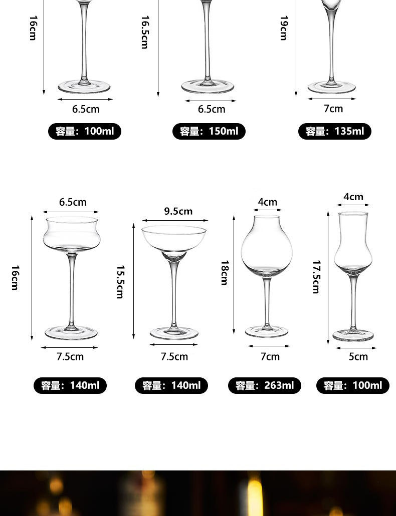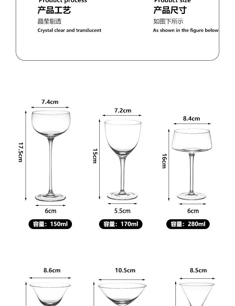 | Color | 102 flat,H150 small wine glass,161 flat,H16 Martini,H165 Shallow Martini,H19 Cocktail Cup,H16 Classical Martini,103 Cocktail Glass,0418 Taper Belly,175 smell cup |