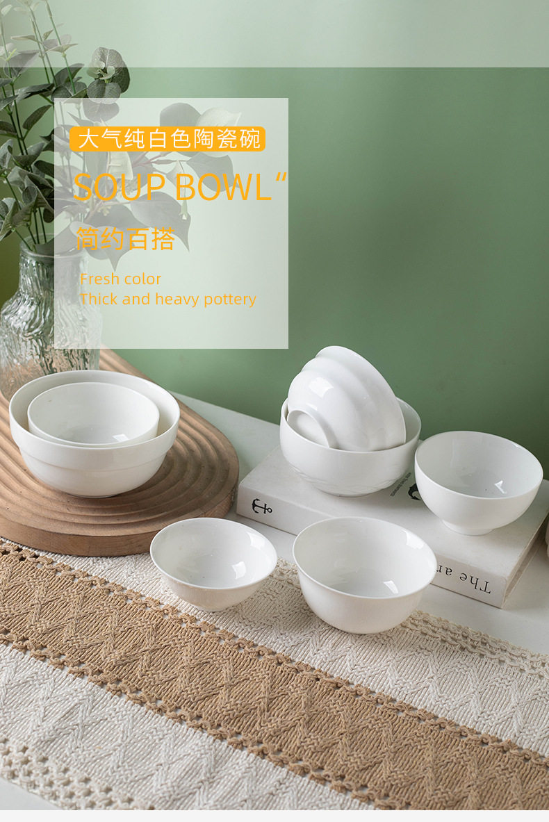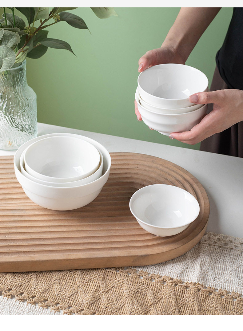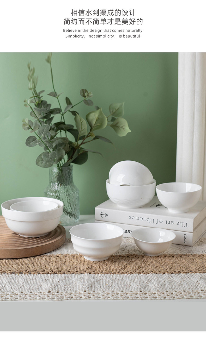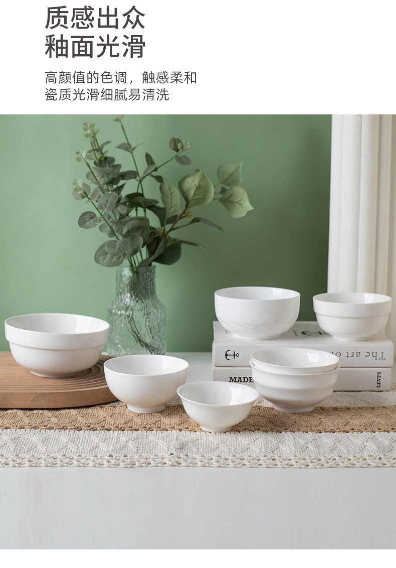 Simple Rice Soup Bowl Set for Home Use, Japanese-Style Pure White High-Temperature Resistant Ceramic Bowls