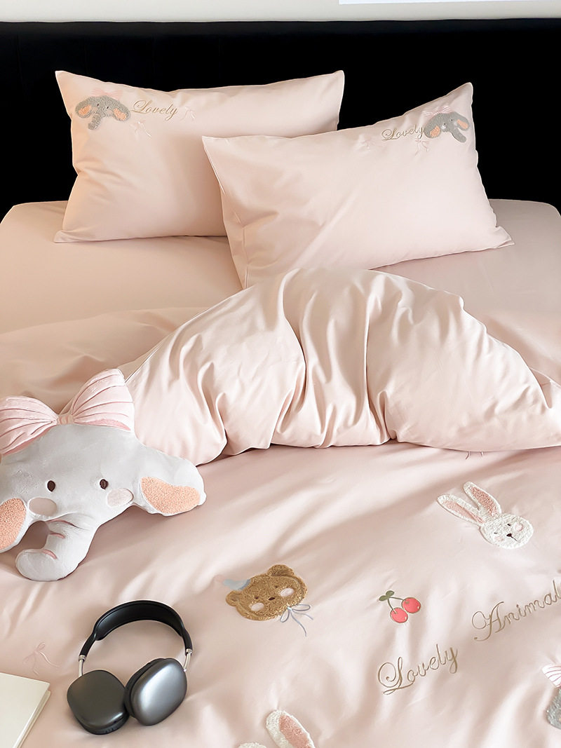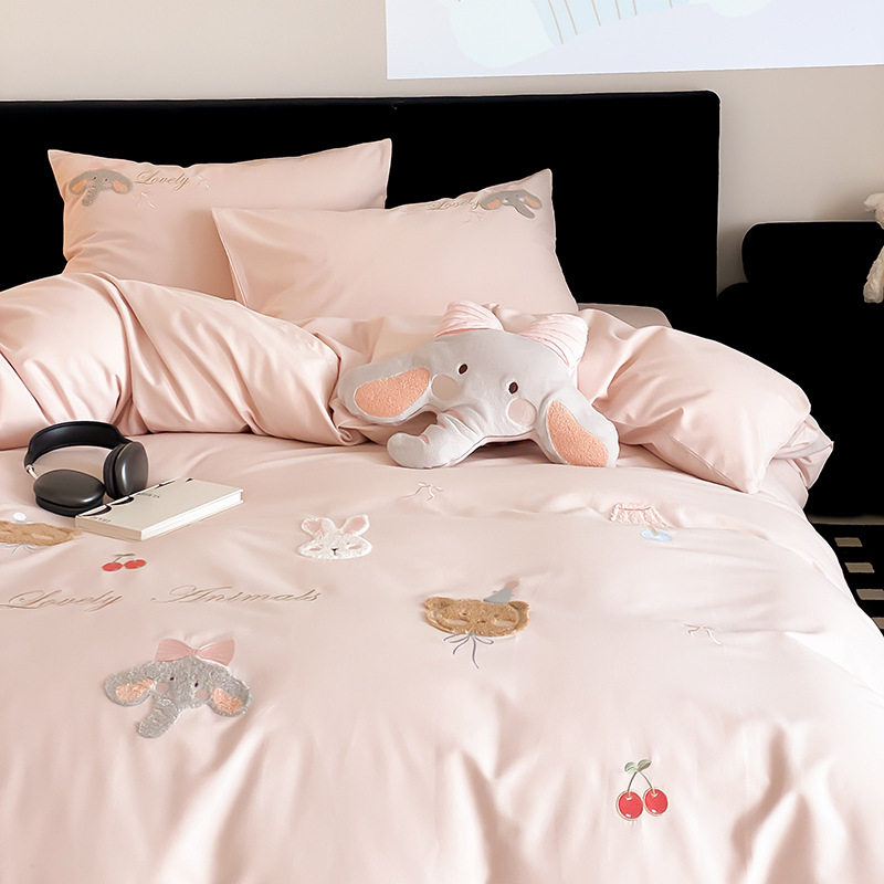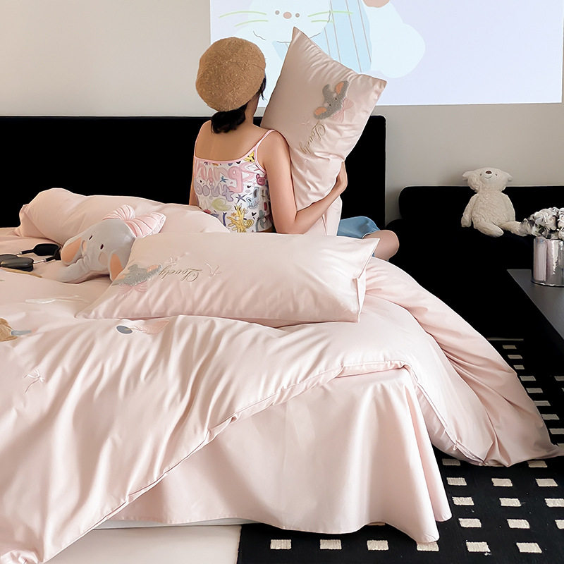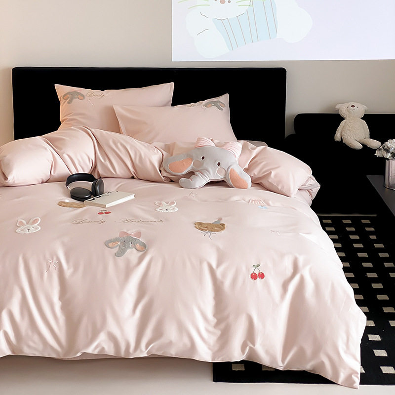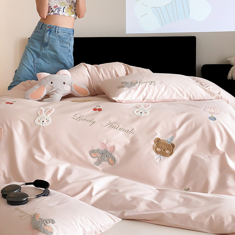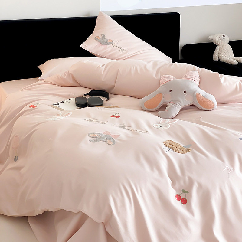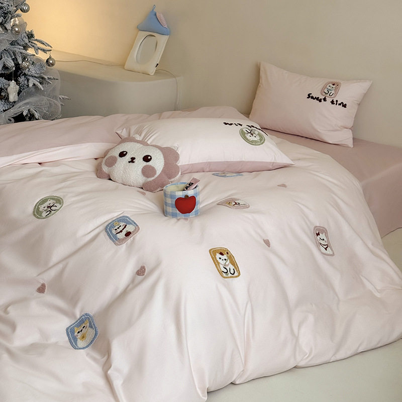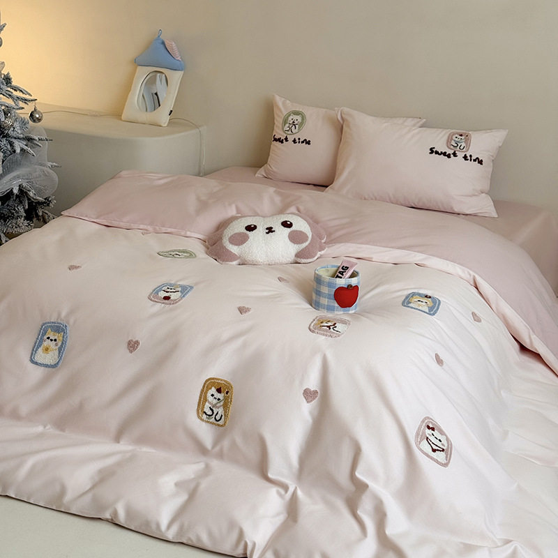High-End All-Cotton Long-Staple Cotton Brushed Four-Piece Set, Girly Pink Fresh Style Duvet Cover, Cartoon Cute Design for All Seasons