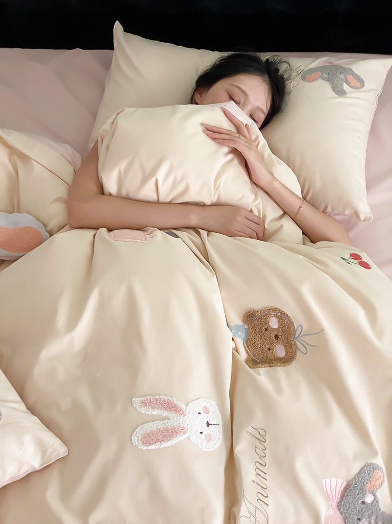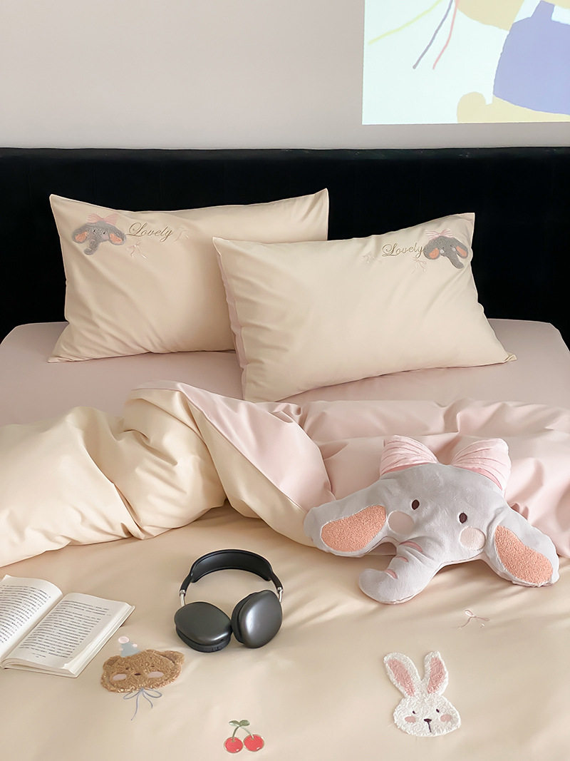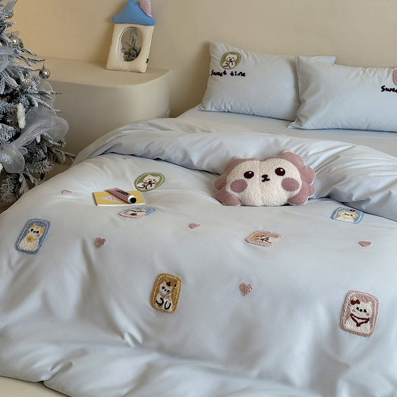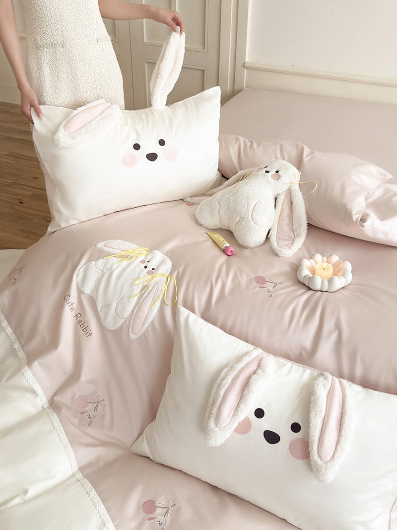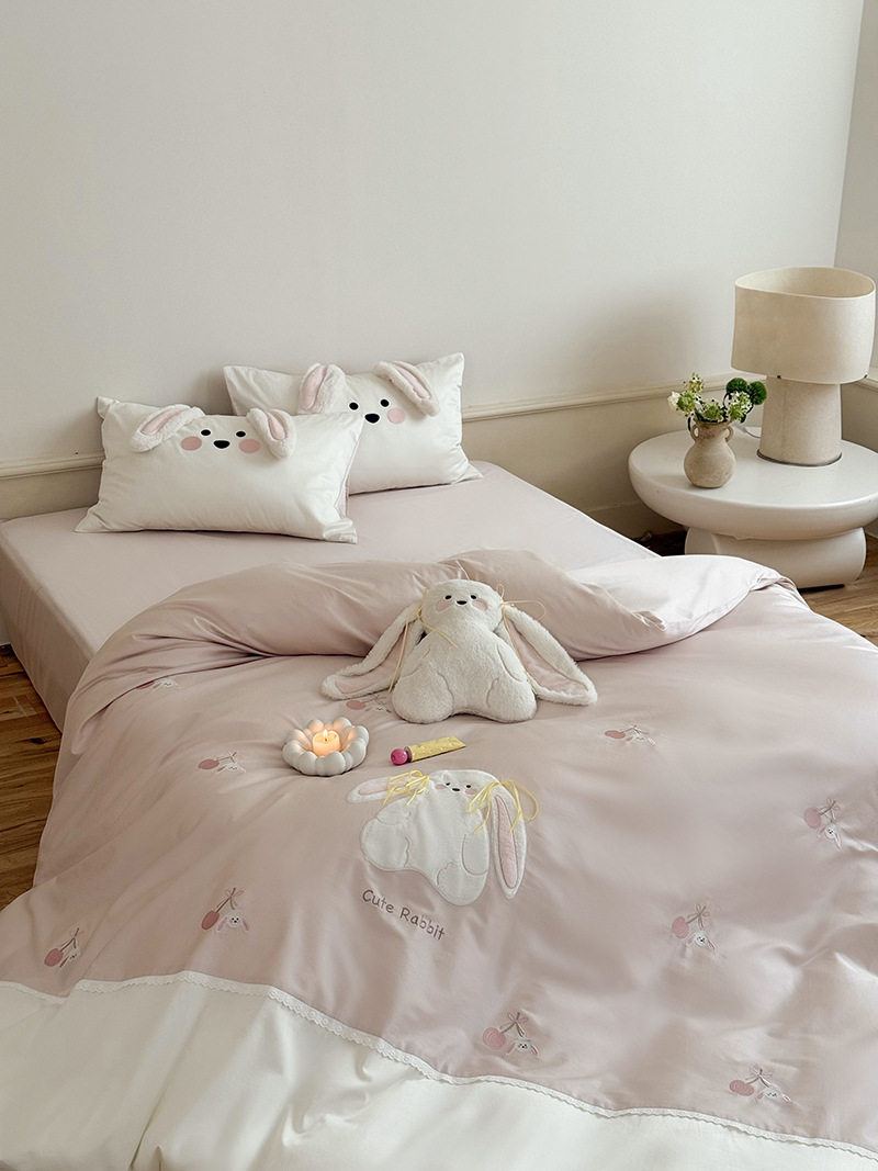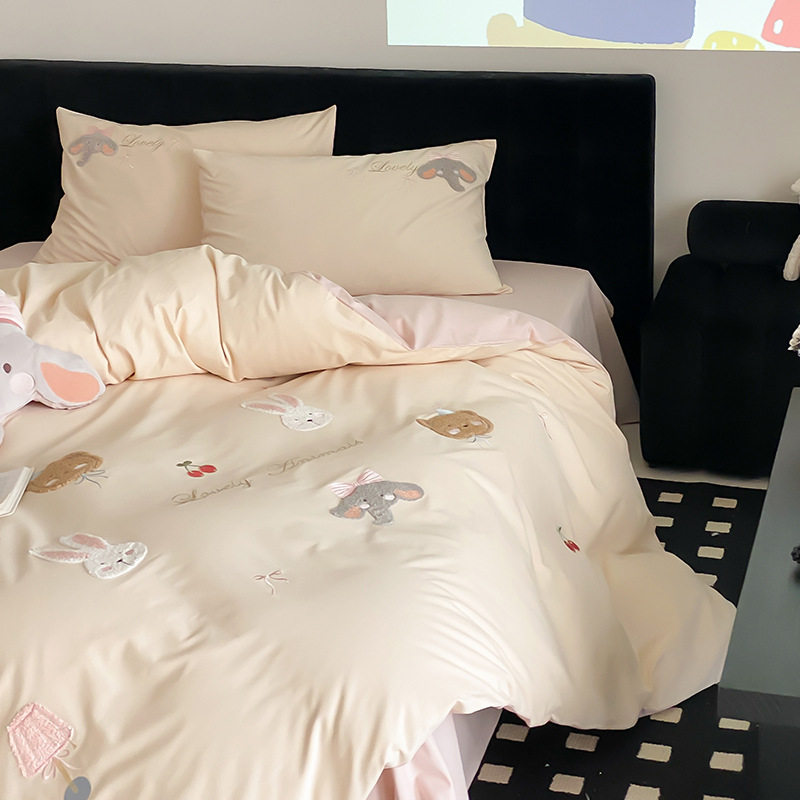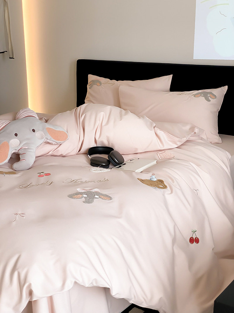 High-End All-Cotton Long-Staple Cotton Brushed Four-Piece Set, Girly Pink Fresh Style Duvet Cover, Cartoon Cute Design for All Seasons