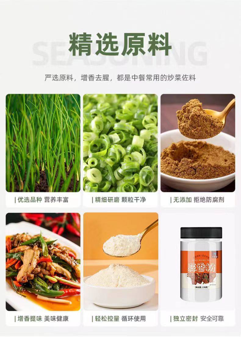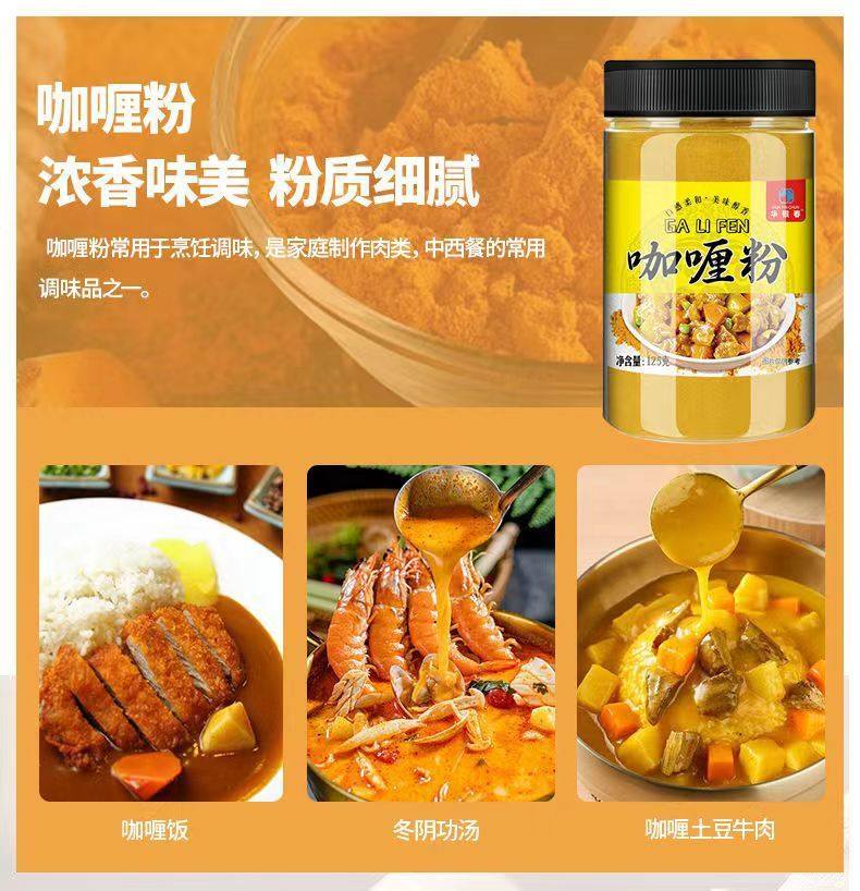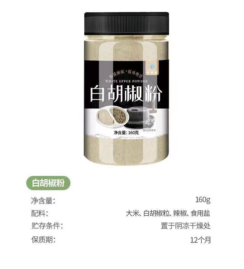 | Specification | [seasoning and flavoring] white pepper powder 160g/can,[rich garlic flavor] garlic powder 130g/can,[strong and delicious] curry powder 125g/can,[full of ginger flavor] five-spice salt and pepper powder 200g/can |