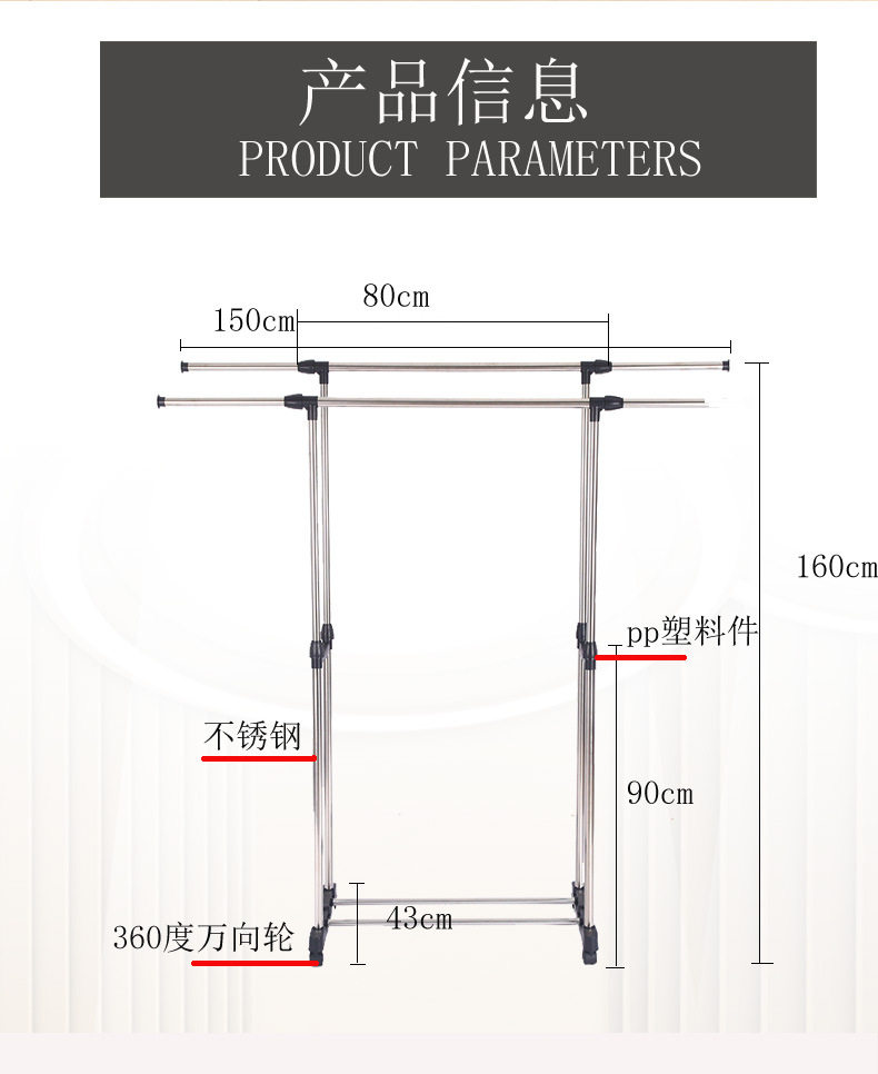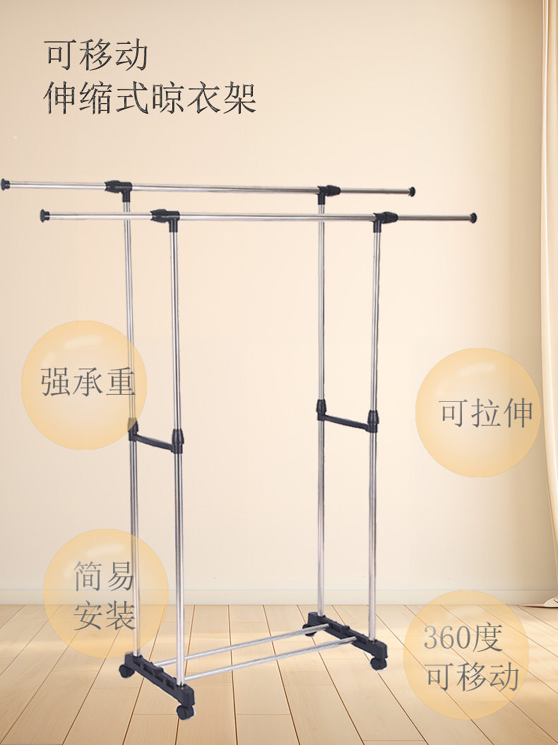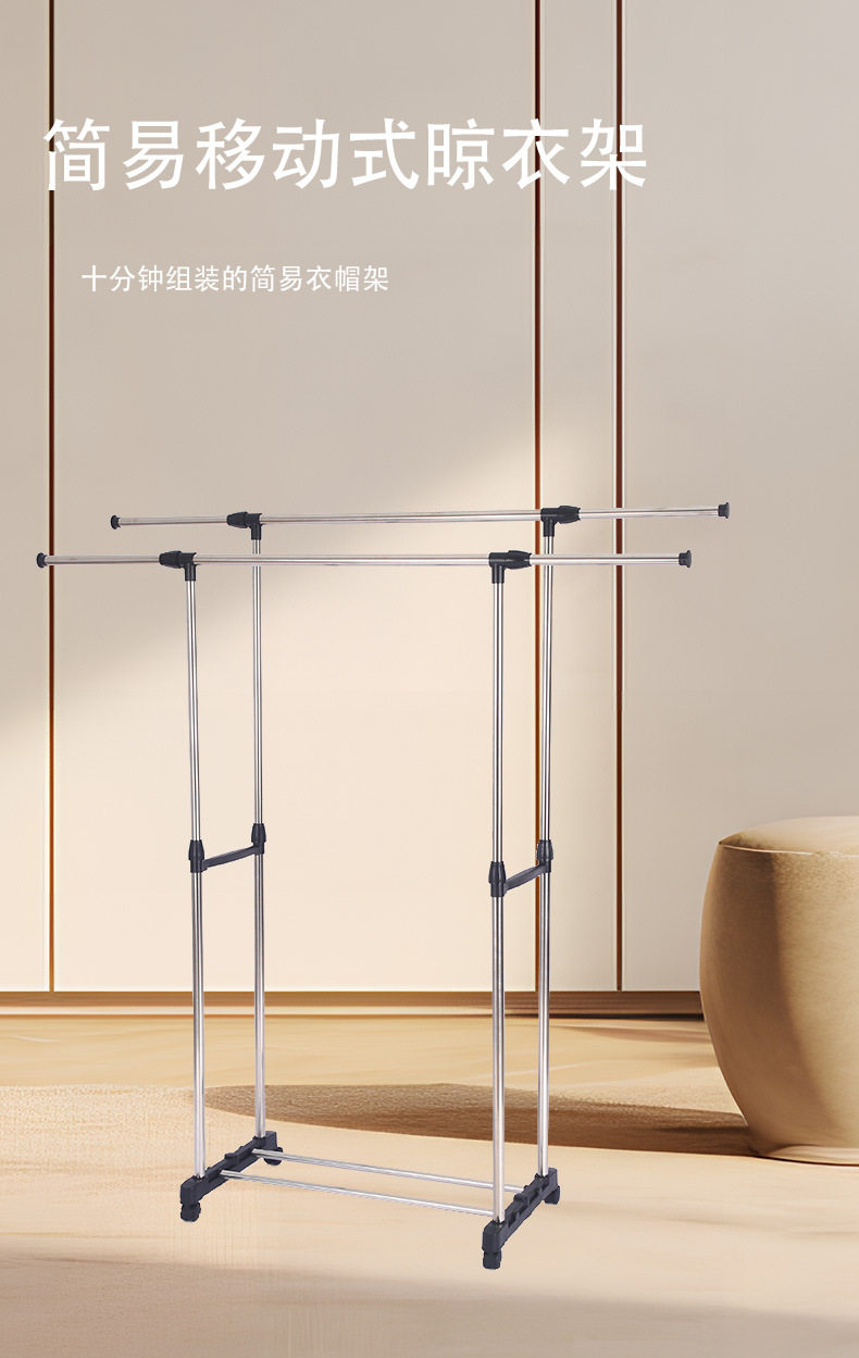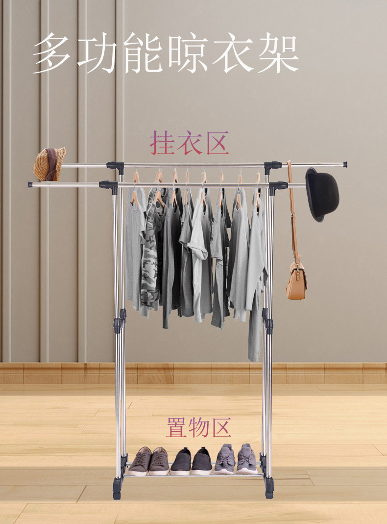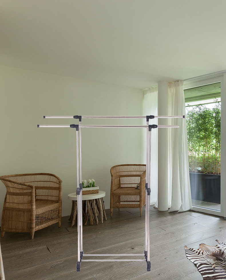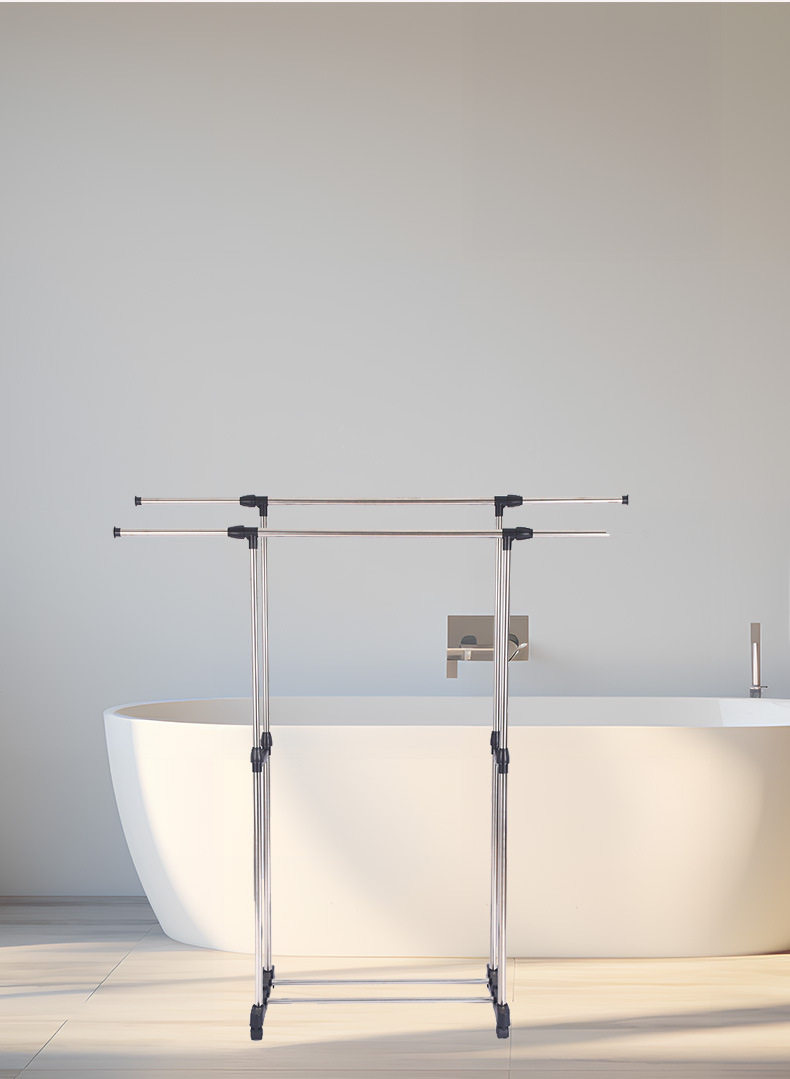 Stainless Steel Double-Pole Adjustable Floor-Standing Clothes Drying Rack, Telescopic Clothes Rack, Mobile Storage Rack, Double-Pole Clothes Drying Rack
