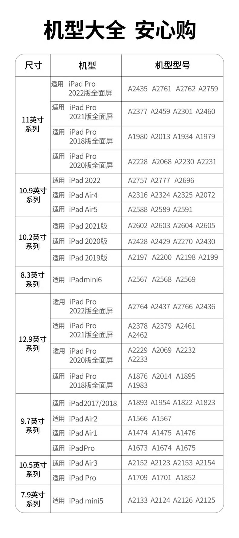 | Applicable models | Applicable to ipad11 25 version ( 11inch ),Applicable to ipad10 23rd version/22 version( 10.9inch ),Applicable to ipad9/8/7 21/20/19 version ( 10.2inch ),Applicable to ipad6/5 18/17 version( 9.7inch ),For ipad air7/air6 ( 11inch ),For ipad air7/air6 ( 13inch ),For ipad air5/air4( 10.9inch ),Compatible with ipad air3 (10.5inch ),Applicable to ipad air2/air1( 9.7inch ),Applicable to ipad pro 24 version ( 11inch ),Applicable to ipad pro 24 version ( 13inch ),Applicable to ipad pro 20/21/22 version/18 version ( 12.9inch ),Applicable to ipad pro 20/21/22 version/18 version ( 11inch ),Compatible with ipad pro ( 10.5inch ),Compatible with ipad pro ( 9.7inch ),For ipad mini7/mini6( 8.3inch ) |
