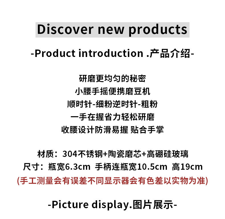 | Specification | 304 steel hand grinder [black],304 steel hand grinder [white],304 steel hand grinder [coffee color],304 steel hand grinder [wood grain] |