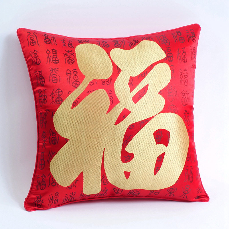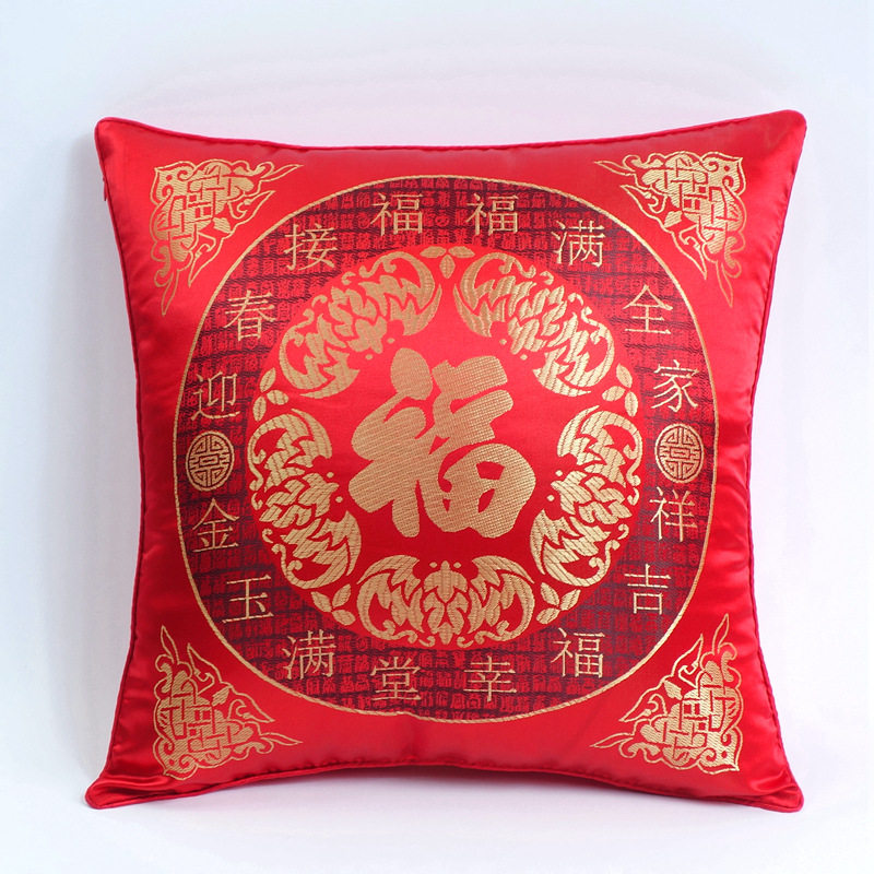 Chinese-Style Festive Pillowcase with the Character for Blessing, Spring Festival, New Year, Without Filling, Square, Chinese-Style, Red Silk Satin Cushion Cover
