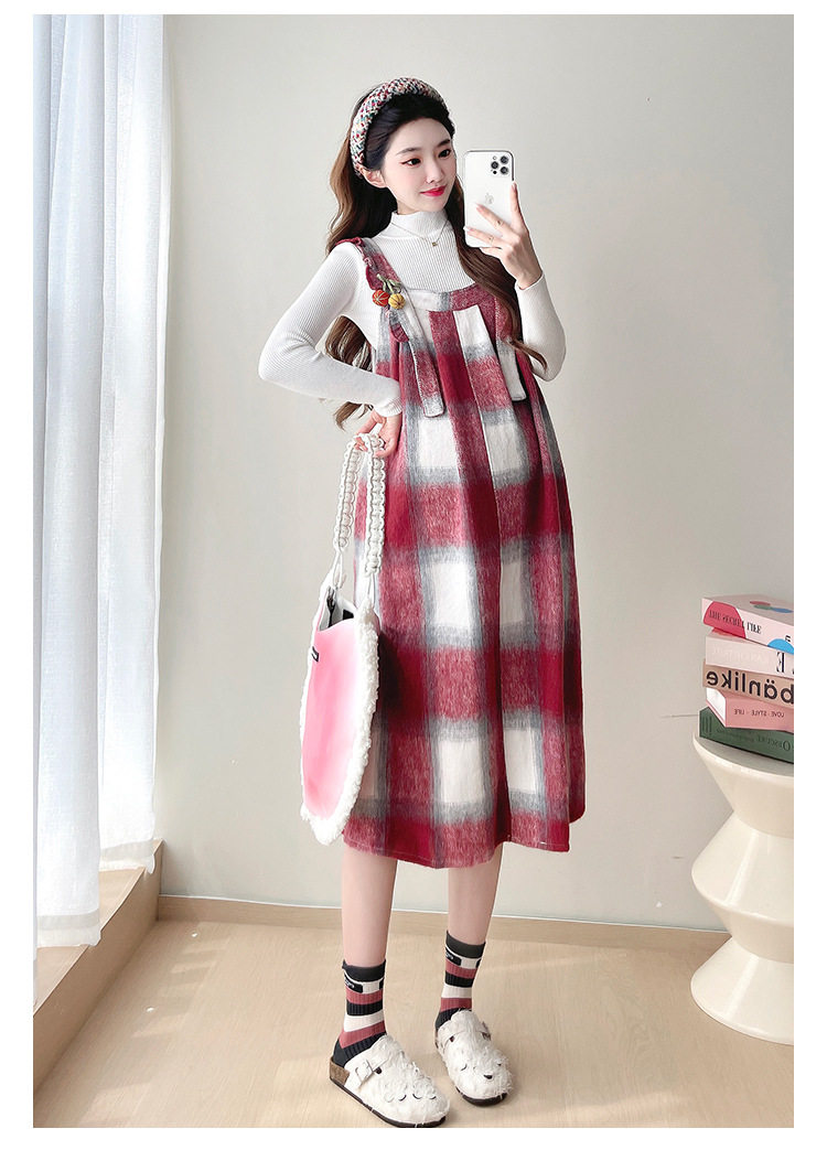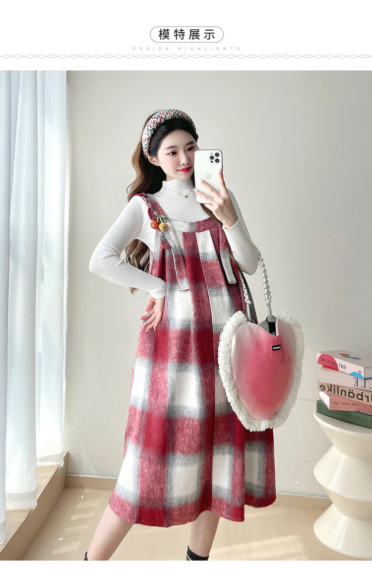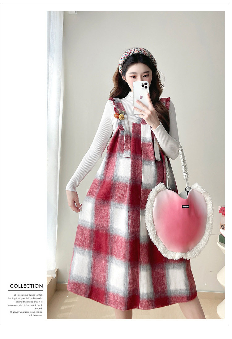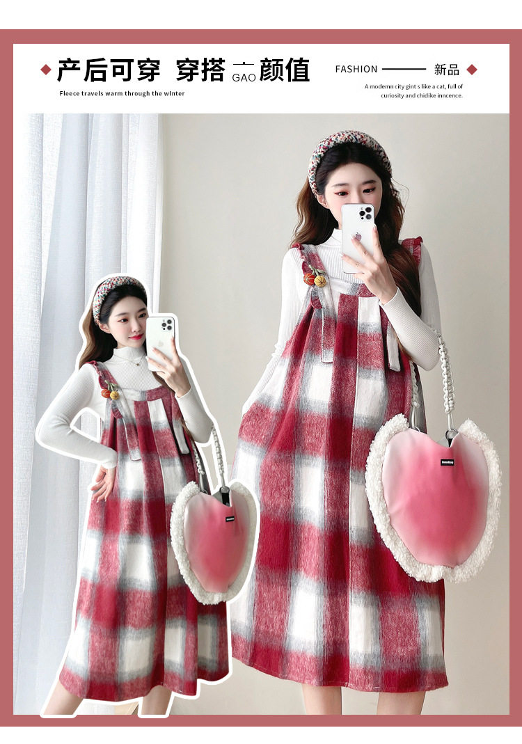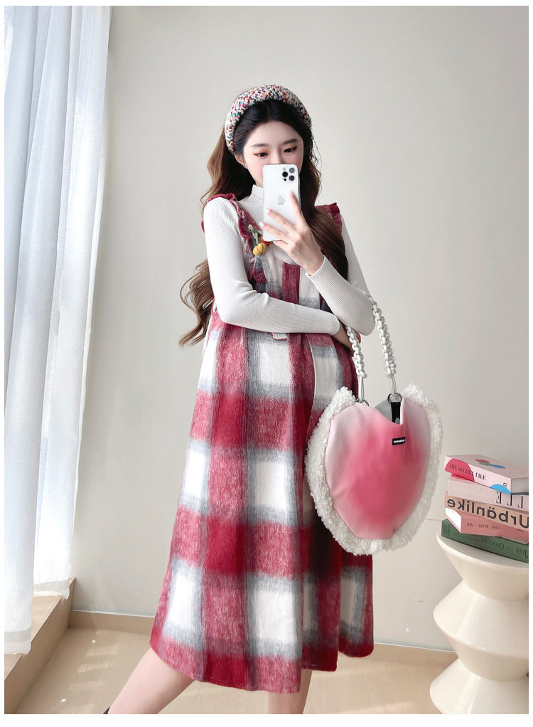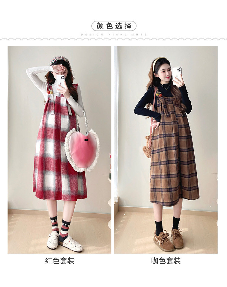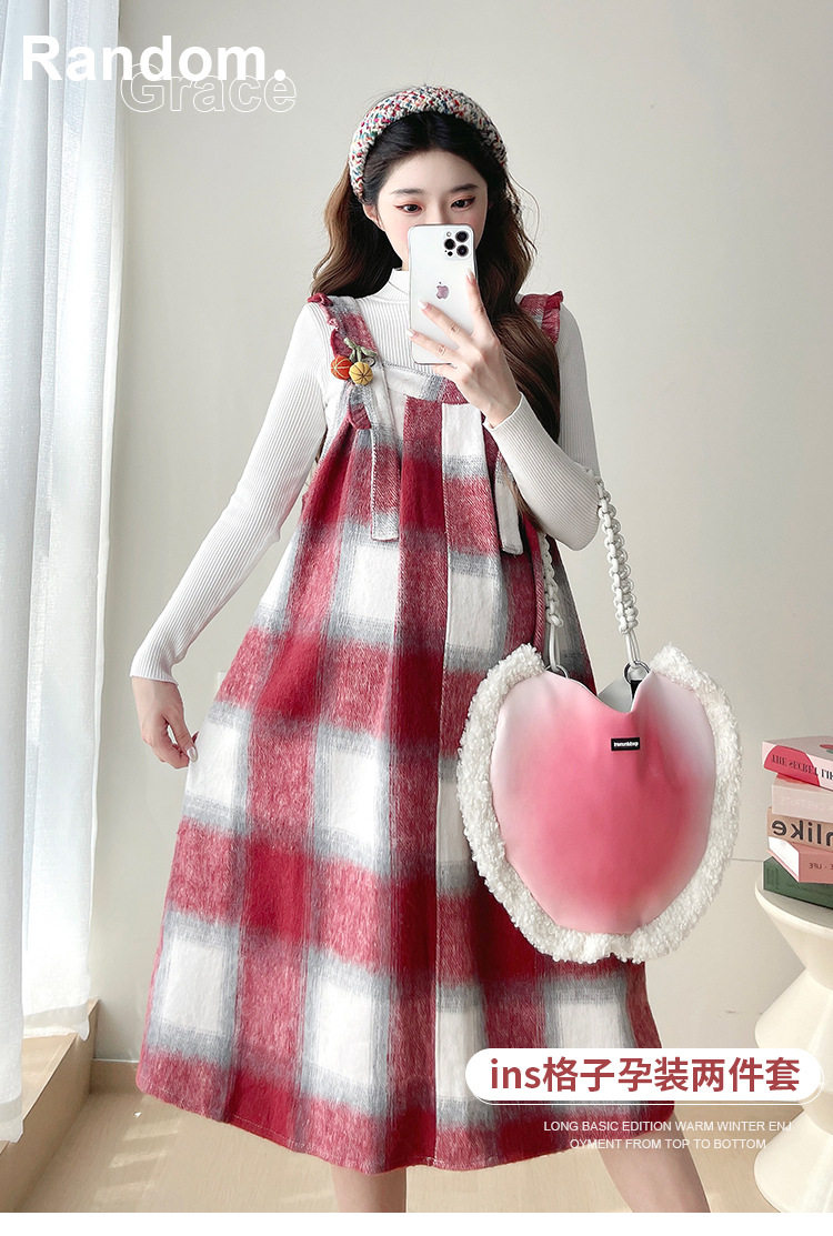 Maternity 2024 Autumn and Winter New Sweet All-match Plaid Woolen Vest Base Knitted dress Two-piece Set