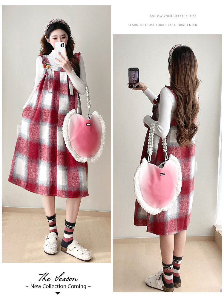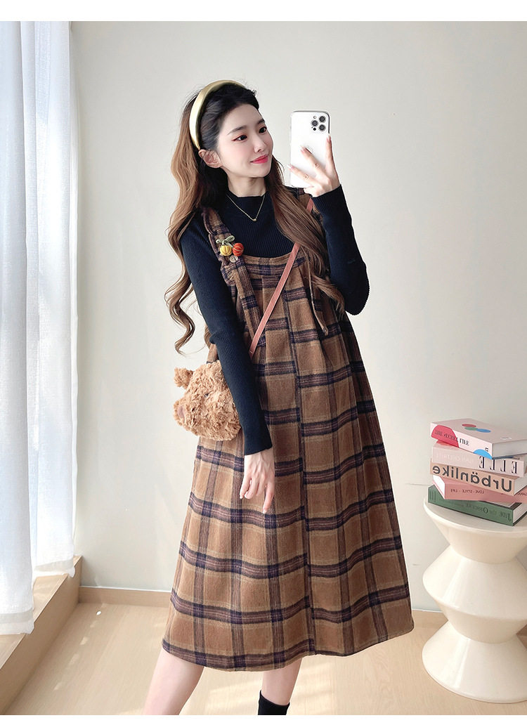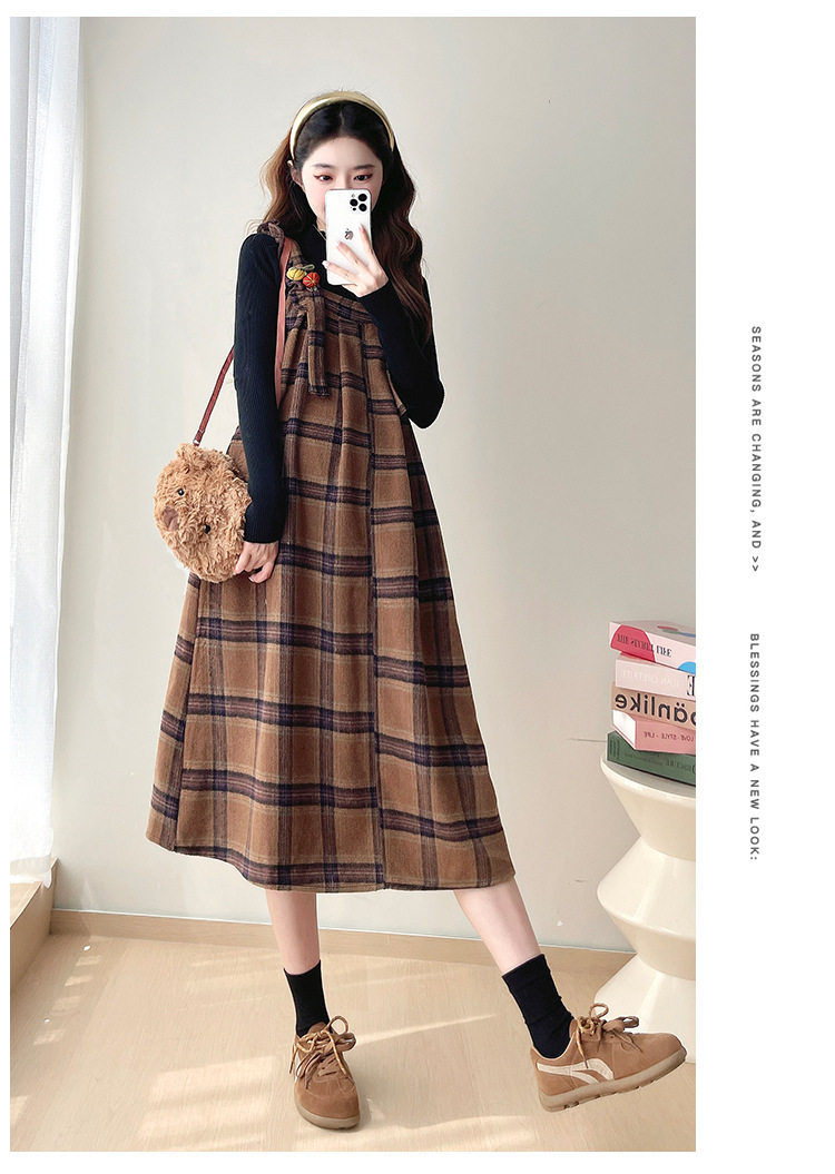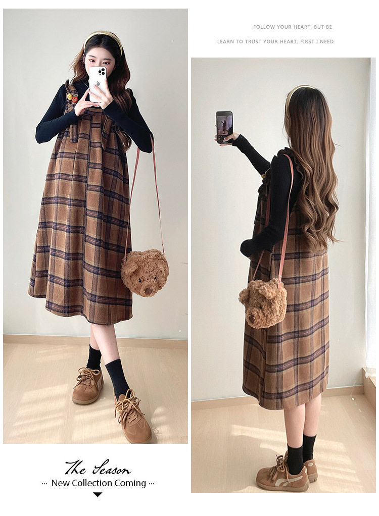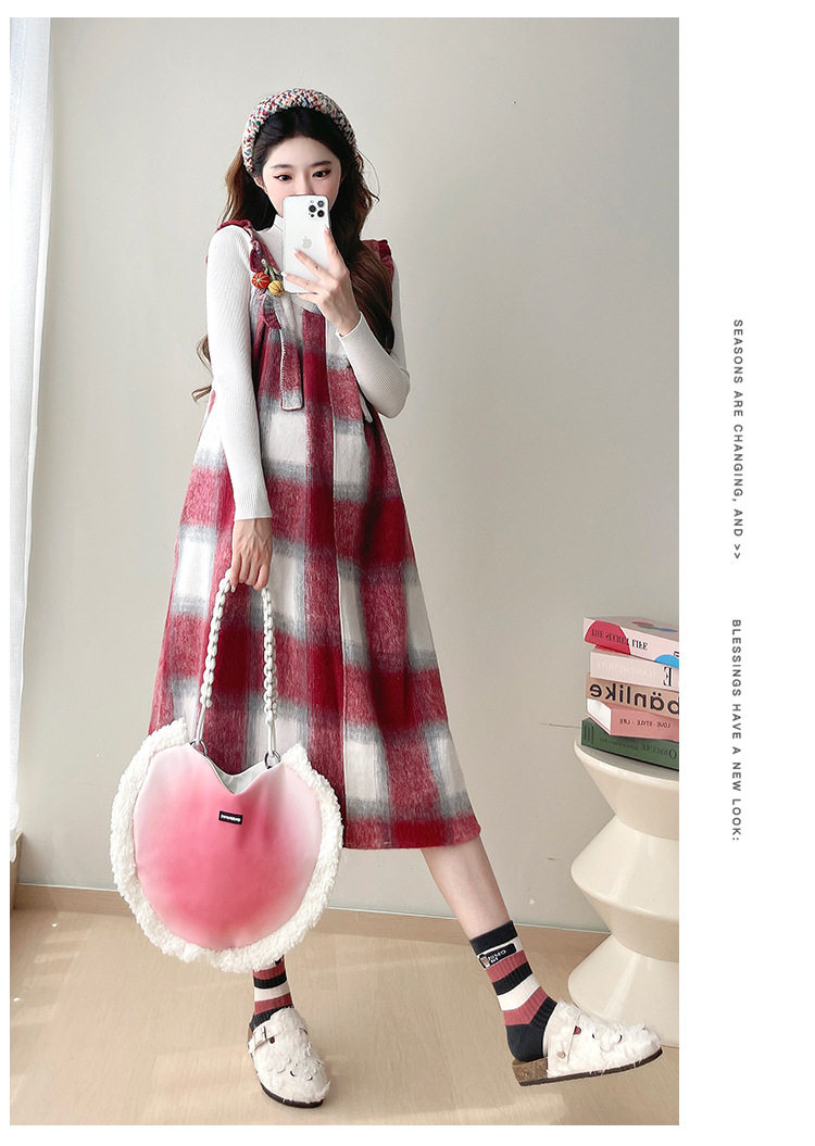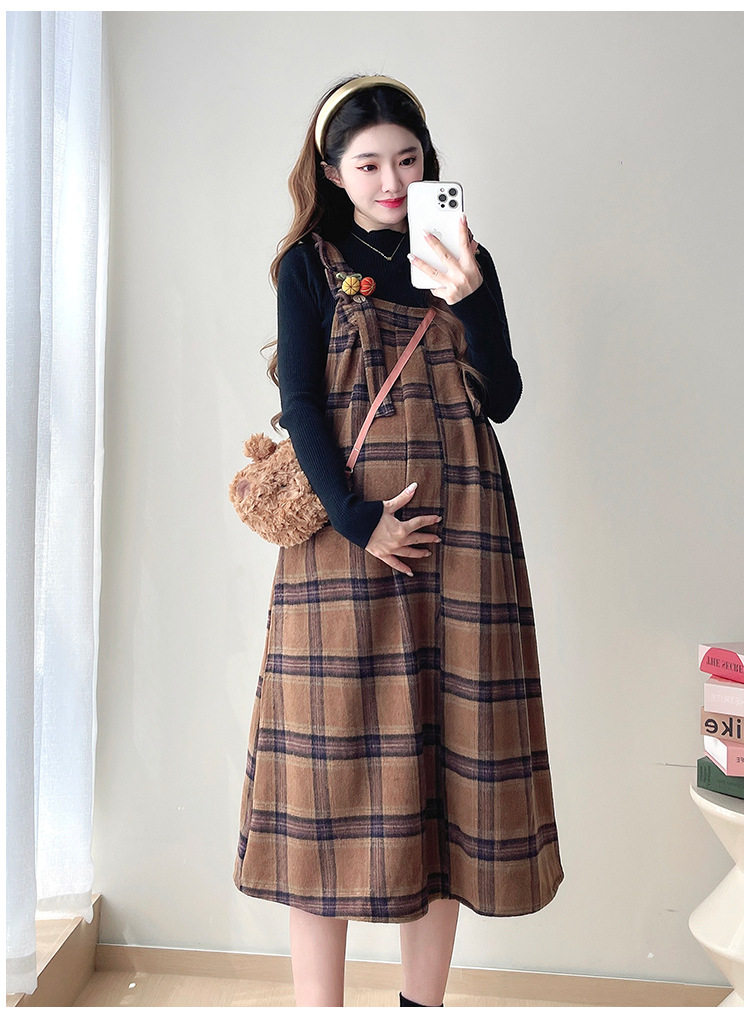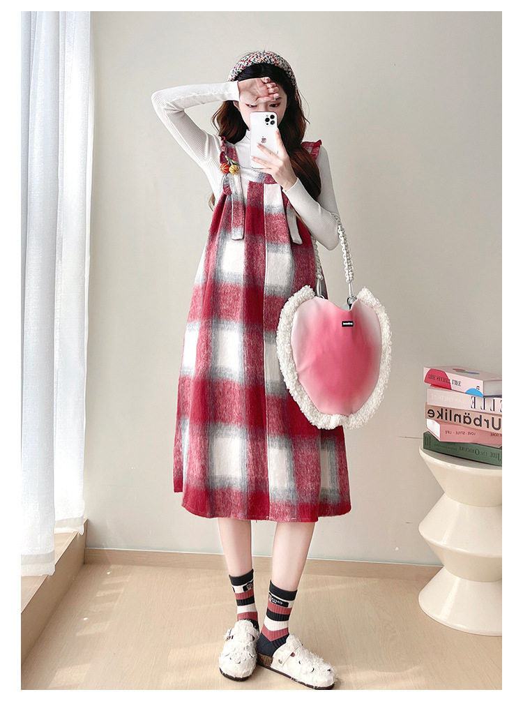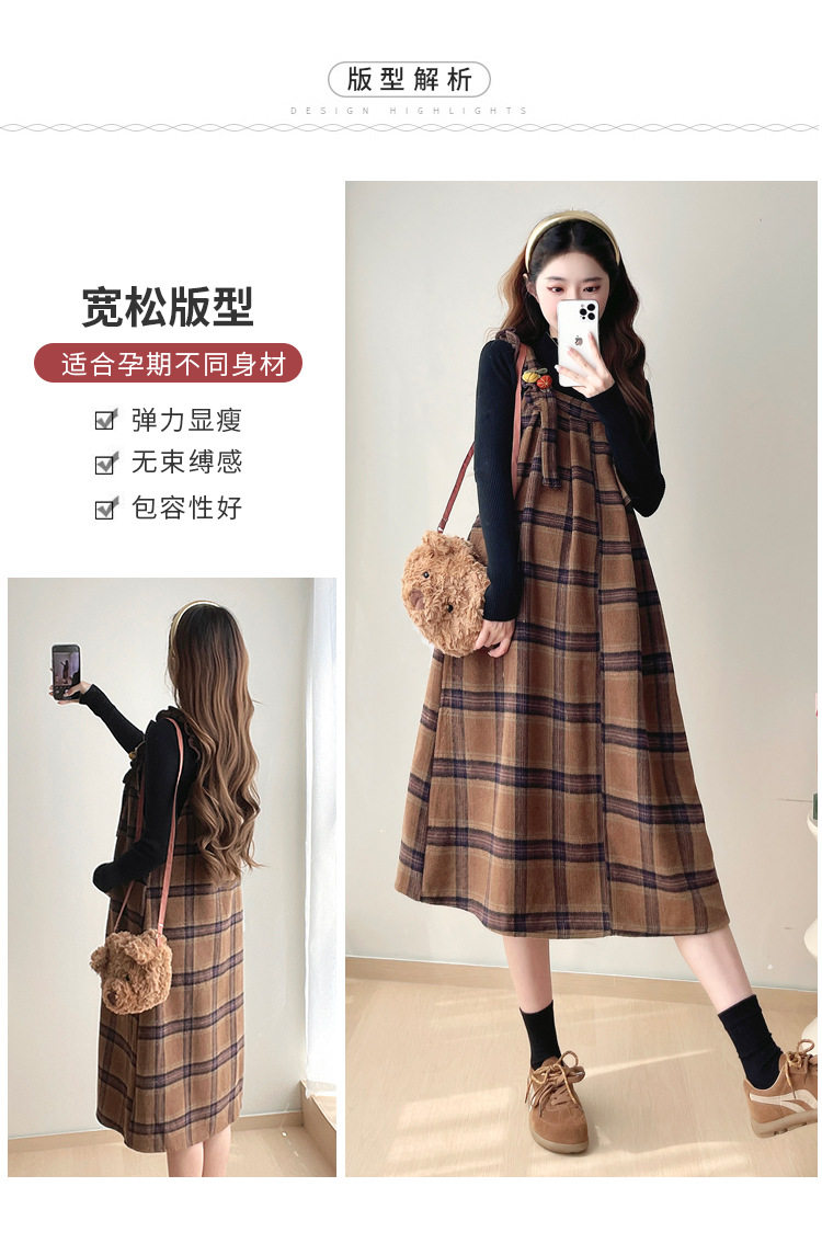 Maternity 2024 Autumn and Winter New Sweet All-match Plaid Woolen Vest Base Knitted dress Two-piece Set