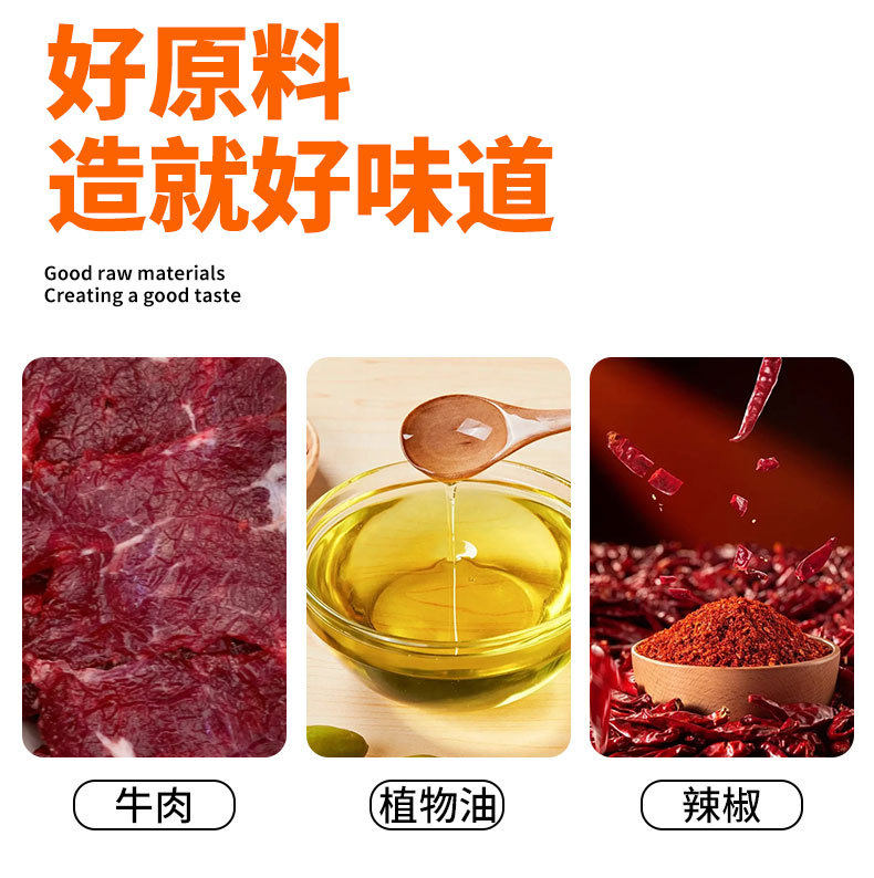 | Raw materials and ingredients | Beef, vegetable oil, white sugar, sesame seeds, edible salt, pickled pepper, etc |