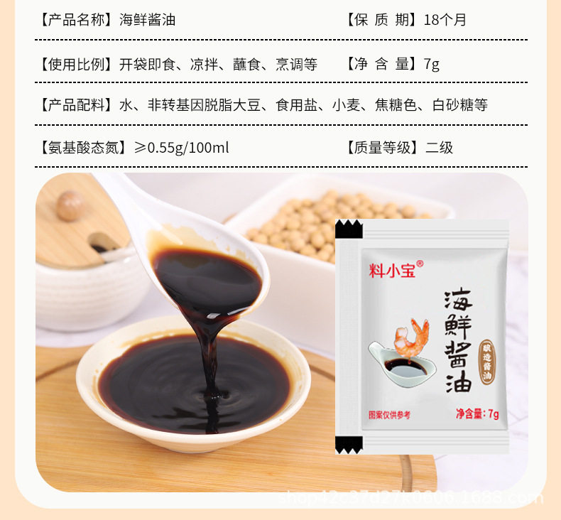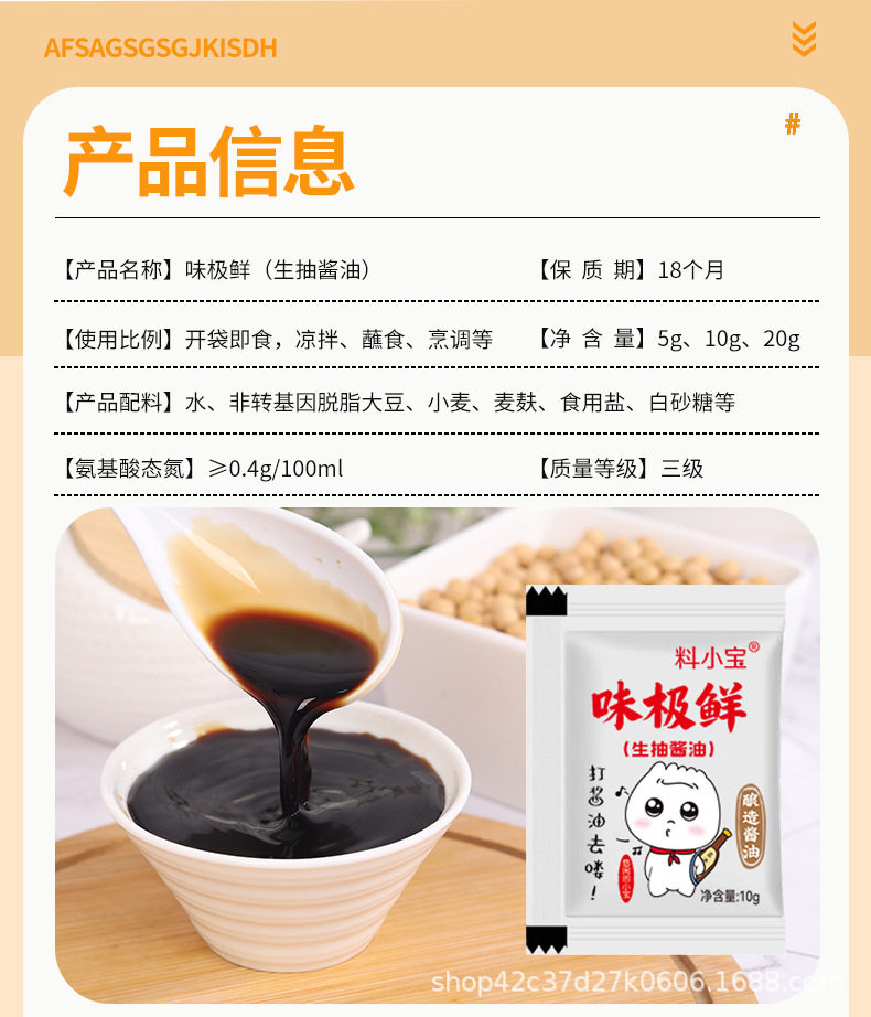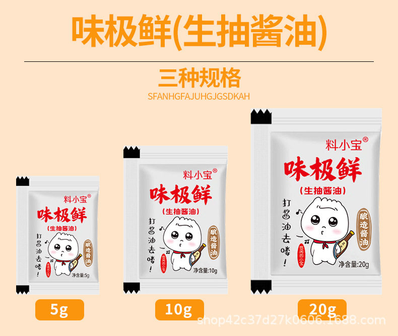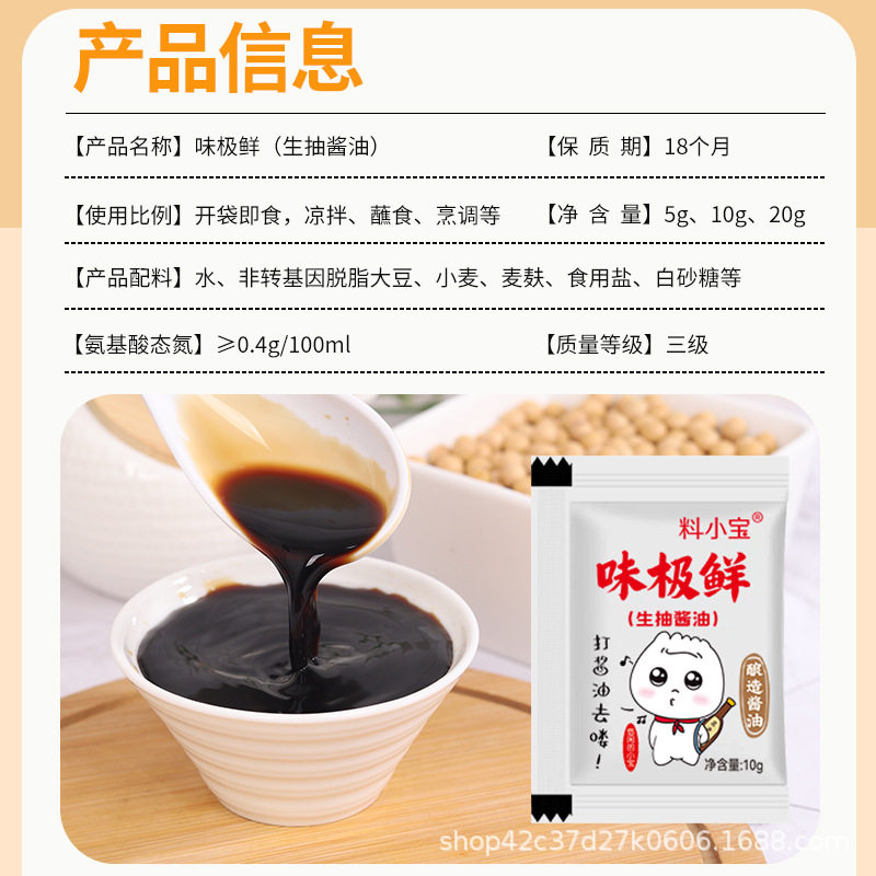 | Packaging specifications | 5g*200 packs [extremely fresh taste],5g*1800 pack [extremely fresh taste],10g*100 packs [extremely fresh taste],10g*200 packs [extremely fresh taste],10g*1200 packs [extremely fresh taste],20g*50 packs [extremely fresh taste],20g*600 packs [extremely fresh taste],Seafood soy sauce 7g*100 packs,Seafood soy sauce 7g*200 packs,Seafood soy sauce 7g*1800 packs |