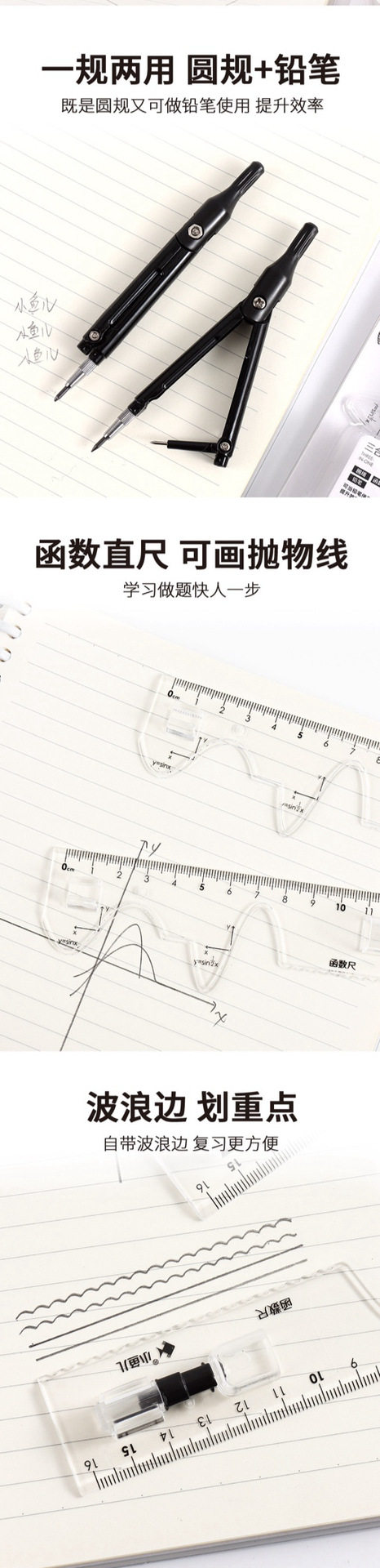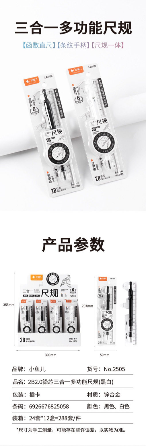 Xiaoyuer 2505 three-in-one multifunctional ruler 2B 2.0 lead black and white function ruler compasses ruler suit