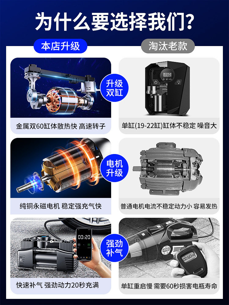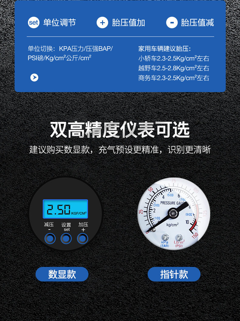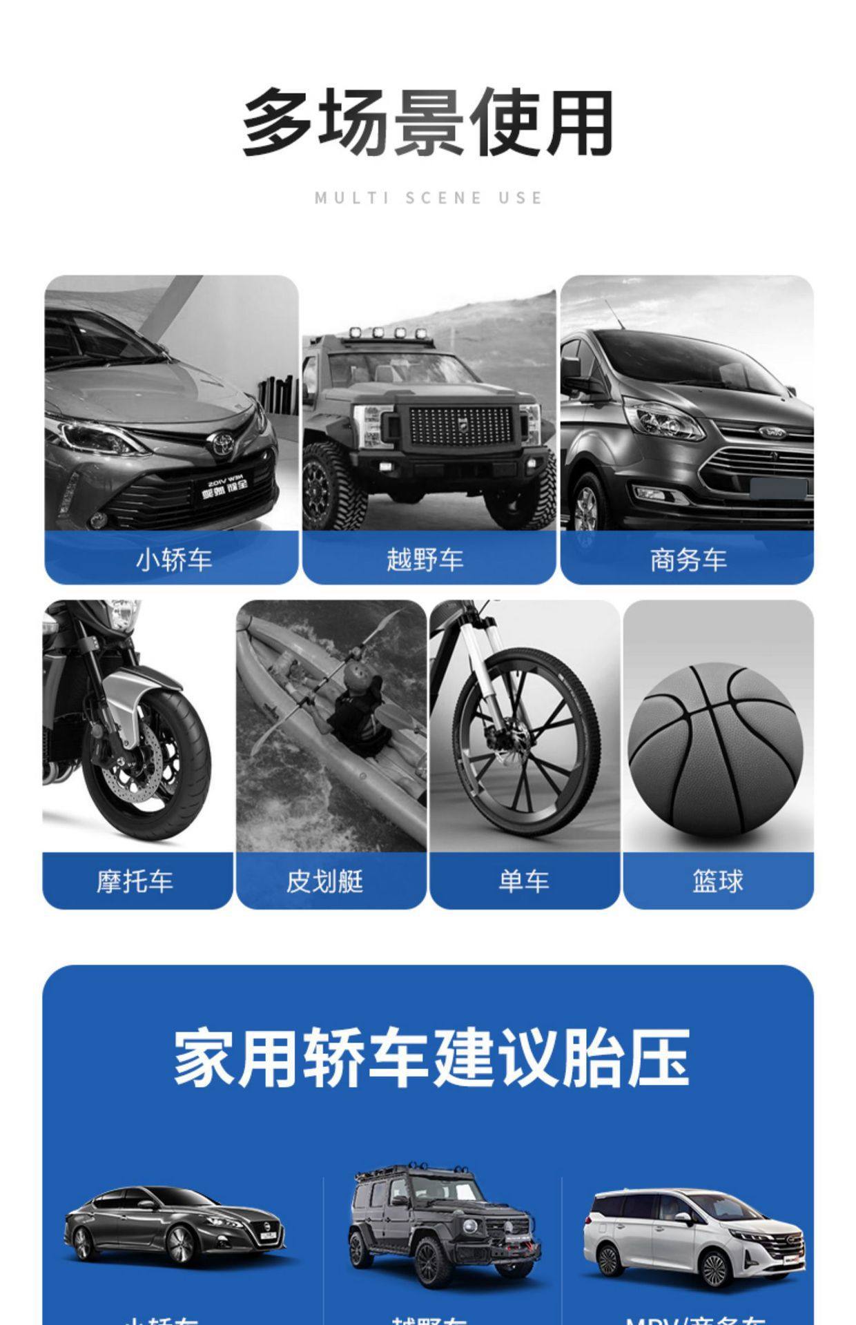 | Specifications | [pointer model] double 60 cylinder comes with 3m extension cord + battery clip,[pointer model] double 60-cylinder comes with inflatable nozzle + 3m extension cord + battery clip + storage bag,[pointer model] double 60-cylinder comes with 3m extension cord + battery clip + tire repair tool + fuse + tool box,[digital display model] double 60-cylinder comes with inflatable nozzle + 3m extension cord + battery clip,[digital display model] double 60 cylinder comes with 3m extension cord + battery clip + storage bag,[digital display model] dual 60 cylinders come with 3m extension cord + battery clip + tire repair tool + fuse + tool box |