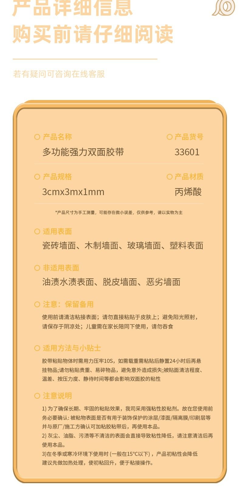 | Color | 33601 box size 144 [30mm*3m*1mm],33602 box size 72 [50mm*3m*1mm],33603 box size 96 [30mm*3m*2mm],33604 box size 72 [50mm*3m*2mm],33605 box size 144 [30mm*1.5m*1mm],33606 box size 144 [30mm*1m*2mm]],33612 box size 72 [30mm*5m*1mm],33625 box size 144 boxes [15mm*3m*1mm] 2 rolls/box |