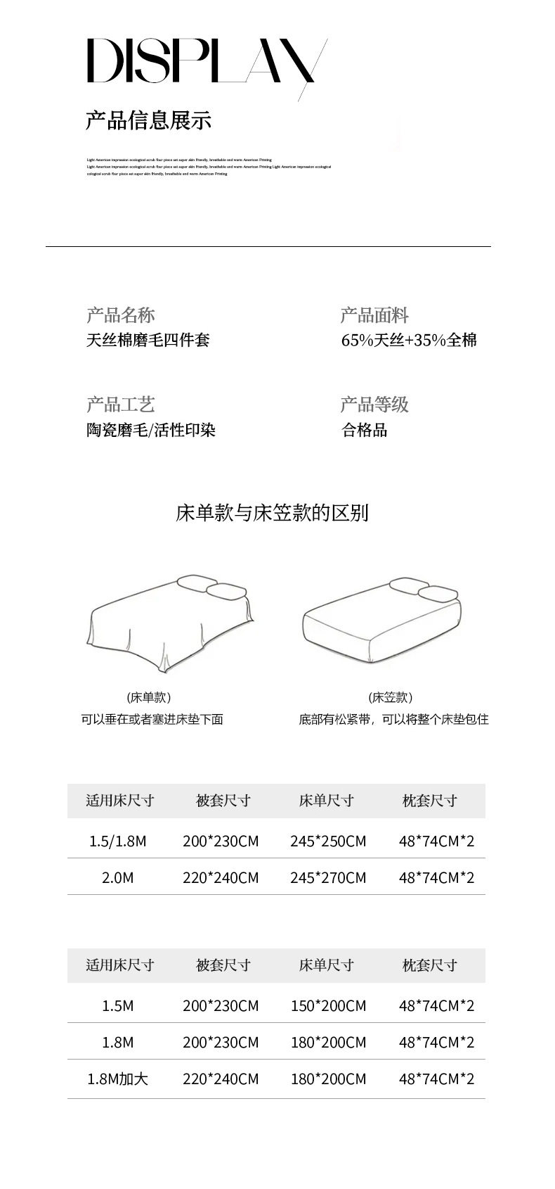 | Size specifications | 1.5m bed sheet four-piece set (quilt cover 200*230),1.8m bed sheet four-piece set (quilt cover 200*230),2.0m bed sheet four-piece set (quilt cover 220*240),1.5m fitted sheet set of four (quilt cover 200*230),1.8m fitted sheet set of four (quilt cover 200*230) |