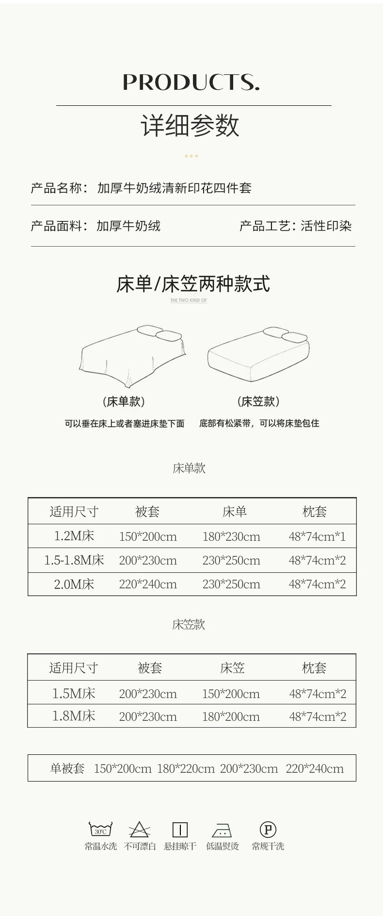 | Size specifications | 1.2m bed sheet three-piece set (quilt cover 150*200 sheets 180*230 pillowcases 48*74*1),1.8m bed sheet four-piece set (quilt cover 200*230 sheets 230*250 pillowcases 48*74*2),2.0m bed sheet four-piece set (quilt cover 220*240 sheets 230*250 pillowcases 48*74*2),1.5m fitted sheet set of four (quilt cover 200*230),1.8m fitted sheet set of four (quilt cover 200*230),150*200cm single quilt cover,180*220cm single quilt cover,200*230cm single quilt cover,220*240cm single quilt cover |