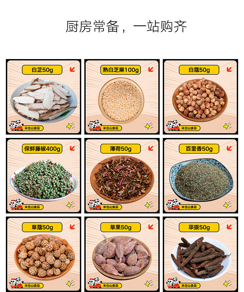Packaging specifications Red pepper 50g,Green pepper 50g,Xiaomi spicy 50g,Octagonal 50g,Fragrant leaves 50g,Cinnamon 50g,Fennel 50g,Grass 50g,White peppercorns 50g,Black pepper granules 100g,Black pepper 50g,White pepper 50g,Cooked white sesame seeds 100g,Cooked black sesame seeds 100g,Fresh rattan pepper 350g,Cumin grains 100g,Baiko 50g,Baizhi 50g,Thyme 50g,Mint 50g,Lift 50g,Cardamom 50g,Agarwood bar 50g,Shen skin 50g,Licorice slices 50g,Gan pine/vanilla 50g,Lilac 50g,Gui ding 50g,Guizhi 50g,Patchouli 50g,Liangjiang 50g,Spirit grass 50g,Marinade package 150g,Spicy fresh 102g,Rosemary 50g,Female lilac 50g,Woody scented tablets 50g,Grass arrangement 50g,Thousand miles of fragrance 50g,Green fruit 50g,Cardamom 50g,Sanna 50g,Hawthorn slices 50g,Thirteen fragrances 45g,Dill 50g,Sumu 50g,Five fragrance powder 100g,Fragrant five plus leather 50g,50g incense fruit,Xinyi flower 50g,50g per bite,Gardenia 50g,Shell 50g,Lithospermum 50g,Hanyuan red pepper 50g (bottled),Hanyuan pepper 60g (bottled),Octagonal 40g (bottled),Cinnamon 50g (bottled)