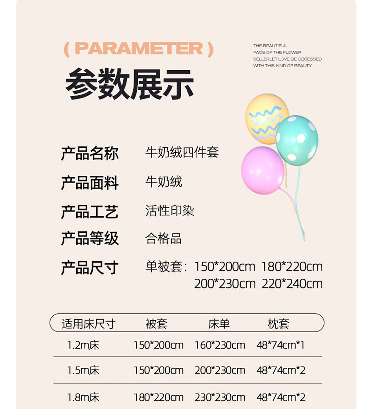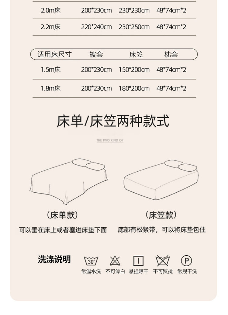 | Size specifications | 1.2 three-piece set (quilt cover 150*200cm),1.5 four-piece set (quilt cover 150*200cm),1.8 four-piece set (quilt cover 180*220cm),2.0 four-piece set (quilt cover 200*230cm),2.2 four-piece set (quilt cover 220*240cm),1.5 fitted sheet (quilt cover 200*230cm),1.8 fitted sheet (quilt cover 200*230cm),1.5 single quilt cover (150*200cm),1.8 single quilt cover (180*220cm),2.0 single quilt cover (200*230cm),2.2 single quilt cover (220*240cm) |