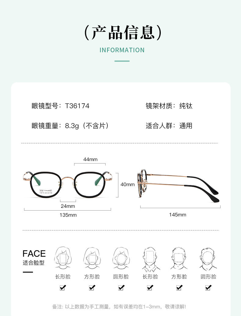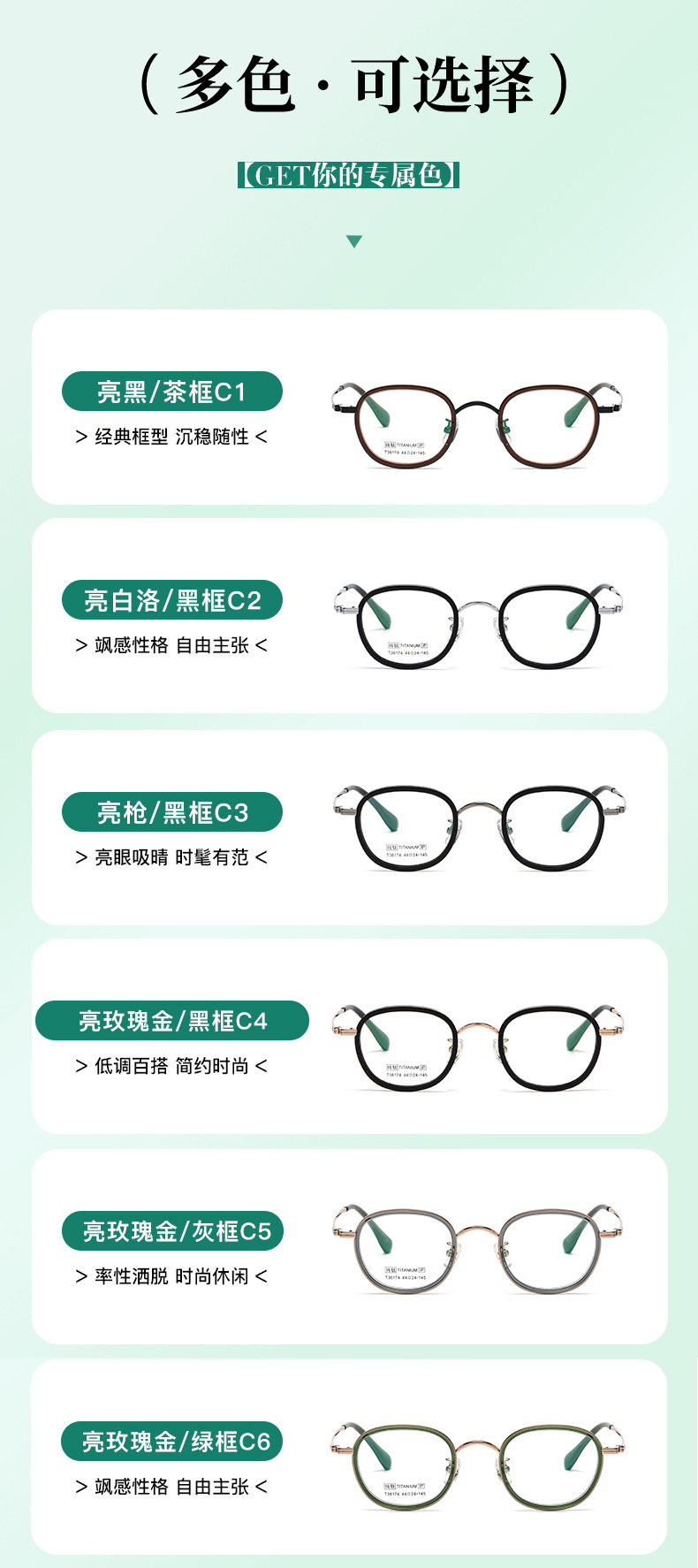| Frame color | 1. bright black/tea frame c1,2. bright white/black frame c2,3. bright gun/black frame c3,4. bright rose gold/black frame c4,Black,6. bright rose gold/green frame c6 |