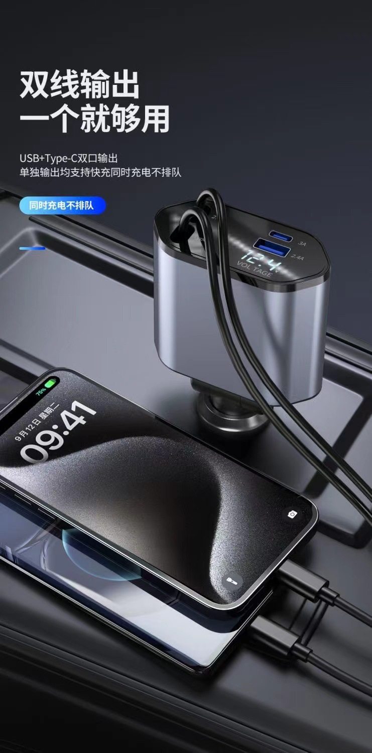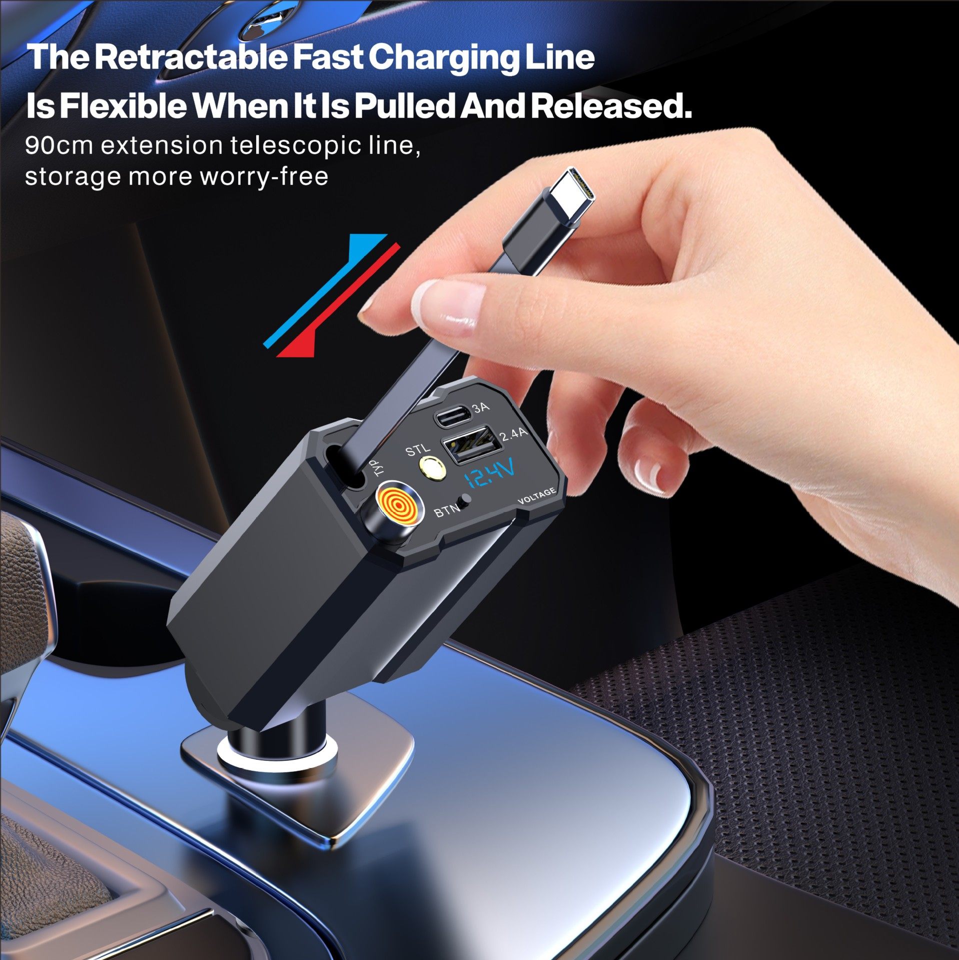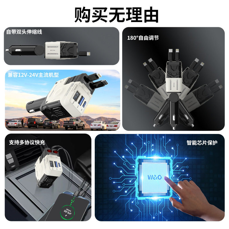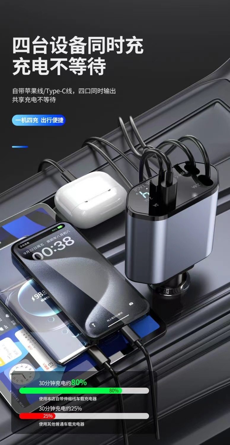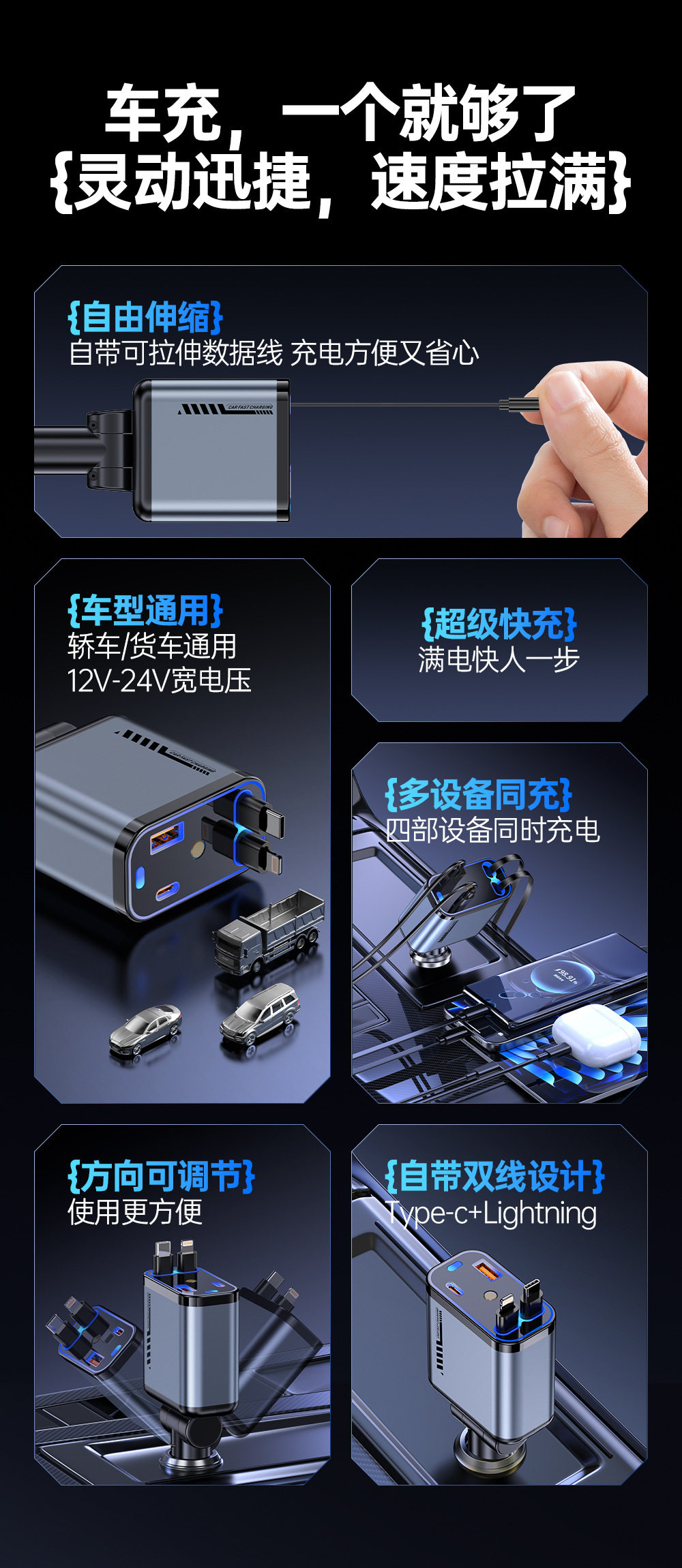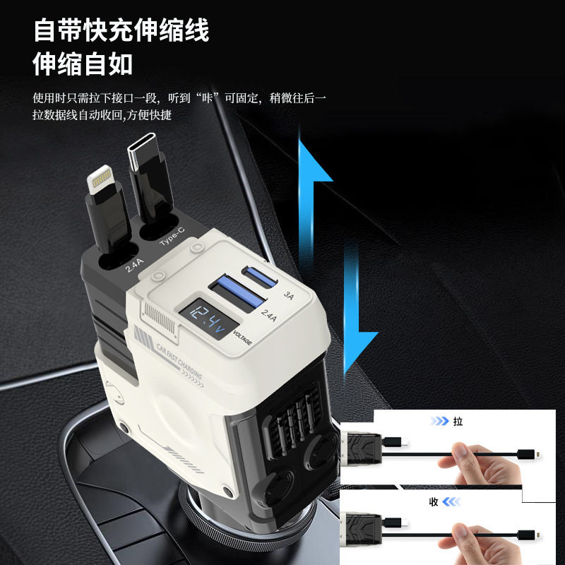 Cross-border mecha car mobile phone charger super fast charging four-in-one telescopic line car charger cigarette lighter car supplies