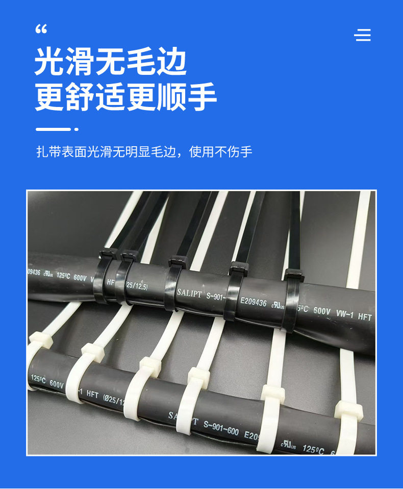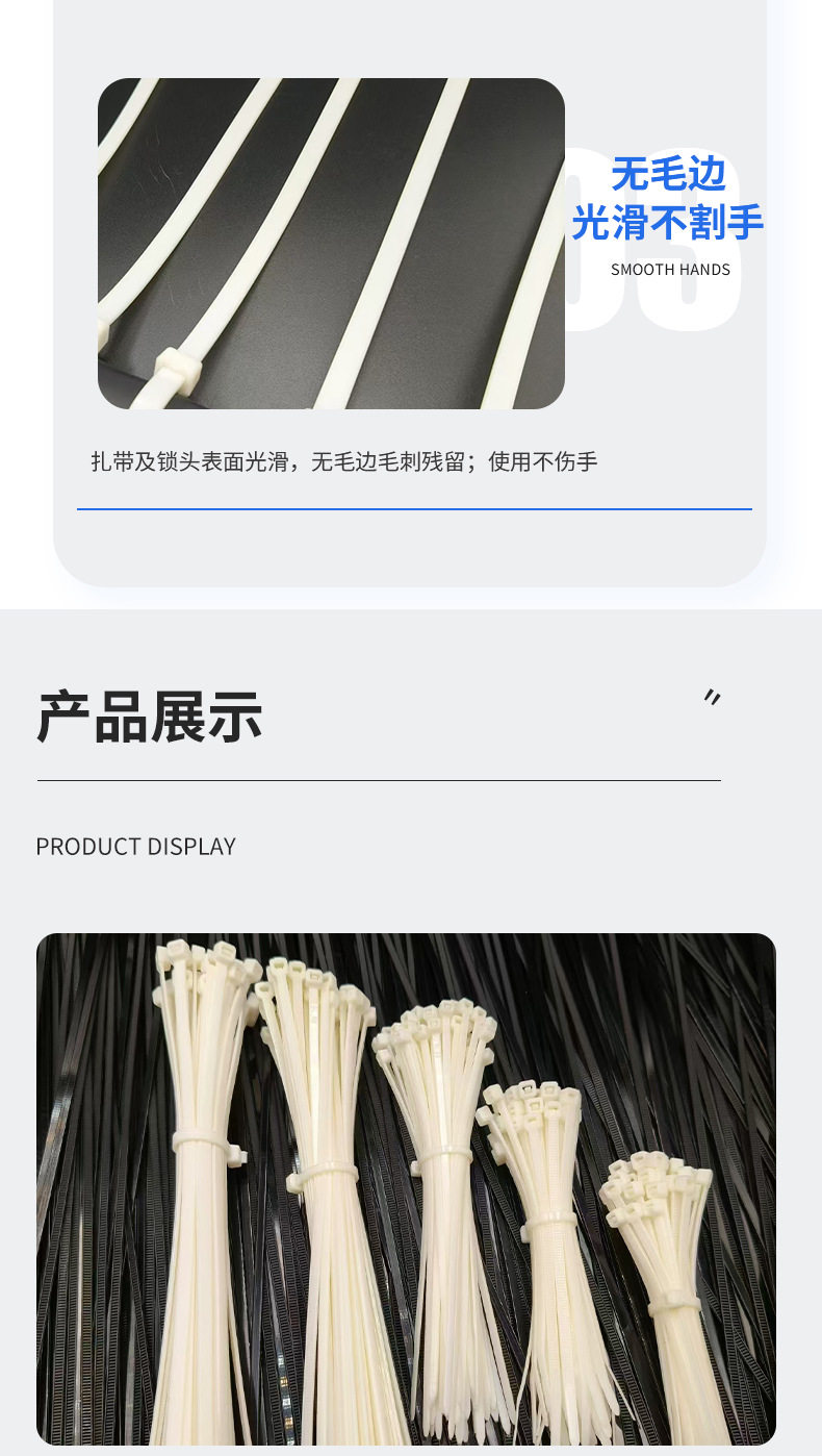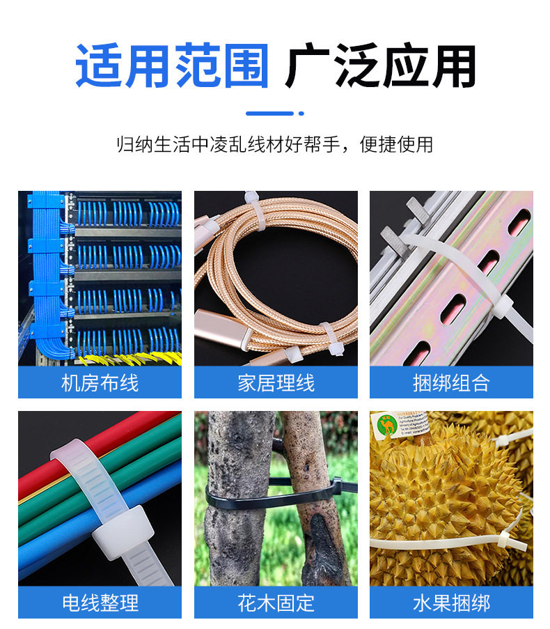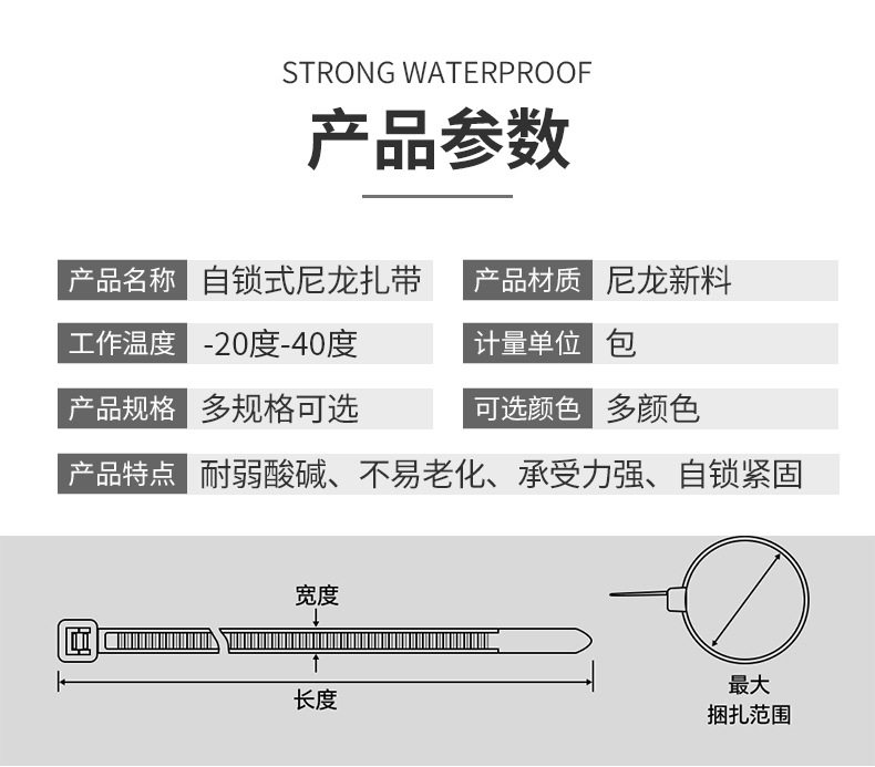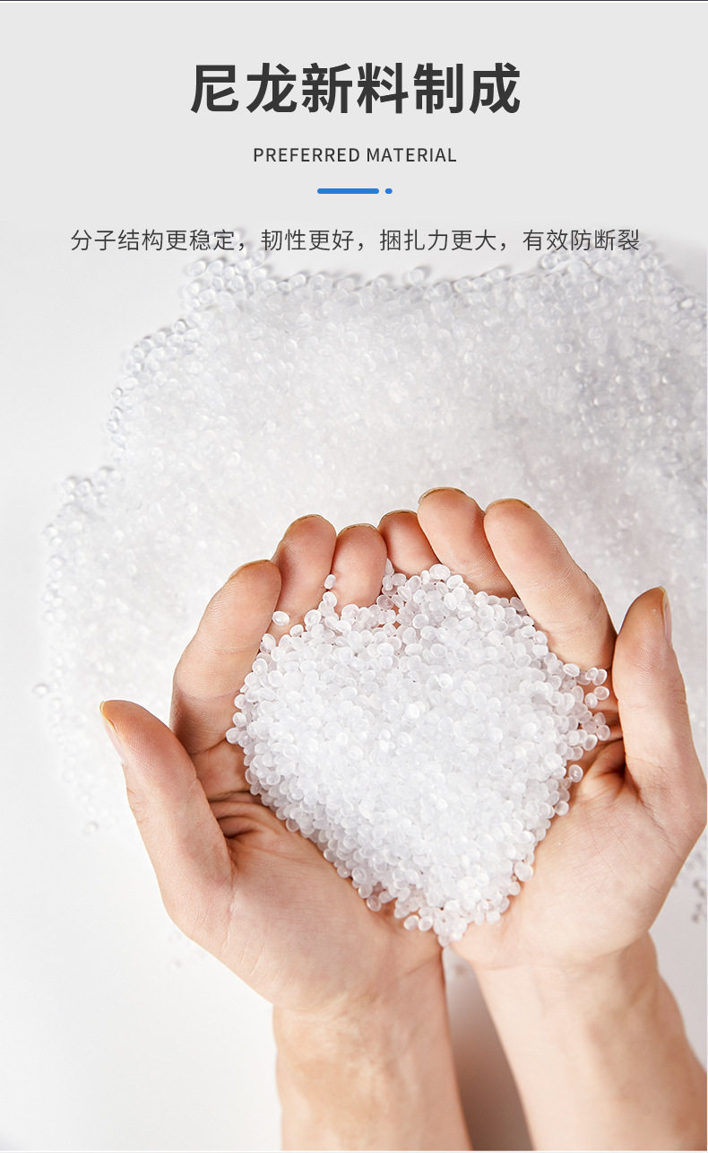 | Specifications and models | White (minus 20-40 degrees) cold-resistant cable tie; 3*80 non-standard 2.0mm wide 1000 strips,White (minus 20-40 degrees) cold-resistant cable tie; 3*80GB 2.5mm wide 1000,White (minus 20-40 degrees) cold-resistant cable tie; 3*100 non-standard 2.0mm wide 1000 strips,White (minus 20-40 degrees) cold-resistant cable tie; 3*100GB 2.5mm wide 1000 strips,White (minus 20-40 degrees) cold-resistant cable tie; 4*100GB 3.6mm wide 500 strips,White (minus 20-40 degrees) cold-resistant cable tie; 5*100GB 4.8mm wide 500 strips,White (minus 20-40 degrees) cold-resistant cable tie; 3*120GB 2.5mm wide 1000 strips,White (minus 20-40 degrees) cold-resistant cable tie; 4*120GB 3.6mm wide 500 strips,White (minus 20-40 degrees) cold-resistant cable tie; 5*120GB 4.8mm wide 500 strips,White (minus 20-40 degrees) cold-resistant cable tie; 3*150 non-standard 2.0mm wide 1000 strips,White (minus 20-40 degrees) cold-resistant cable tie; 3*150GB 2.5mm wide 500 strips,White (minus 20-40 degrees) cold-resistant cable tie; 3*150GB 3.0mm wide 500 strips,White (minus 20-40 degrees) cold-resistant cable tie; 4*150GB 3.6mm wide 500 strips,White (minus 20-40 degrees) cold-resistant cable tie; 5*150GB 4.8mm wide 500 strips,White (minus 20-40 degrees) cold-resistant cable tie; 3*200 non-standard 2.0mm wide 500 strips,White (minus 20-40 degrees) cold-resistant cable tie; 3*200GB 2.5mm wide 500 strips,White (minus 20-40 degrees) cold-resistant cable tie; 4*200GB 3.6mm wide 500 strips,White (minus 20-40 degrees) cold-resistant cable tie; 5*200GB 4.8mm wide 500 strips,White (minus 20-40 degrees) cold-resistant tie; 8*200GB 7.6mm wide 100 strips,White (minus 20-40 degrees) cold-resistant cable tie; 4*250 non-standard 3.0mm wide 250 strips,White (minus 20-40 degrees) cold-resistant cable tie; 4*250GB 3.6mm wide 250 strips,White (minus 20-40 degrees) cold-resistant cable tie; 5*250GB 4.8mm wide 250 strips,White (minus 20-40 degrees) cold-resistant tie; 8*250GB 7.6mm wide 100 strips,White (minus 20-40 degrees) cold-resistant cable tie; 4*300GB 3.6mm wide 250 strips,White (minus 20-40 degrees) cold-resistant cable tie; 5*300GB 4.8mm wide 250 strips,White (minus 20-40 degrees) cold-resistant tie; 8*300GB 7.6mm wide 100 strips,White (minus 20-40 degrees) cold-resistant cable tie; 8*300 non-standard 6.5mm wide 250 strips,White (minus 20-40 degrees) cold-resistant cable tie; 5*350 non-standard 3.6mm wide 250 strips,White (minus 20-40 degrees) cold-resistant cable tie; 5*350GB 4.8mm wide 250 strips,White (minus 20-40 degrees) cold-resistant cable tie; 8*350 non-standard 6.0mm wide 250 strips,White (minus 20-40 degrees) cold-resistant cable tie; 5*370 non-standard 3.6mm wide 250 strips,White (minus 20-40 degrees) cold-resistant cable tie; 5*370GB 4.8mm wide 250 strips,White (minus 20-40 degrees) cold-resistant cable tie; 8*370 non-standard 6.5mm wide 250 strips,White (minus 20-40 degrees) cold-resistant tie; 8*370GB 7.6mm wide 100 strips,White (minus 20-40 degrees) cold-resistant cable tie; 5*400GB 4.8mm wide 250 strips,White (minus 20-40 degrees) cold-resistant tie; 8*400GB 7.6mm wide 100 strips,White (minus 20-40 degrees) cold-resistant cable tie; 9*400GB 8.8mm wide 100 strips,White (minus 20-40 degrees) cold-resistant cable tie; 5*450GB 4.8mm wide 250 strips,White (minus 20-40 degrees) cold-resistant cable tie; 8*450 non-standard 6.0mm wide 250 strips,White (minus 20-40 degrees) cold-resistant tie; 8*450GB 7.6mm wide 100 strips,White (minus 20-40 degrees) cold-resistant cable tie; 9*450GB 8.8mm wide 100 strips,White (minus 20-40 degrees) cold-resistant cable tie; 5*500GB 4.8mm wide 250 strips,White (minus 20-40 degrees) cold-resistant tie; 8*500GB 7.6mm wide 100 strips,White (minus 20-40 degrees) cold-resistant tie; 8*500GB 8.8mm wide 100,White (minus 20-40 degrees) cold-resistant cable tie; 5*550GB 4.8mm wide 250 strips,White (minus 20-40 degrees) cold-resistant tie; 8*550GB 7.6mm wide 100 strips,White (minus 20-40 degrees) cold-resistant cable tie; 9*550GB 8.8mm wide 100 strips,White (minus 20-40 degrees) cold-resistant cable tie; 12*550GB 12mm wide 100 strips,White (minus 20-40 degrees) cold-resistant cable tie; 9*600GB 8.8mm wide 100 strips |