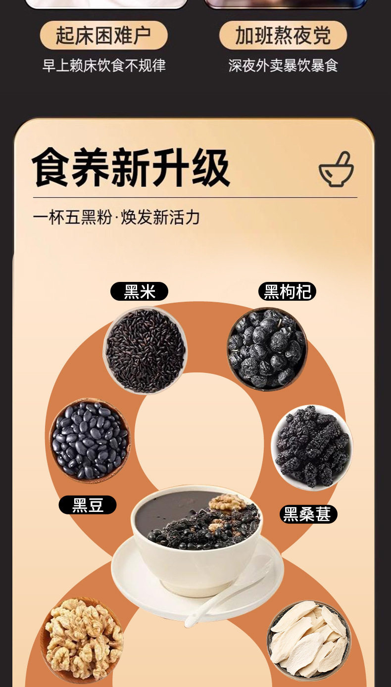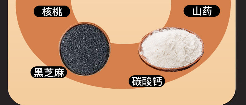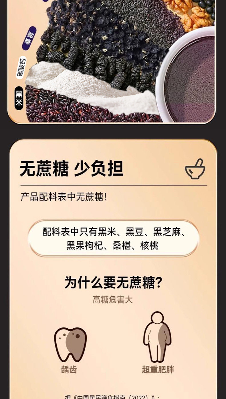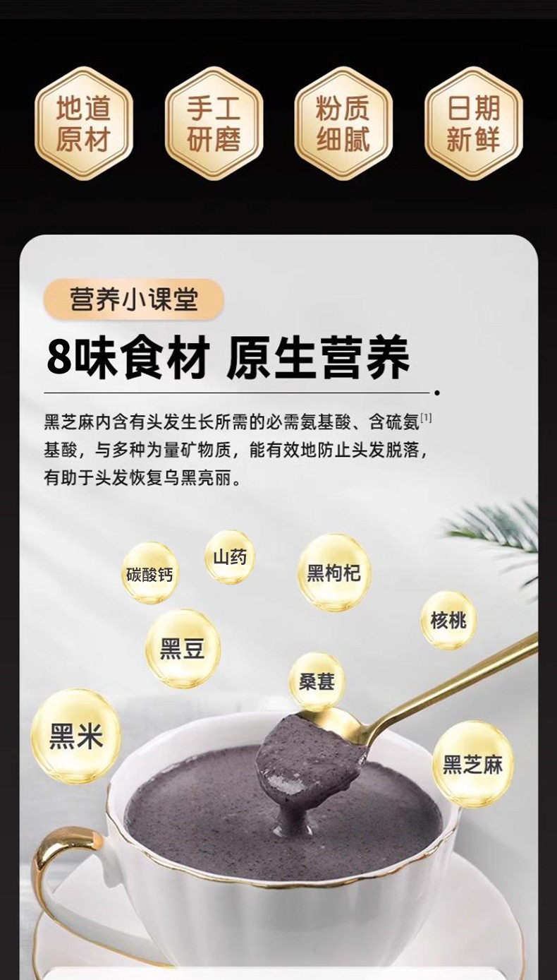 | Raw materials and ingredients | Black sesame seeds, black rice, black beans, mulberry, black wolfberry, walnuts, yam, calcium carbonate |