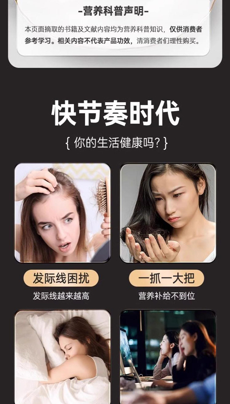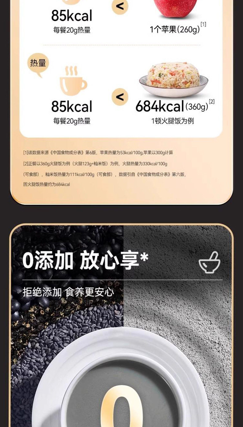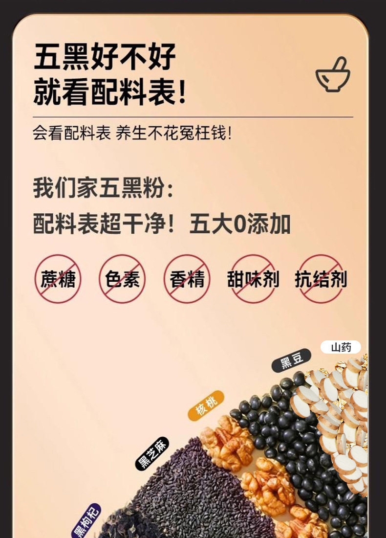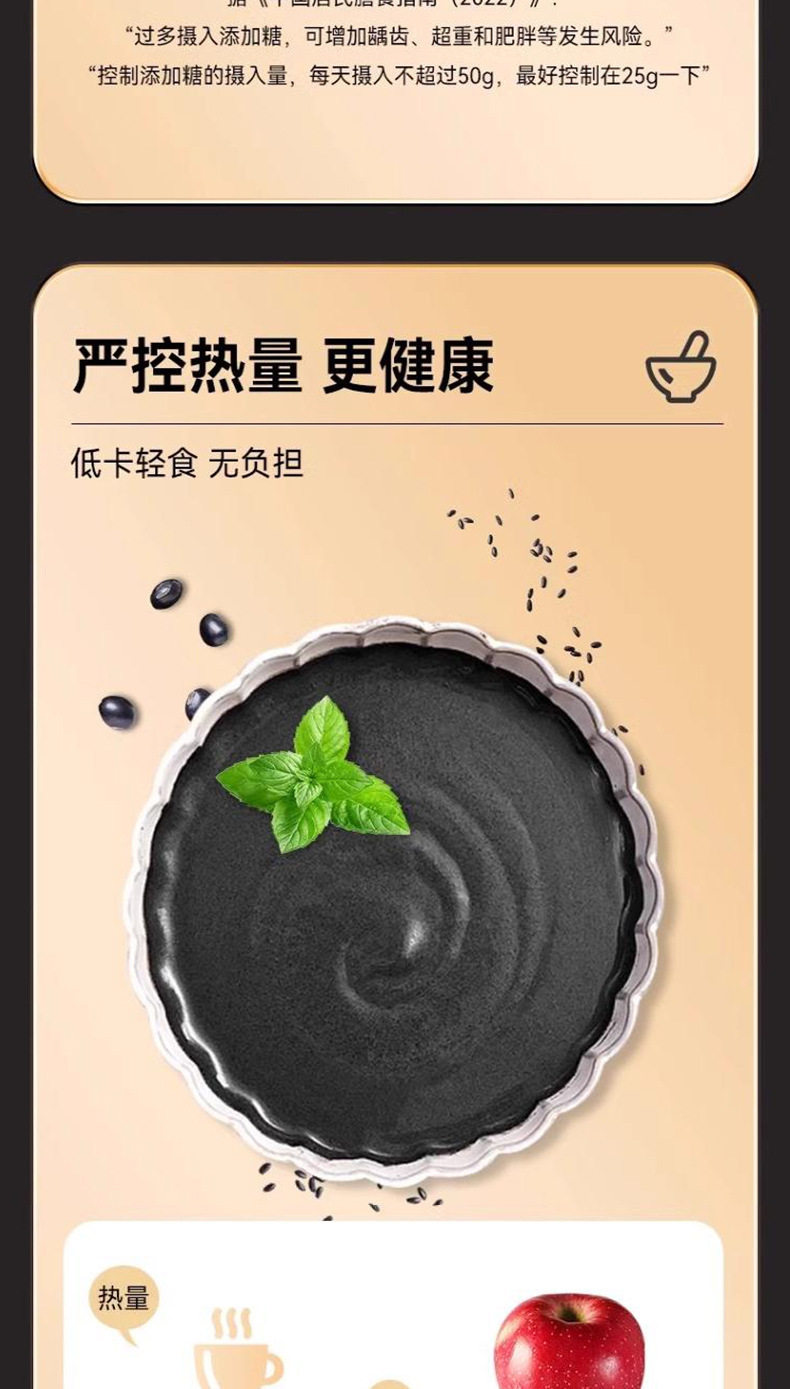 | Raw materials and ingredients | Black sesame seeds, black rice, black beans, mulberry, black wolfberry, walnuts, yam, calcium carbonate |