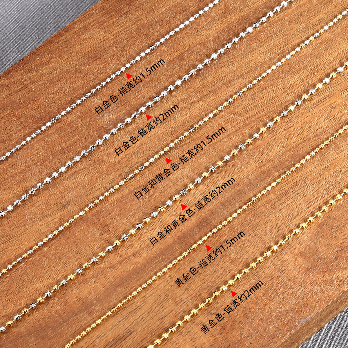 | Color | About 1.5mm bright silver double flash bead chain,Approximately 1.5mm white gold double flash bead chain,Approximately 1.5mm gold double flash bead chain,About 1.5mm white and yellow color double flash bead chain,About 2mm white gold double flash bead chain,About 2mm gold double flash bead chain,About 2mm white and yellow color double flash bead chain |