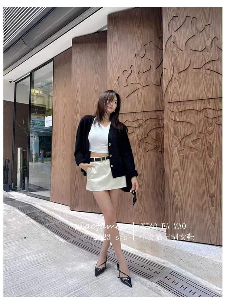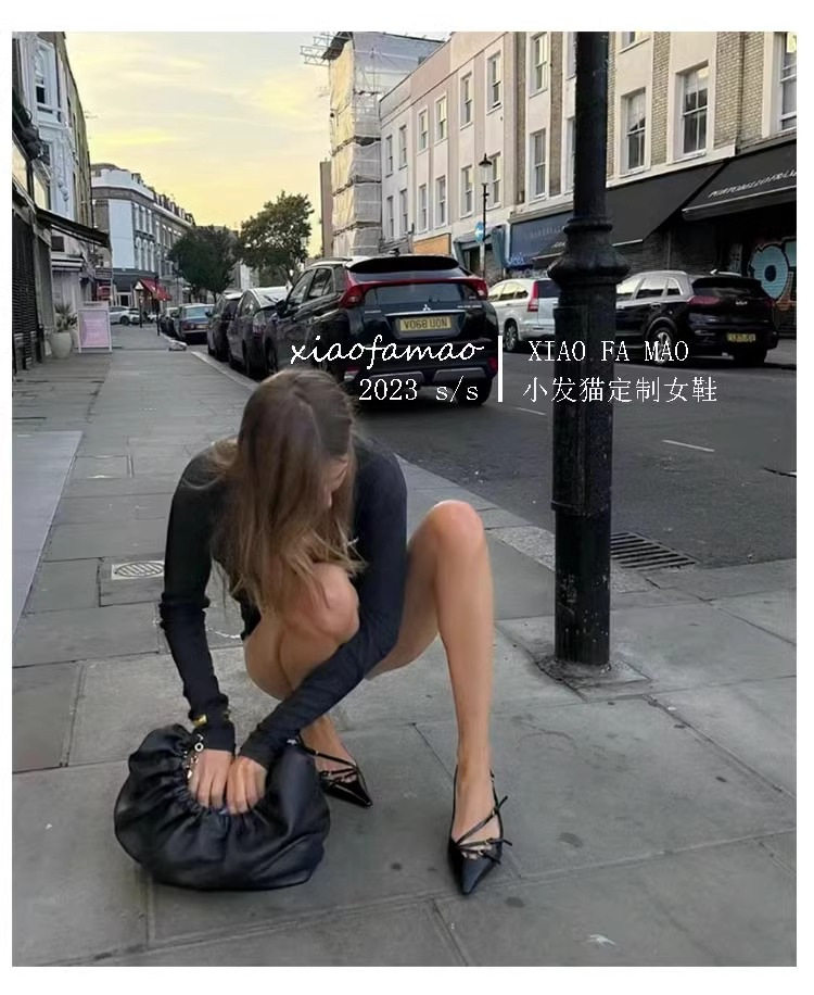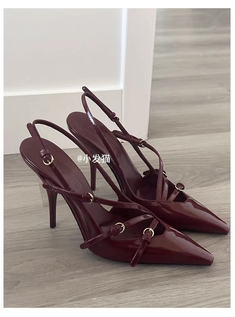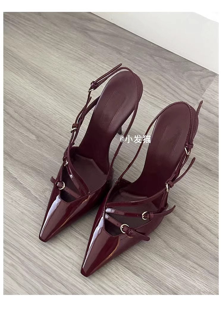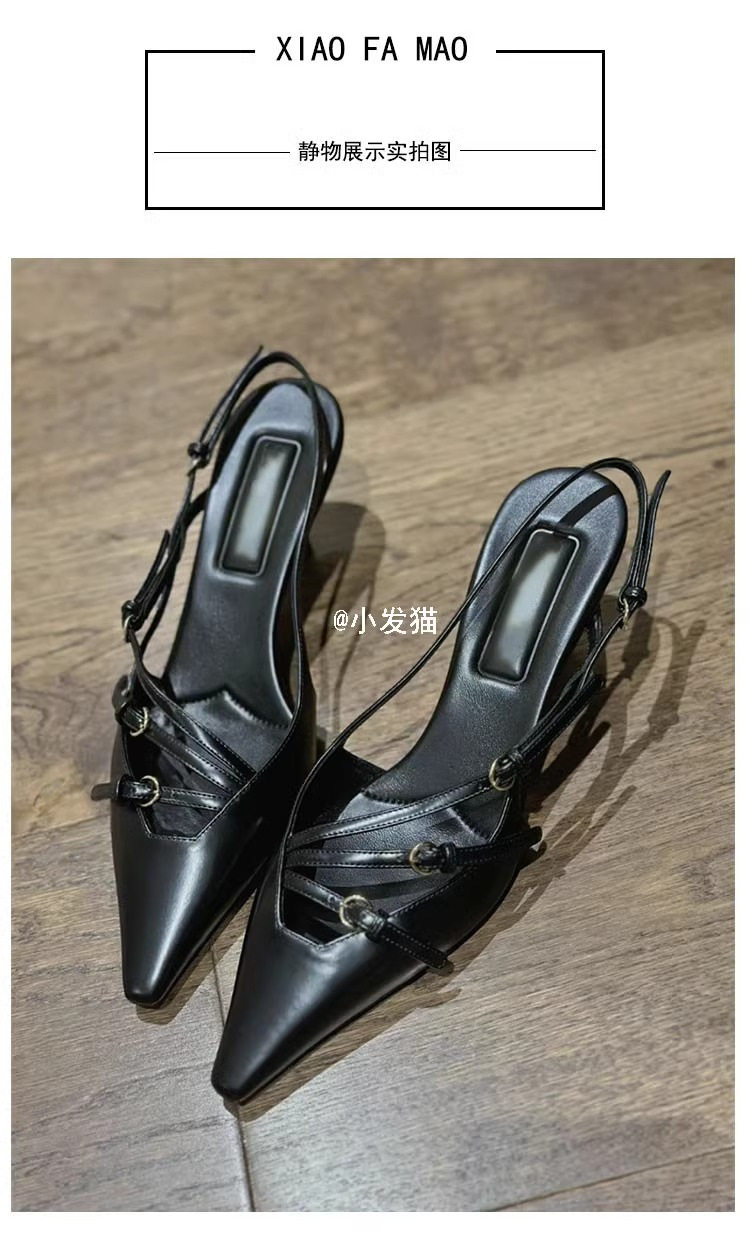 2024 New Style Toe Patent Leather Buckle Strap Cat Heel Sandals Women's Sexy Black Silk Pointed Stiletto Heel High Heels