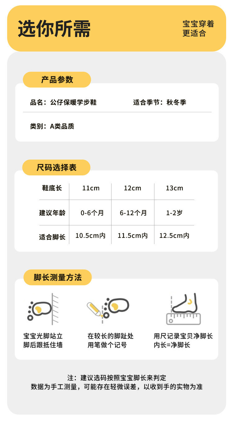 | Size | 11 (suitable for feet 10.5cm long, about 0-6 months within),12 (suitable for feet within 11.5cm long, about 6-12 months),13 (suitable for feet within 12.5 feet, about 1-3 years old) |