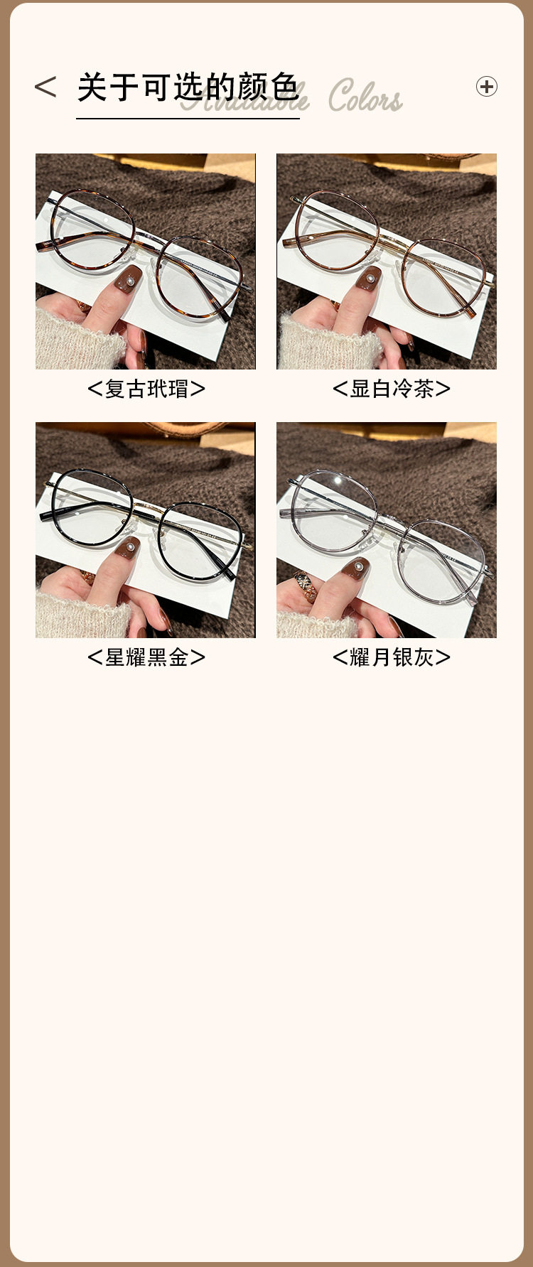 | Frame color | Retro tortoiseshell c2+ alloy,Whitening cold tea c3+ alloy,Star black gold c1+ alloy,Yaoyue silver gray c5+ alloy |