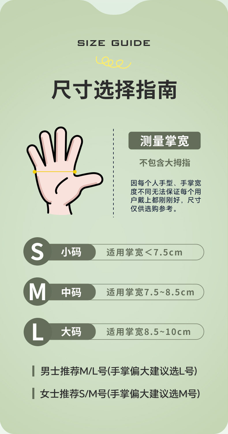 | Size | S (alm width less than 7.5cm),M (palm width 7.5-8.5cm),L (palm width 8.5-10cm) |