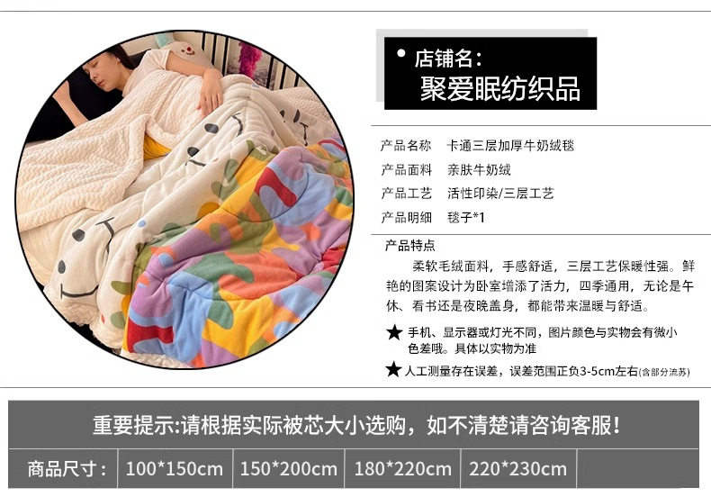 | Color | Quality inspected [flowers manting] three layers of thickening, temperature locking and keeping warm, no lint,Quality inspected [cream puppy] three layers thickened, temperature locking and keeping warm, no lint,Quality inspected [purple strawberry rabbit] three layers thickened, temperature locking and keeping warm, no lint,Quality inspected [fairy world] three layers of thickening, temperature locking and warmth, no lint,Quality inspected [rainbow candy] three layers thickened, temperature locking and keeping warm, no lint,Quality inspected [ziyun rabbit] three layers of thickening, temperature locking and keeping warm, no lint,Quality inspected [purple tulip] three layers thickened, temperature locking and keeping warm, no lint,Quality inspected [chocolate beans] three layers of thickening, temperature locking and keeping warm, no lint,Quality inspected [cute dinosaur] three layers of thickening, temperature locking and keeping warm, no lint,Quality inspected [pink rabbit] three layers of thickening, temperature locking and keeping warm, no lint,Quality inspected [black and white style] three layers thickened, temperature locking and warmth retention, no lint,Quality inspected [candy house] three layers of thickening, temperature locking and keeping warm, no lint |