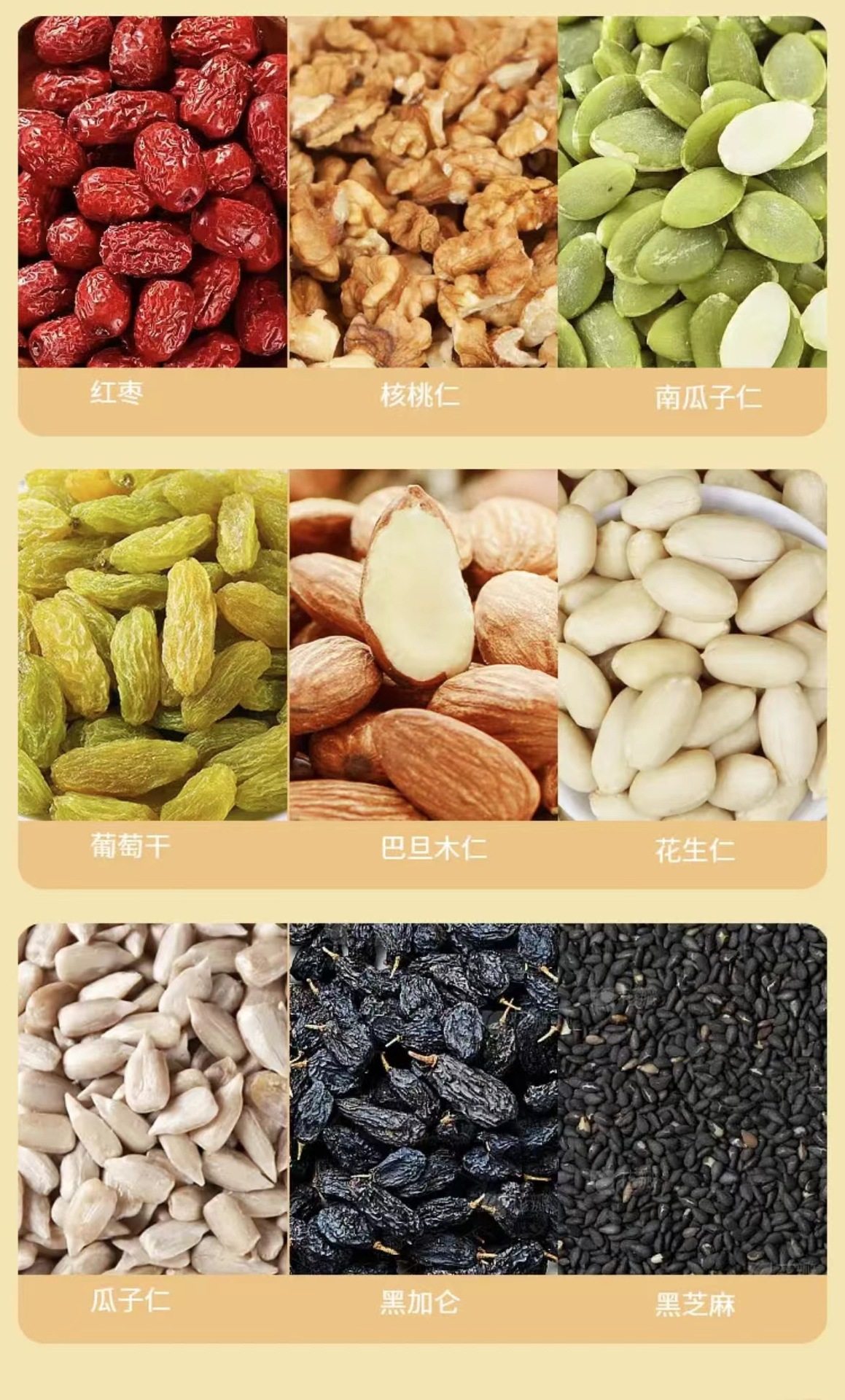 | Raw materials and ingredients | For details on melon seeds, almonds, red dates, melon seeds, etc., please refer to the packaging |