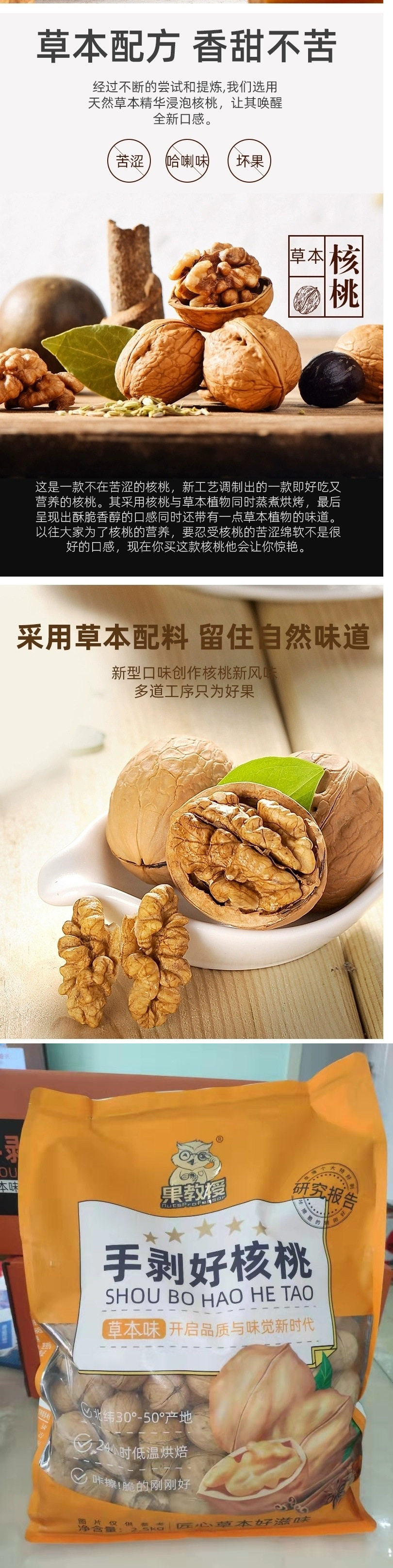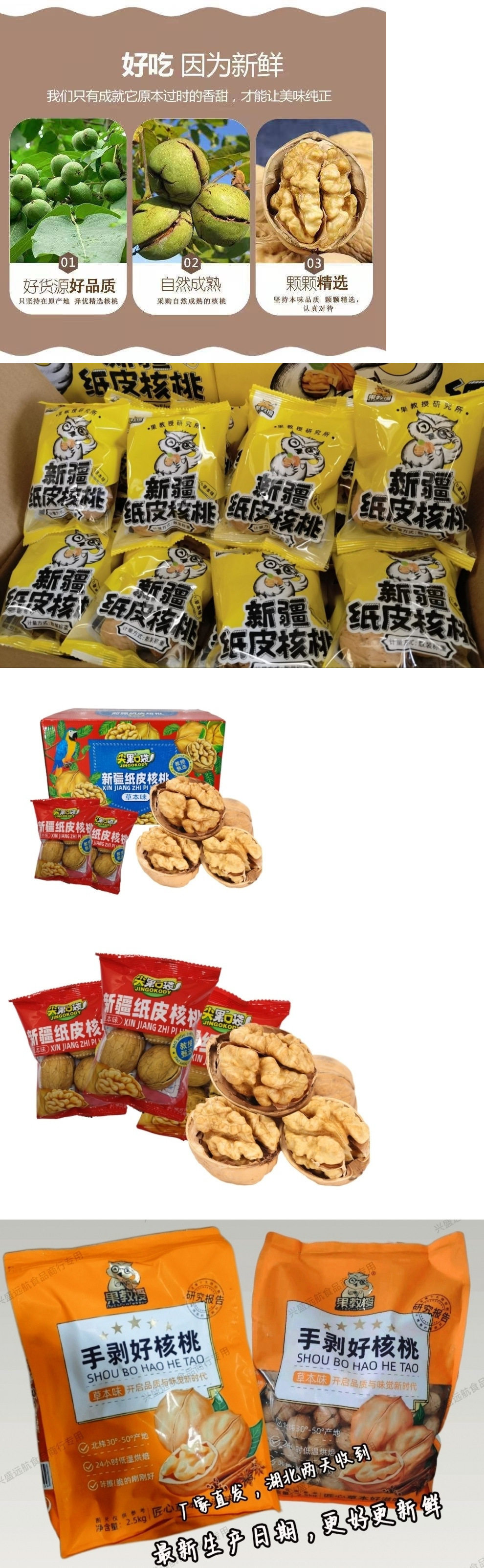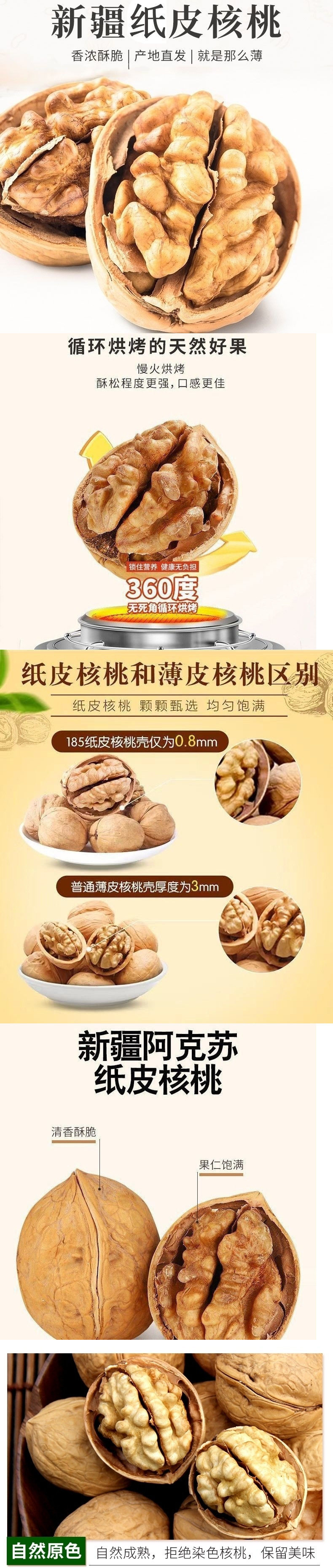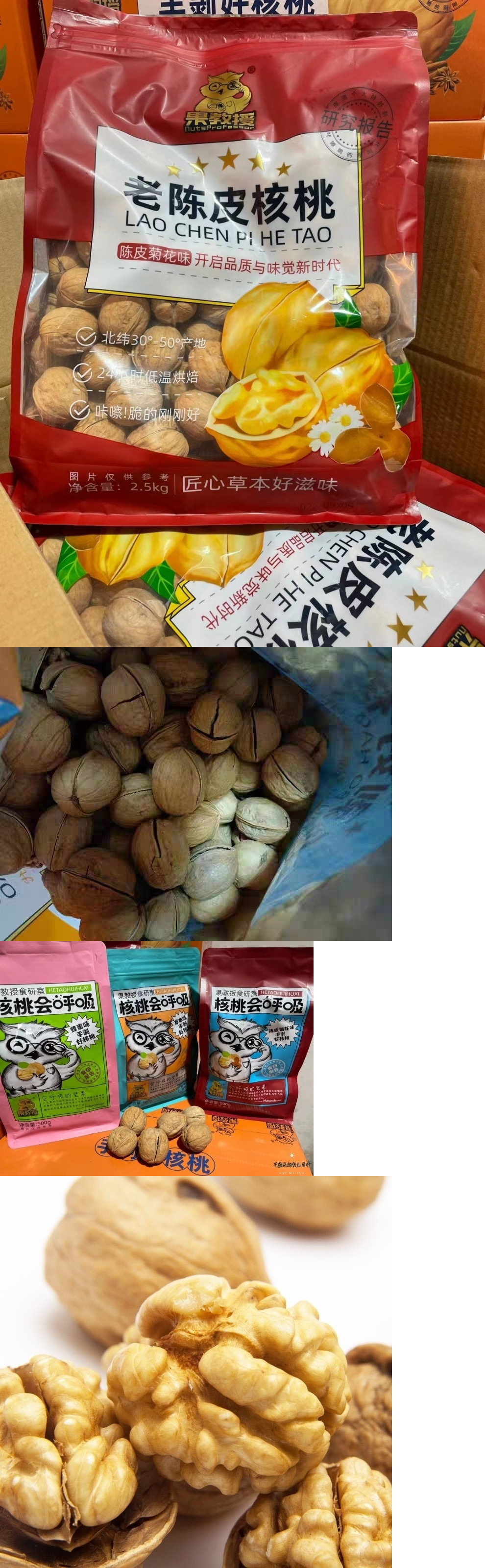 | Packaging specifications | Paper walnut herbal flavor 0.5kg red packet,1 pound of paper-skinned walnuts with tangerine peel flavor,Bulk herbal flavored paper-wrapped walnuts, individually packaged, yellow 1.0kg,Bulk professor selection paper walnut herbal flavor 1.0kg red,Professor selection paper large walnuts special grade 2.5kg large pack herbal flavor,Professor selection herbal flavor 185 paper walnut 2kg small pack,Herbal flavor 185 paper-wrapped walnuts, individually packaged 2.5kg full case |
