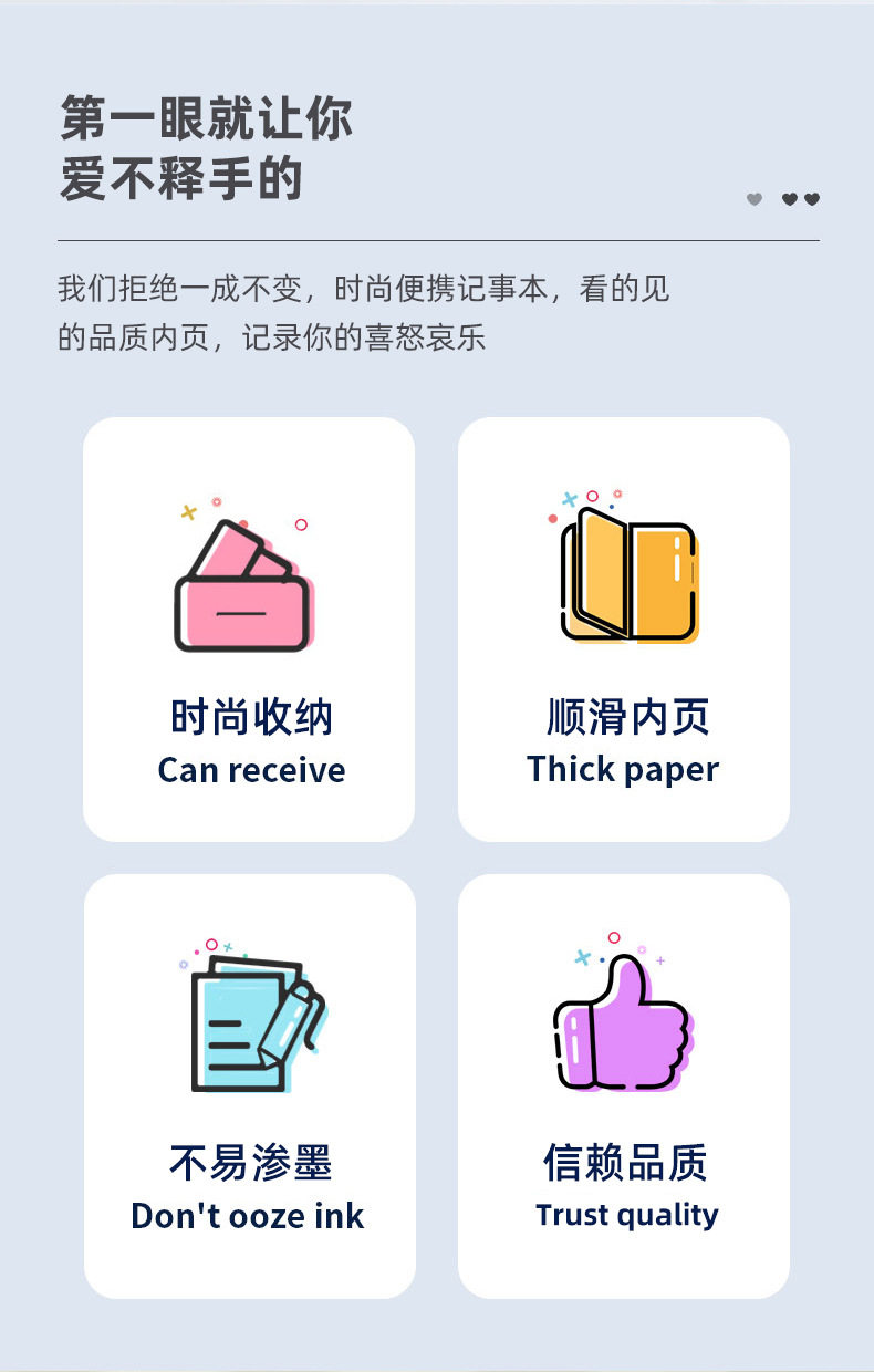 | Cover color | A5 light green--single shell,A5 black--single shell,A5 blue-green--single shell,A5 brown--single shell,A5 rose red--single shell,A5 grass green--single shell,A6 brown--single shell,A6 red--single shell,A6 black--single shell,A6 white--single shell,A6 yellow--single shell,A6 purple--single shell,A6 single shell--grass green,A6 blue-green--single shell,A6 blue--single shell,A6 light green--single shell,A6 pink--single shell,A7 rose red--single shell,A7 white--single shell,A7 brown--single shell,A7 purple--single shell,A7 blue--single shell,A7 pink--single shell,A7 blue-green--single shell,A5 yellow--single shell,A5 white--single shell,A5 pink--single shell,A5 blue--single shell,A5 purple--single shell,A5 shell + horizontal line inner core,A6 shell + horizontal line inner core,A5 shell + 10 zipper bags,A6 shell + 12 budget sheets + 8 zipper bags + 2 5-color stickers + 2 english stickers,A6 shell + 12 zipper bags + 12 budget sheets + 2 5-color stickers |