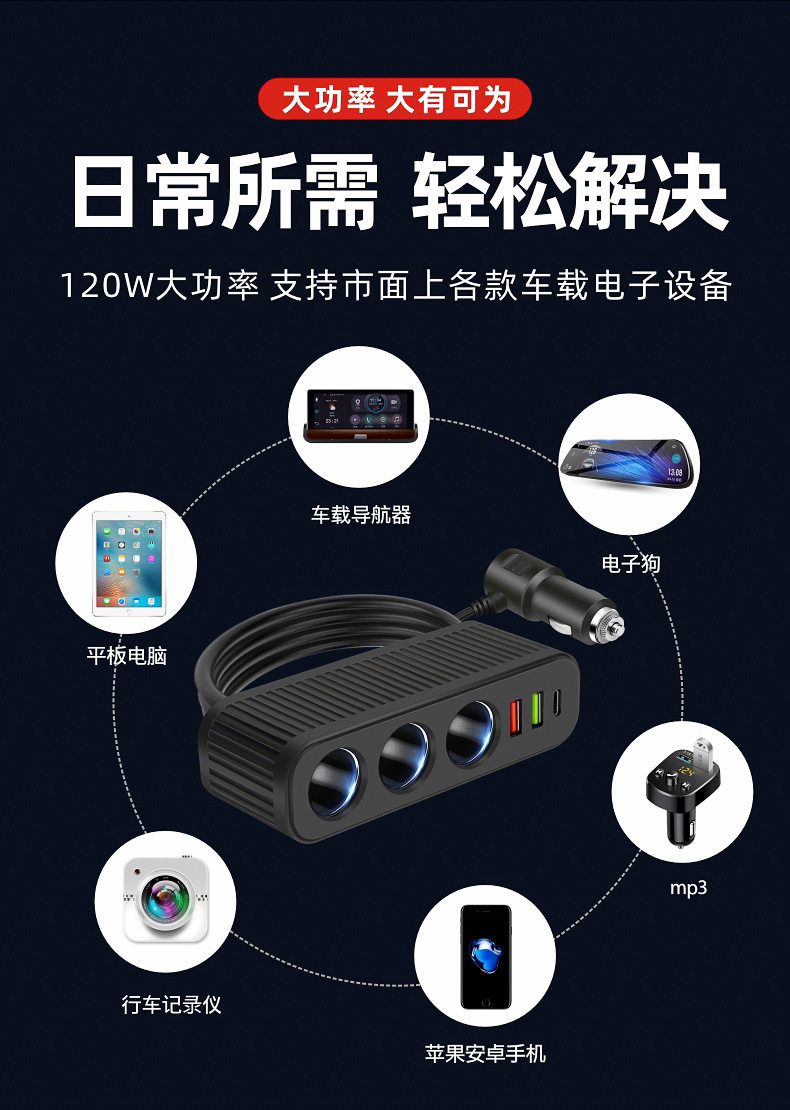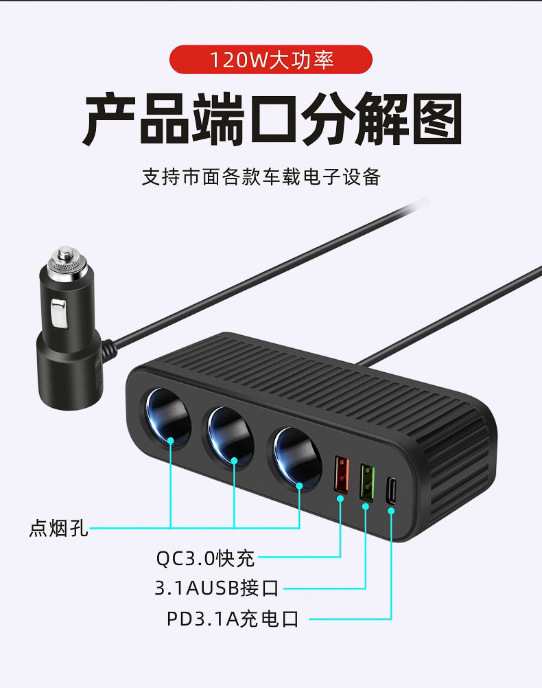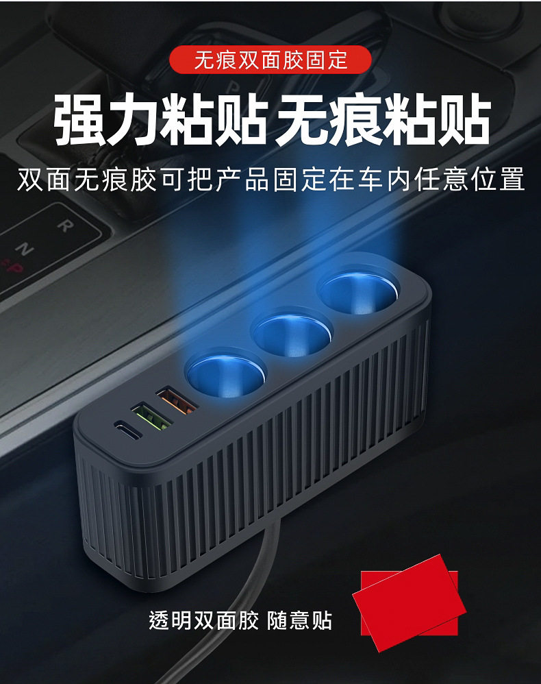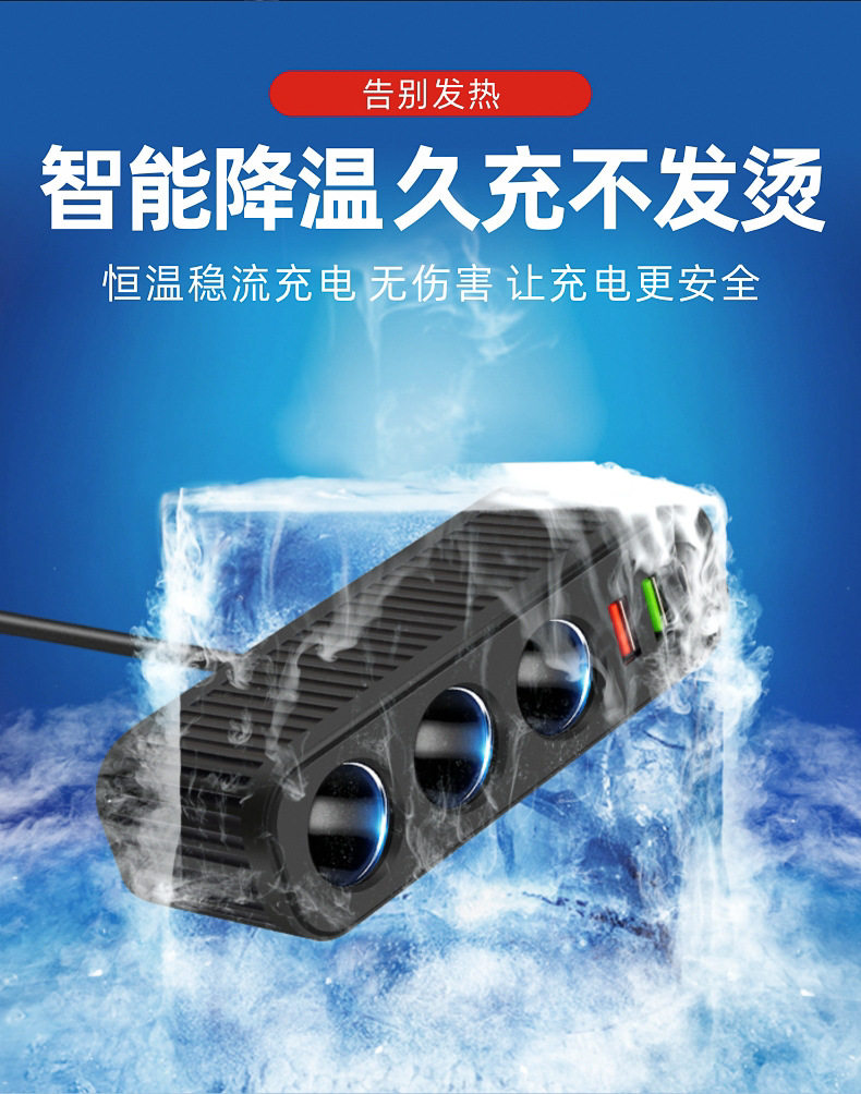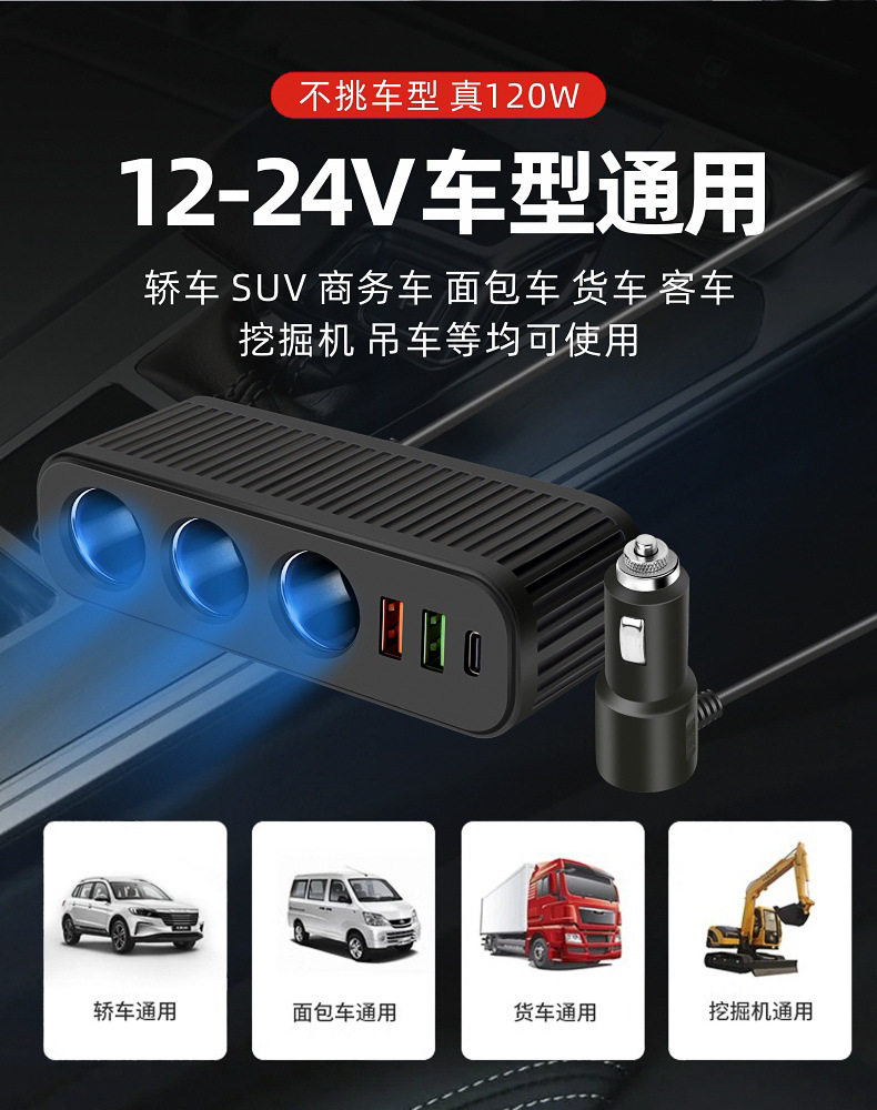 Car charger car charger cigarette lighter one drag three with QC3.0 dual USB PD fast charging interface 12V24V universal