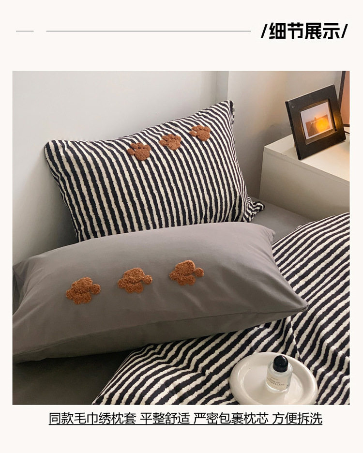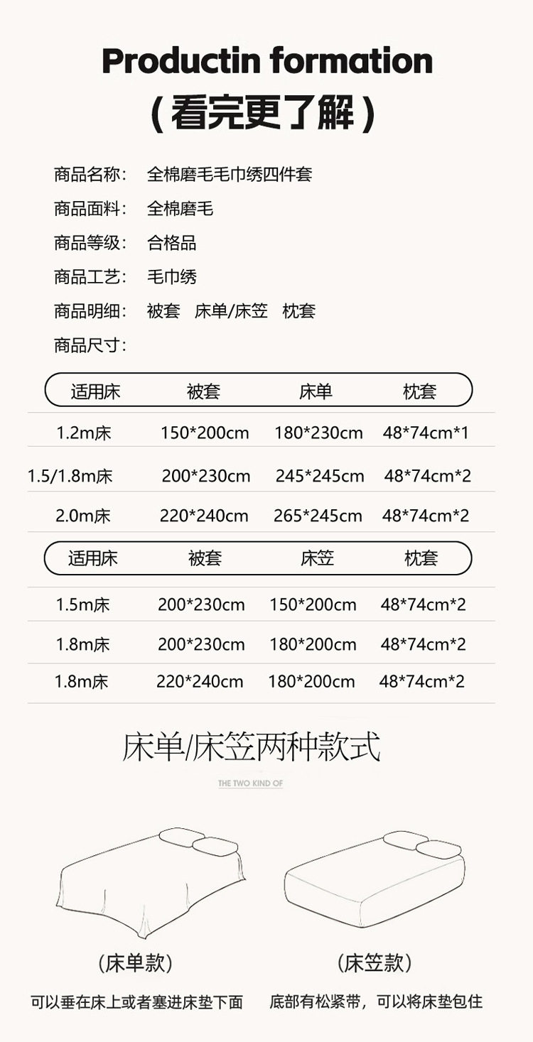 | Size specifications | 1.2m bed sheet three-piece set (applicable to 150*200 quilt core)),1.5m bed sheet four-piece set (applicable to 200*230 quilt core),1.8m bed sheet four-piece set (applicable to 200*230 quilt core),2.0m bed sheet four-piece set (applicable to 220*240 quilt core),1.5m fitted sheet set of four (applicable to 200*230 quilt core),1.8m fitted sheet set of four (applicable to 200*230 quilt core) |