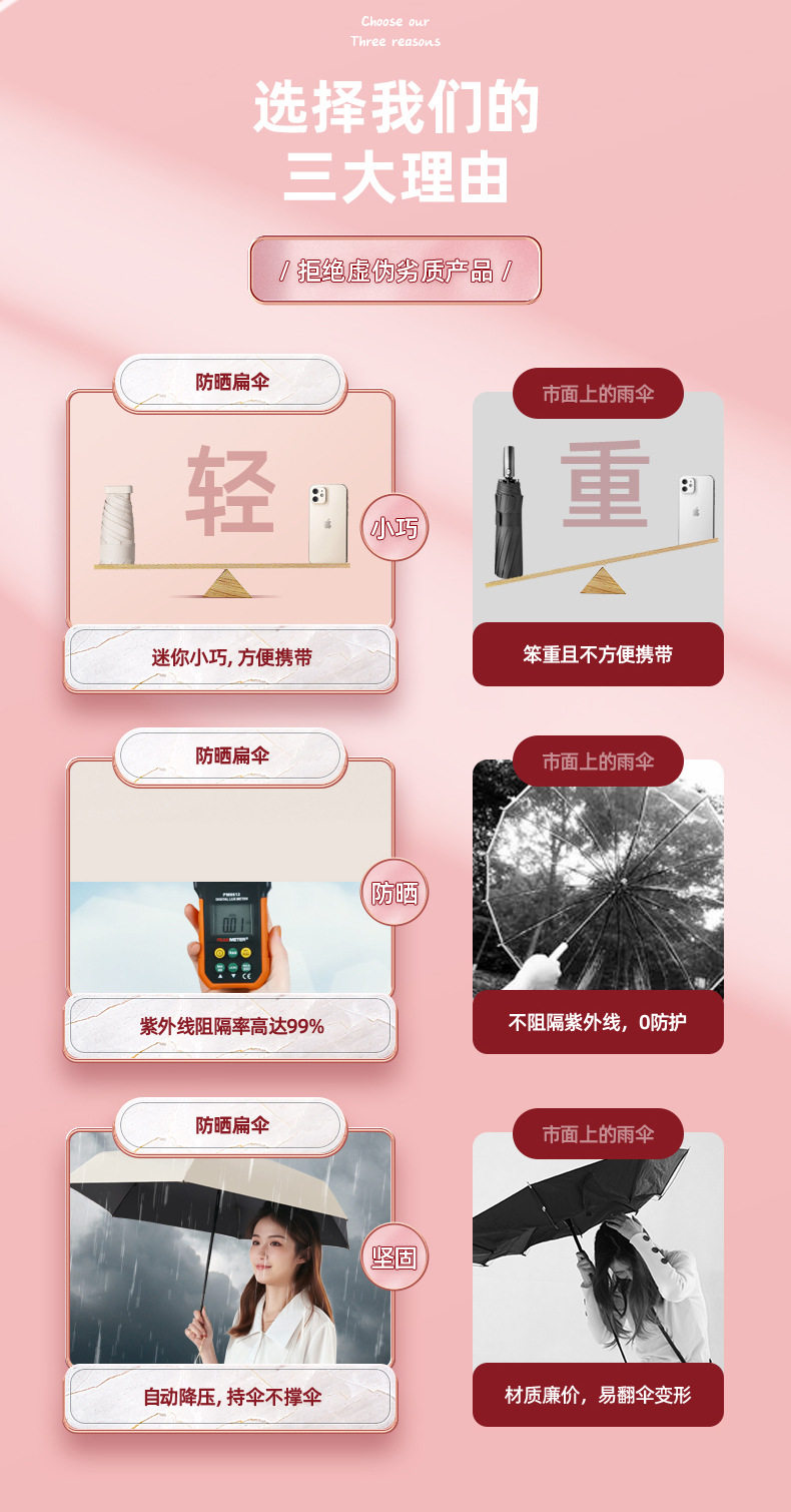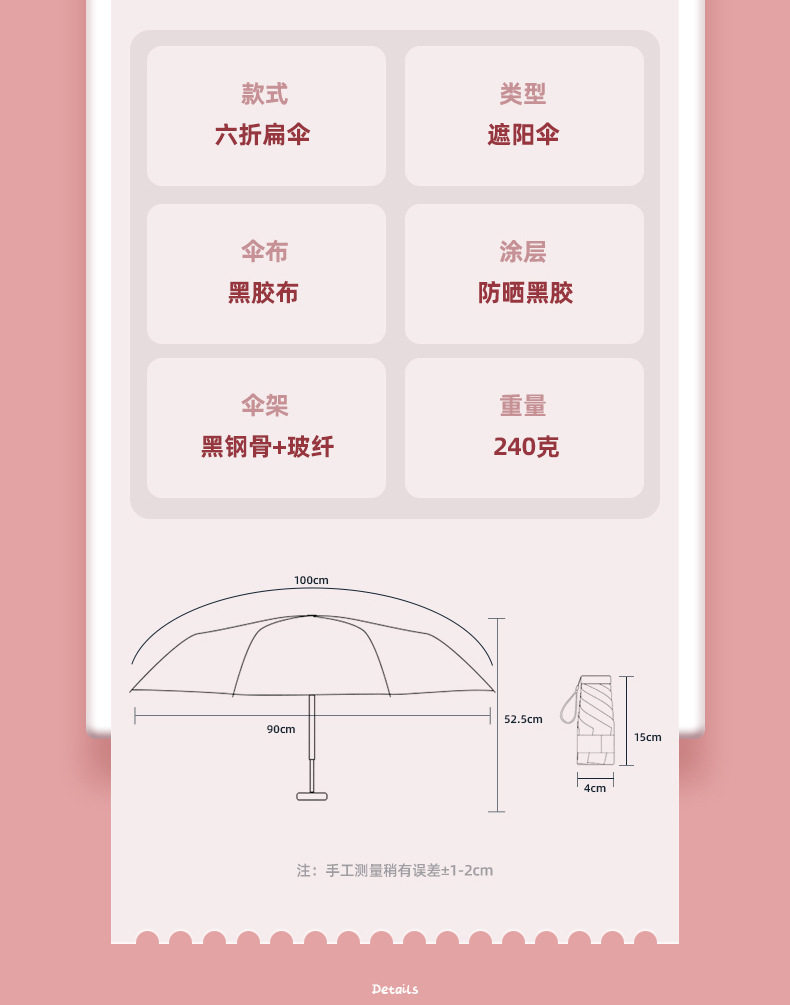 | Color | [ 40% off vinyl sunscreen umbrella] dark green,[ 40% off vinyl sunscreen umbrella] beige,[ 40% off vinyl sunscreen umbrella] light blue,[ 40% off vinyl sunscreen umbrella] taro purple,[ 40% off vinyl sunscreen umbrella] pink,[ 40% off vinyl sunscreen umbrella] medium gray,[ 40% off vinyl sunscreen umbrella] dark purple,[ 40% off vinyl sunscreen umbrella] lavender purple,Wutong rice [ 40% off flat umbrella★Upf50+ professional sunscreen] can be used in rain or shine,Soft mist powder [ 40% off flat umbrella★Upf50+ professional sunscreen] can be used in rain or shine,Lavender purple [ 40% off flat umbrella★Upf50+ professional sunscreen] can be used in rain or shine,Morning fog green [ 40% off flat umbrella★Upf50+ professional sunscreen] can be used in rain or shine,Cloud water blue [ 40% off flat umbrella★Upf50+ professional sunscreen] can be used in rain or shine,Xuantan black [ 40% off flat umbrella★Upf50+ professional sunscreen] can be used in rain or shine,Wutong rice + storage box [ 40% off flat umbrella★Upf50+ professional sunscreen] can be used in rain or shine,Soft mist powder + storage box [ 40% off flat umbrella★Upf50+ professional sunscreen] can be used in rain or shine,Lavender purple + storage box [ 40% off flat umbrella★Upf50+ professional sunscreen] can be used in rain or shine,Morning fog green + storage box [ 40% off flat umbrella★Upf50+ professional sunscreen] can be used in rain or shine,Sky blue + storage box [ 40% off flat umbrella★Upf50+ professional sunscreen] can be used in rain or shine,Xuan tan black + storage box [ 40% off flat umbrella★Upf50+ professional sunscreen] can be used in rain or shine,Wutong rice [upf50+ professional sunscreen] can be used in rain or shine,Wutong rice (6-bone ultra-light mini + can be used in rain or shine + free capsule box),Moonlight white [upf50+ professional sunscreen] can be used in rain or shine,Moonlight white (6-bone ultra-light mini + can be used in rain or shine + free capsule box),Quiet blue [upf50+ professional sunscreen] can be used in rain or shine,Quiet blue (6-bone ultra-light mini + can be used in rain or shine + free capsule box),Misty purple [upf50+ professional sunscreen] can be used in rain or shine,Misty purple (6-bone ultra-light mini + can be used in rain or shine + free capsule box),Midsummer powder [upf50+ professional sunscreen] can be used in rain or shine,Midsummer powder (6-bone ultra-light mini + can be used in rain or shine + free capsule box),Obsidian black [upf50+ professional sunscreen] can be used in rain or shine,Obsidian black (6-bone ultra-light mini + can be used in rain or shine + free capsule box),Dark green [upf50+ professional sunscreen] can be used in rain or shine,Dark green (6-bone ultra-light mini + can be used in rain or shine + free capsule box),Matcha green [upf50+ professional sunscreen] can be used in rain or shine,Matcha green (6-bone ultra-light mini + can be used in rain or shine + free capsule box),Fruit green [upf50+ professional sunscreen] can be used in rain or shine,Fruit green (6-bone ultra-light mini + can be used in rain or shine + free capsule box),Navy blue [upf50+ professional sunscreen] can be used in rain or shine,Navy blue (6-bone ultra-light mini + can be used in rain or shine + free capsule box),Burgundy [upf50+ professional sunscreen] can be used in rain or shine,Burgundy (6-bone ultra-light mini + can be used in rain or shine + free capsule box),[ 40% off oil painting style ultra-light sun protection] white rose,[ 40% off oil painting style ultra-light sun protection] wheatfield cypress tree,[ 40% off oil painting style ultra-light sun protection] butterfly,[ 40% off oil painting style ultra-light sunscreen] pink peony,[ 40% off oil painting style ultra-light sun protection] moon rose,[ 40% off oil painting style ultra-light sun protection] orchid on the other side,[ 50% off pastoral style portable sunscreen] white rose,[ 50% off pastoral style portable sunscreen] wheat field cypress tree,[ 50% off pastoral style portable sunscreen] moon rose,[ 50% off pastoral style portable sunscreen] orchid on the other side,Black 62% off bone reverse umbrella (non-capsule umbrella),Pink 62% off bone reverse umbrella (non-capsule umbrella),Dark green 62% off bone reverse umbrella (non-capsule umbrella),Wutong rice 62% off bone reverse umbrella (non-capsule umbrella) |