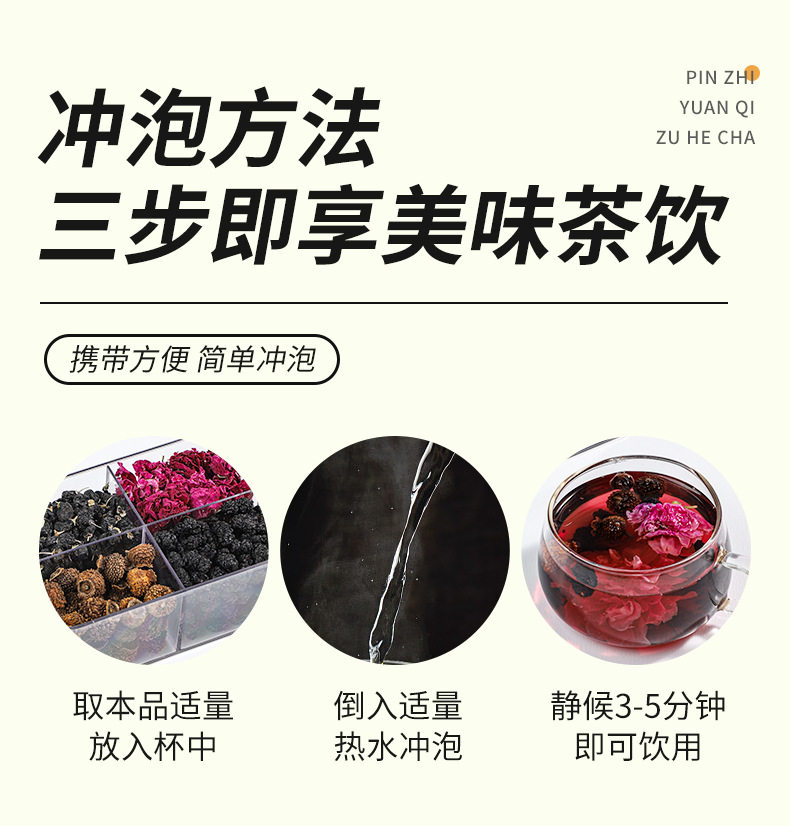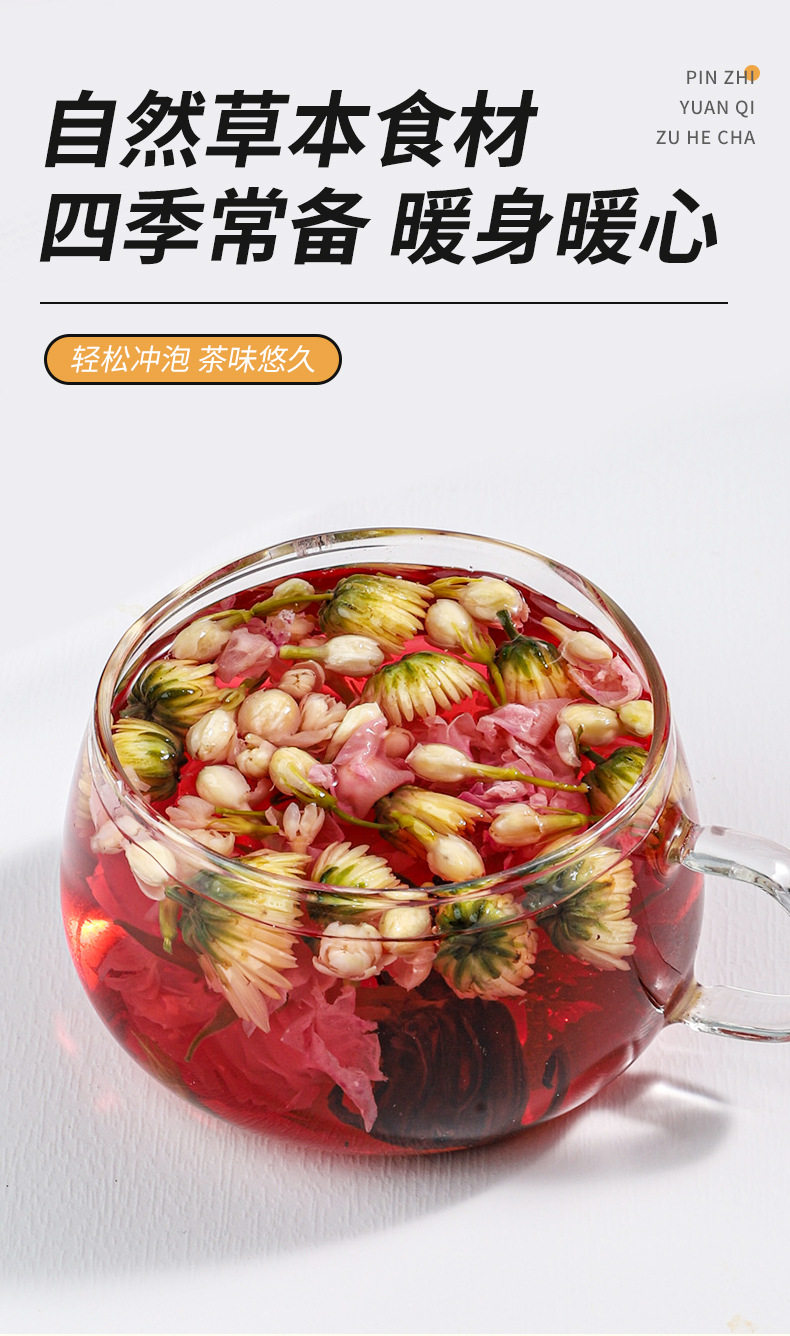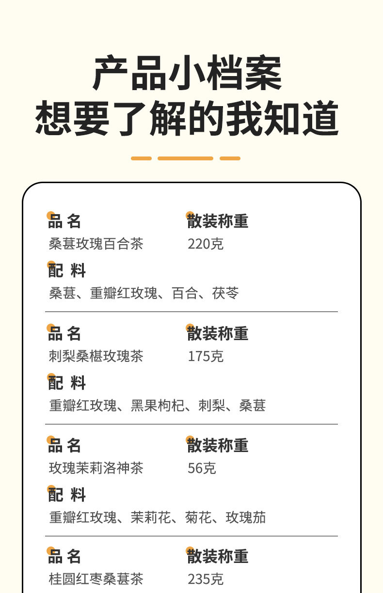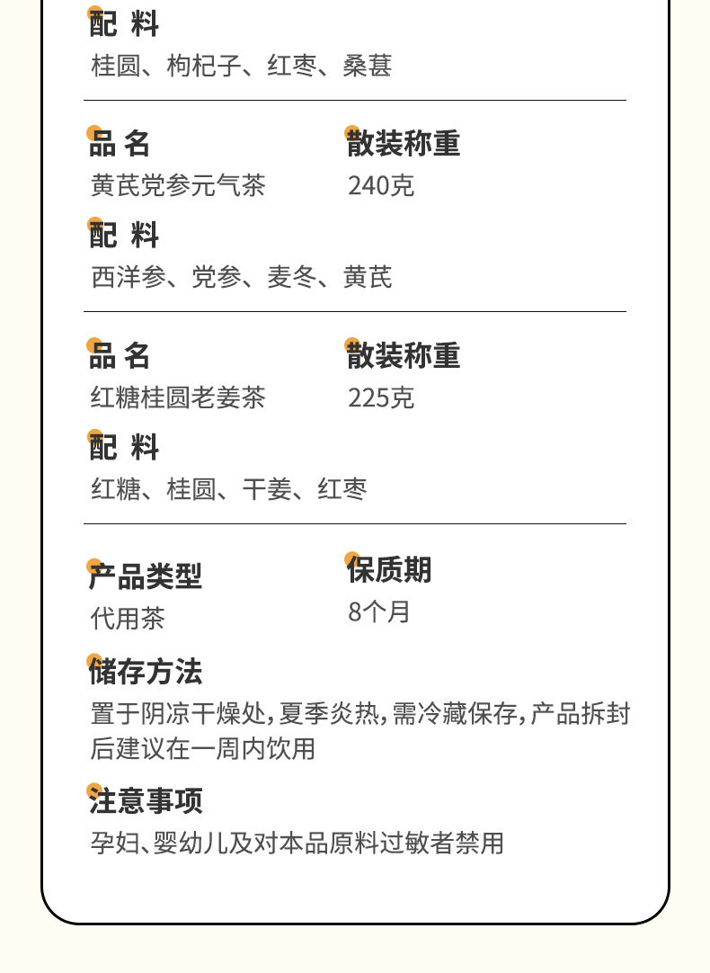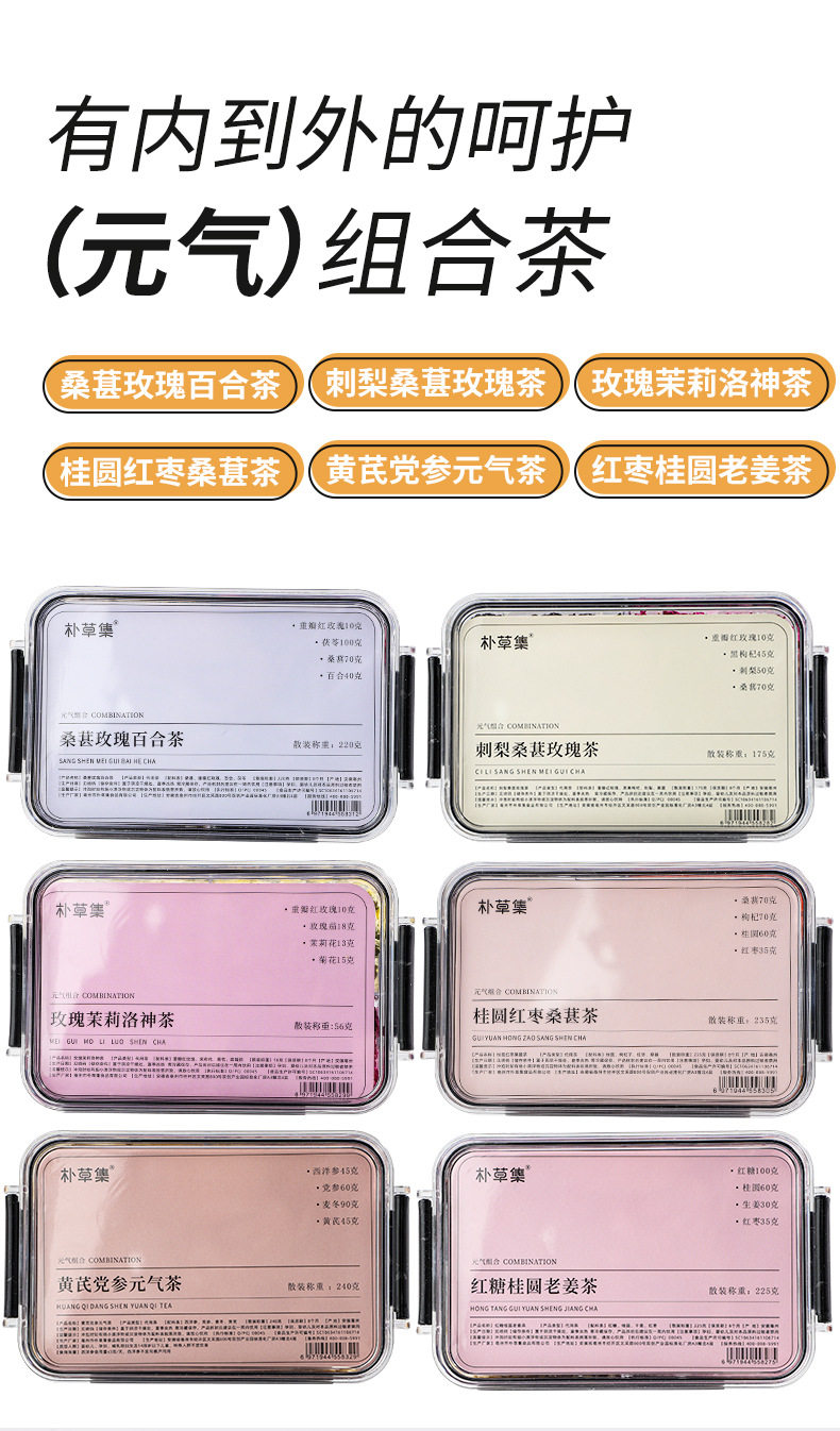 | Packaging specifications | Mulberry rose lily tea 220g,Prickly pear mulberry rose tea 175g,Rose jasmine roselle tea 56g,Longan, red dates and mulberry tea 235g,Astragalus codonopsis vitality tea 240g,Brown sugar longan ginger tea 225g |