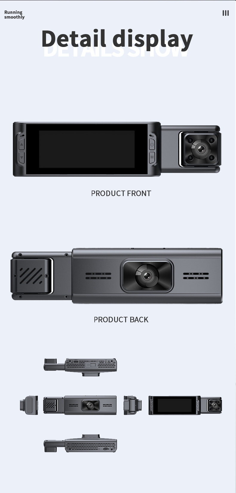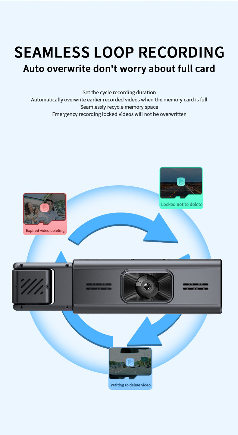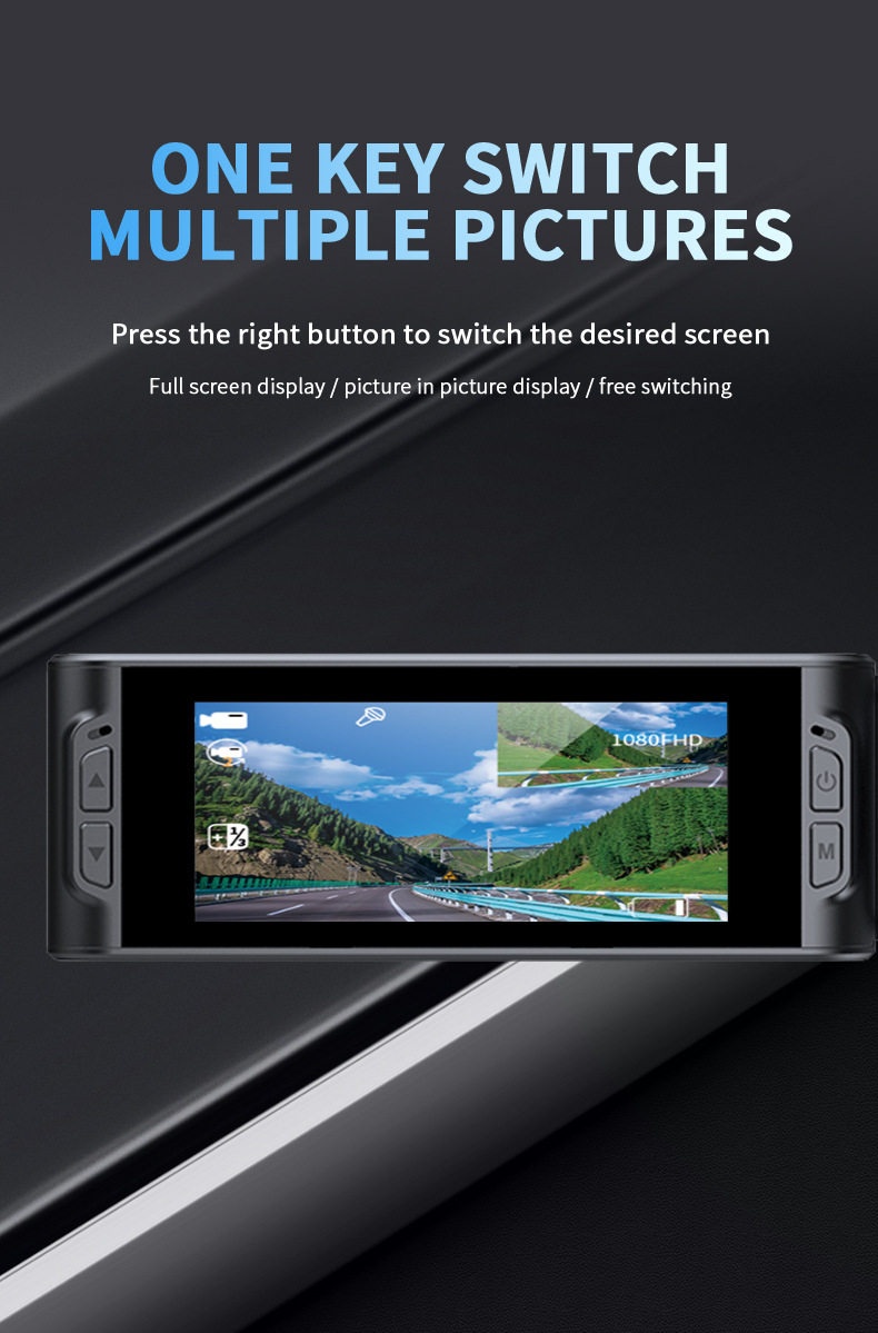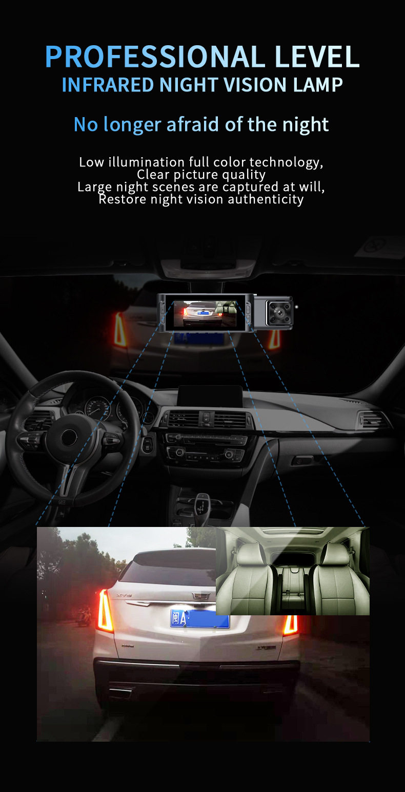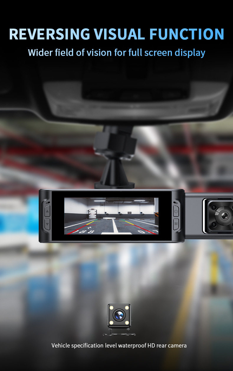 | Function | Reversing image,Mobile detection,Loop recording,Parking monitoring,Night vision fill light,Front and rear recording |