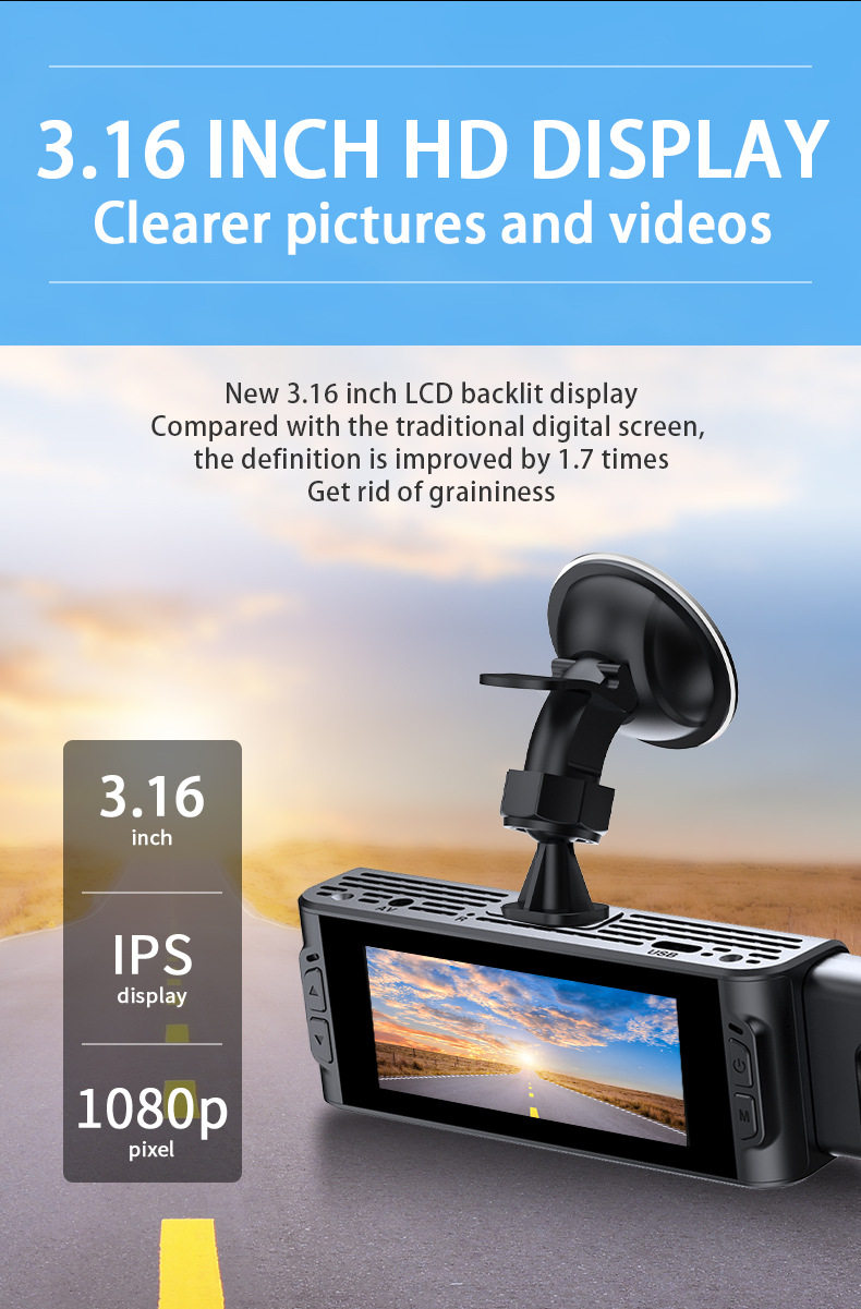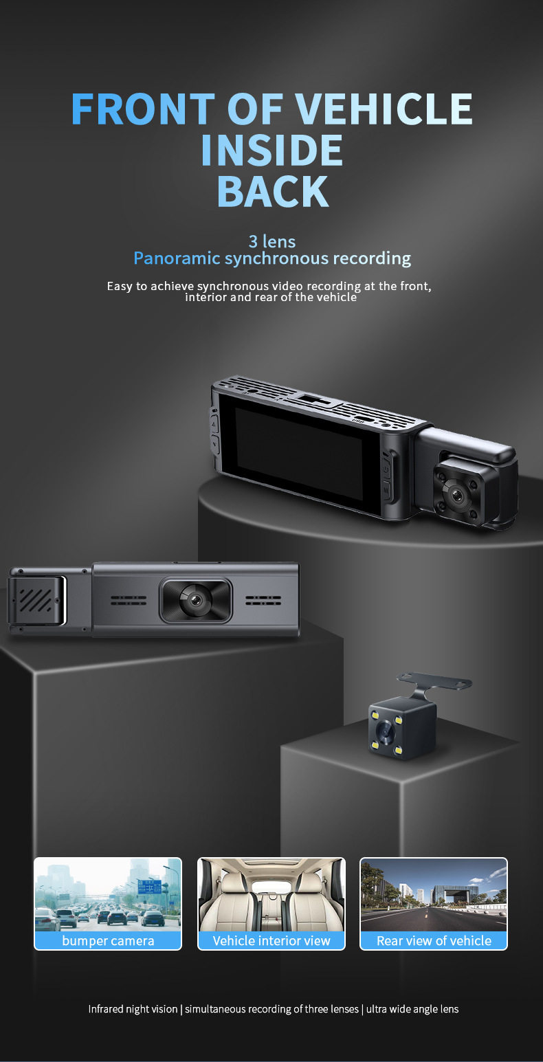 | Color classification | 3.16inch wifi three recordings [front + car + rear car],3.16inch wifi three recordings [front + car + rear car] + memory card 32g,3.16inch wifi three recordings [front + car + rear car] + memory card 64g,3.16inch wifi three recordings [front + car + rear car] + memory card 128g,3.16inch wifi dual recording [front + interior],3.16inch wifi dual recording [front car + interior] + memory card 32g,3.16inch wifi dual recording [front of car + inside the car] + memory card 64g,3.16inch wifi dual recording [front car + interior] + memory card 128g |