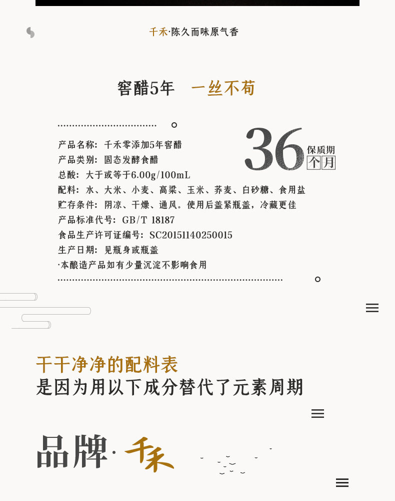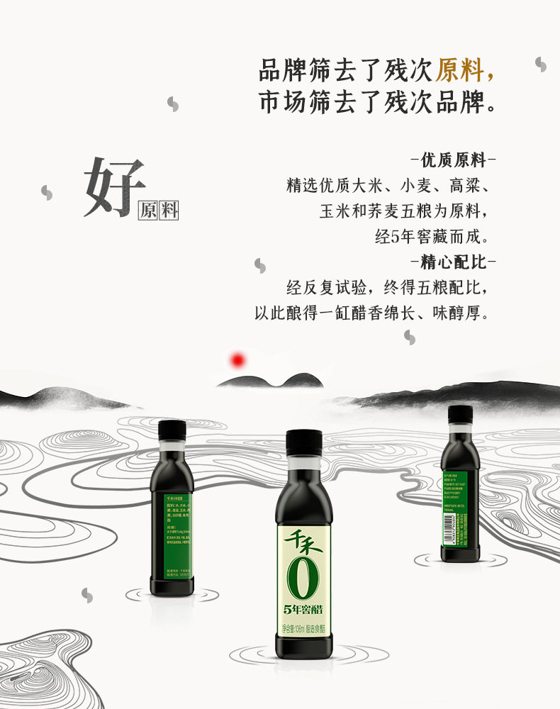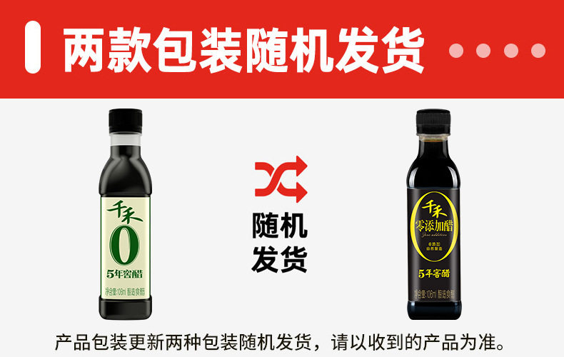 | Packaging specifications | Qianhe ling adds 3 years of germanium vinegar 106ml (pet bottle) + qianhe yuzang ben brewed 180 days soy sauce 106ml,Qianhe ling adds 3 years of germanium vinegar 106ml (pet bottle),Qianhe yuzang ben brewed 180 days soy sauce 106ml,[three bottles are affordable] qianhe ling adds 3 years of hydroidery 106ml (pet bottle) *3,[three bottles of affordable pack] qianhe yuzang dacheng 180-day soy sauce 106ml*3,[full box of 60 bottles] qianhe ling adds 3 years of hydroidery 106ml (pet bottle),Qianhe ling adds 3 years of germanium vinegar 500ml*2,Qianhe ling adds 3 years of germanium vinegar 1l*2,[full box of 12 bottles] qianhe ling adds 3 years of centipede vinegar 500ml,[full box of 12 bottles] qianhe ling adds 3 years of vinegar 1l |