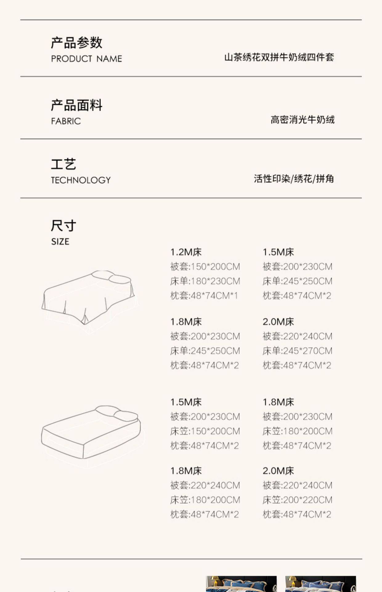 | Size specifications | 0.9m dormitory bed sheet three-piece set [suitable for 150x200cm quilt core],1.2m bed sheet three-piece set [suitable for 150x200cm quilt core],1.5m bed sheet four-piece set [suitable for 200x230cm quilt core],1.8m bed sheet four-piece set [suitable for 200x230cm quilt core],2.0m bed sheet four-piece set [suitable for 220x240cm quilt core],1.5m fitted sheet set of four [suitable for 200x230cm quilt core],1.8m fitted sheet set of four [suitable for 200x230cm quilt core],1.8m enlarged fitted sheet set of four [suitable for 220x240cm quilt core] |