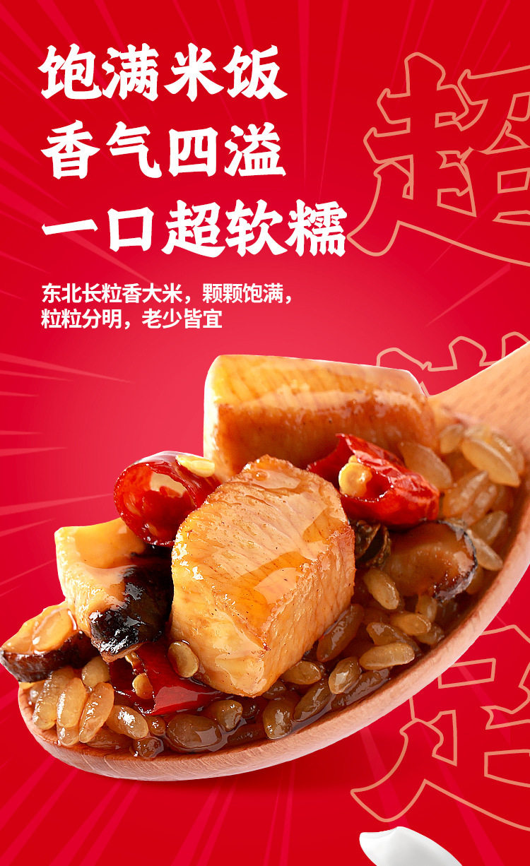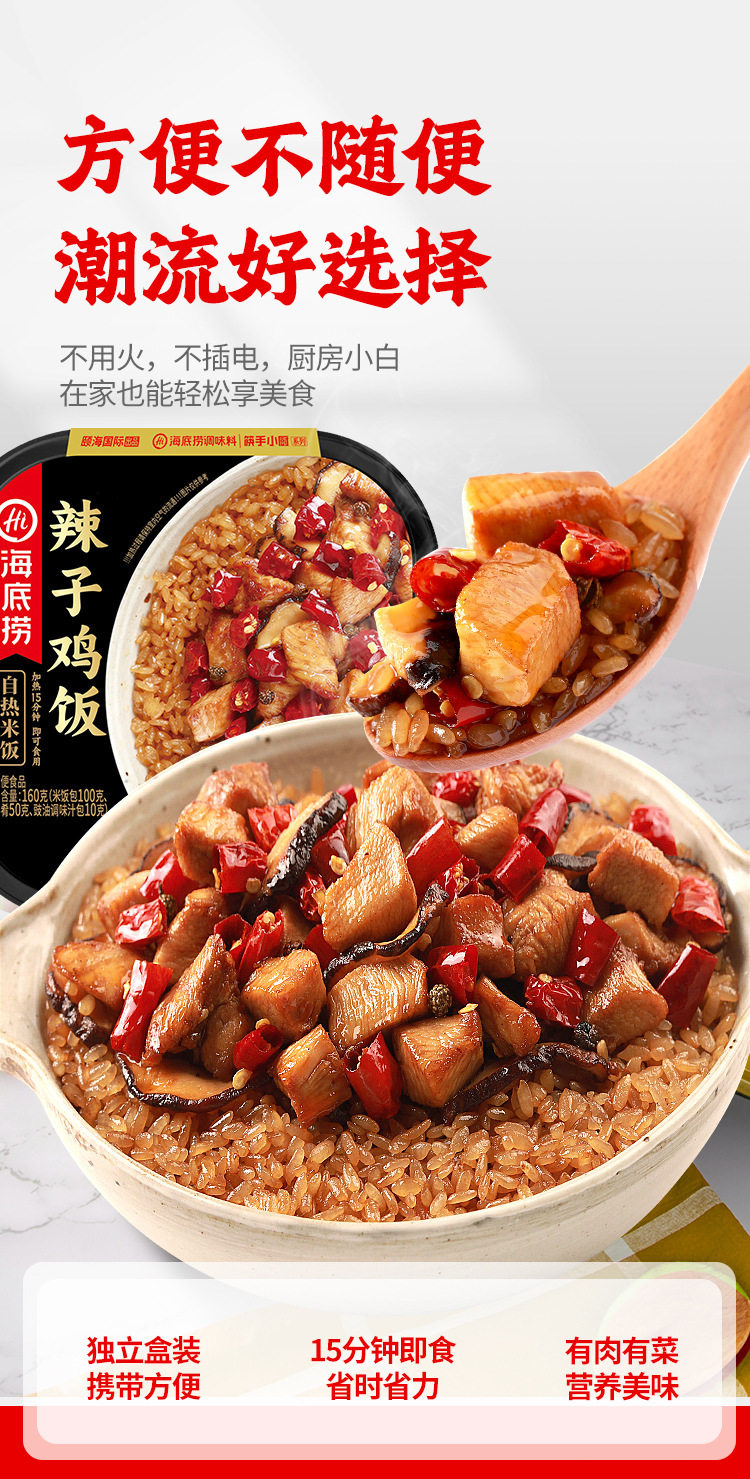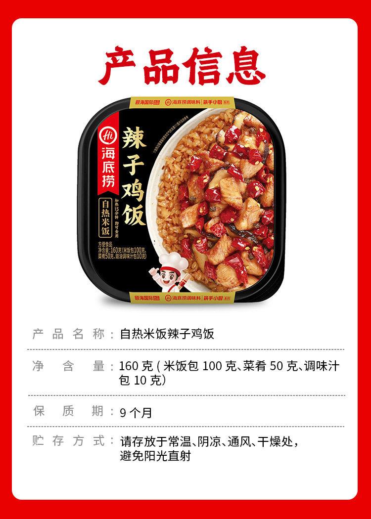| Packaging specifications | Spicy chicken self-heating rice 175g,Fish-flavored shredded self-heating rice 187g,Burnt chicken self-heating rice 181g,Braised chicken self-heating rice 187g,Mushroom beef self-heating rice 165g,Tomato beef brisket self-heating rice 272g,Self-heating rice with pickled vegetables 192g,Cantonese clay pot self-heating rice 187g,Curry beef convenient rice 272g,Roast beef convenient rice 272g |
