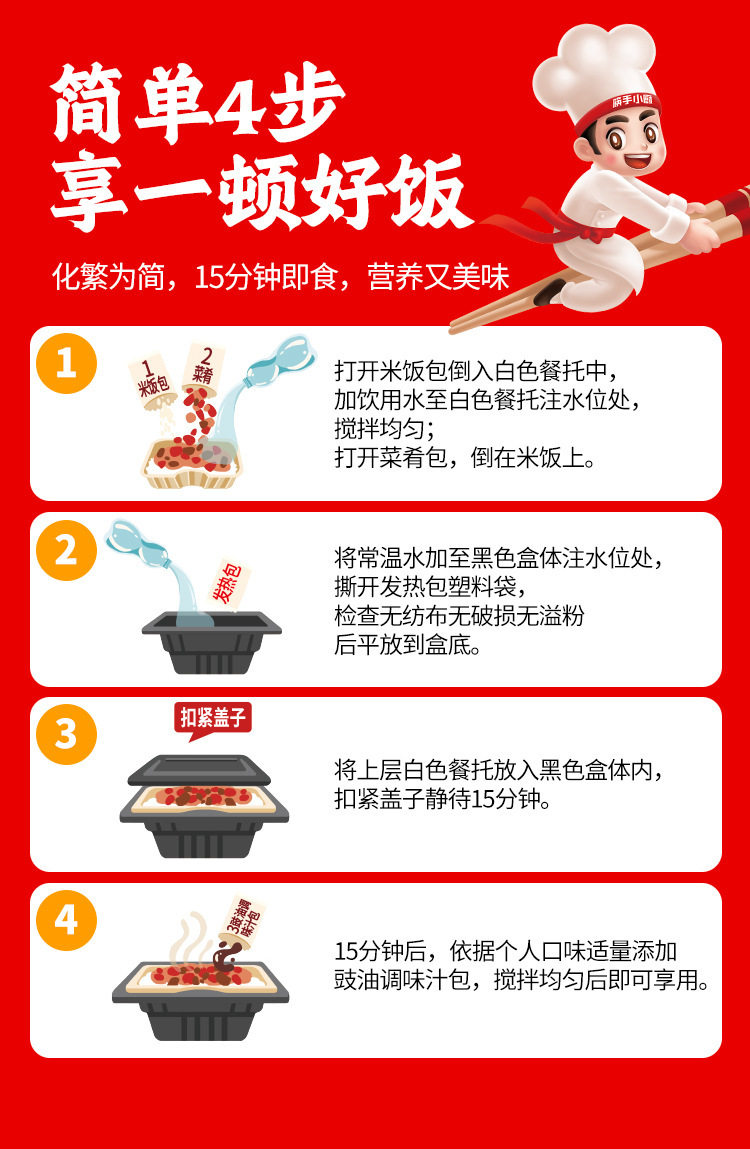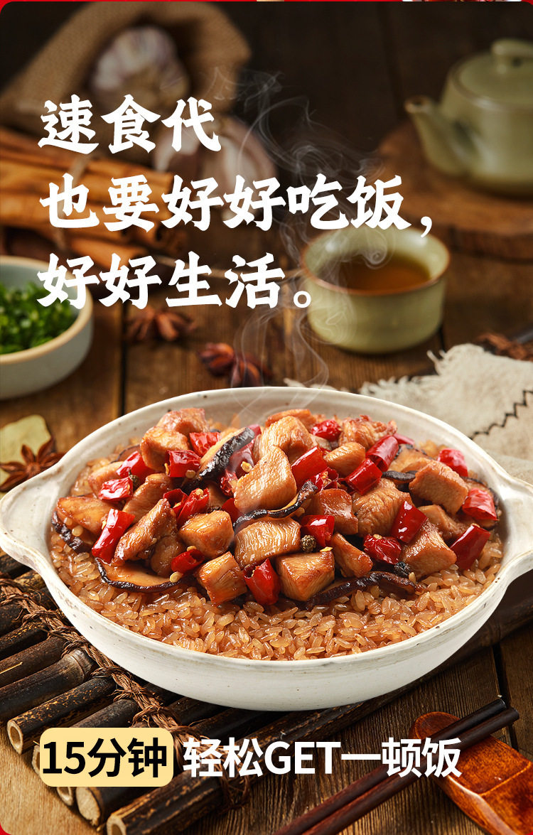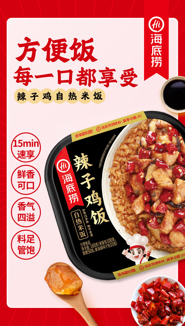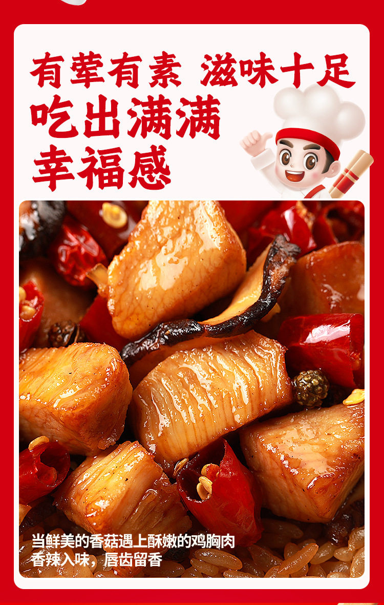 | Packaging specifications | Spicy chicken self-heating rice 175g,Fish-flavored shredded self-heating rice 187g,Burnt chicken self-heating rice 181g,Braised chicken self-heating rice 187g,Mushroom beef self-heating rice 165g,Tomato beef brisket self-heating rice 272g,Self-heating rice with pickled vegetables 192g,Cantonese clay pot self-heating rice 187g,Curry beef convenient rice 272g,Roast beef convenient rice 272g |