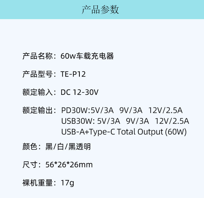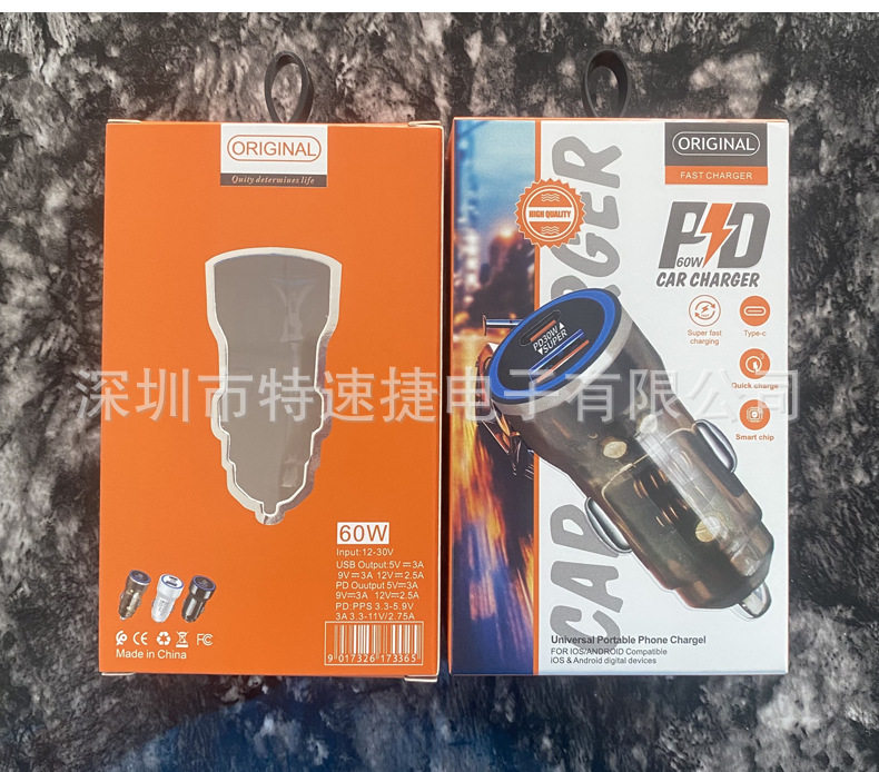 | Feature 2 | Transparent 60w super fast charging car charger |