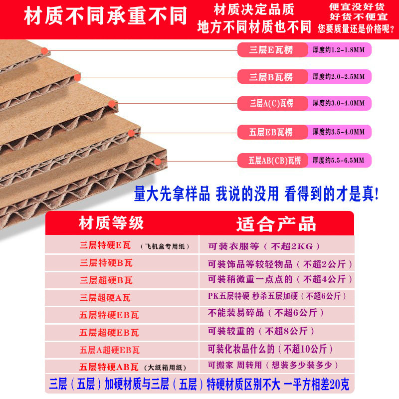 | Material hardness level | Three layers of extra hard b tile (blank),Three layers of hardened b tile (blank),Five layers of super hard cb tile (blank),Three-layer a-grade extra-hard corrugated cardboard (with lettering),Five-layer a super-hard eb tile (with words),Five layers of extra hard eb tile (blank),Three-layer a super-hard b tile (with words),Five layers of hardened eb tile (blank) |